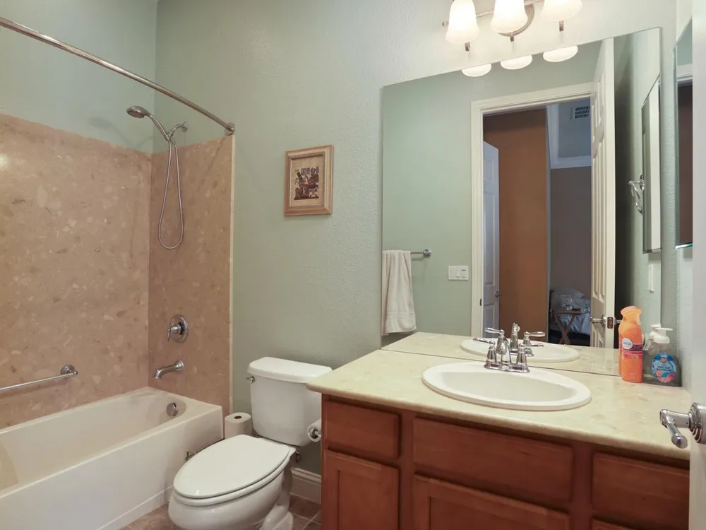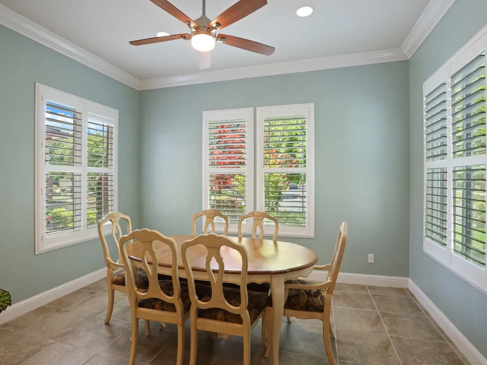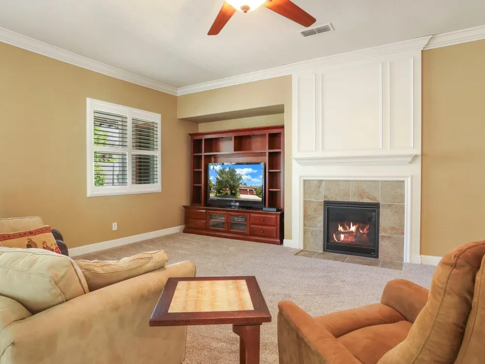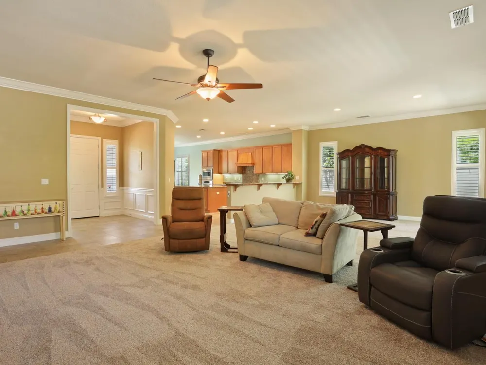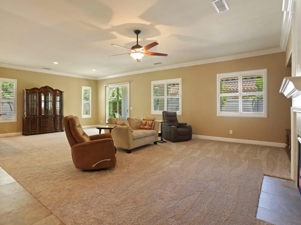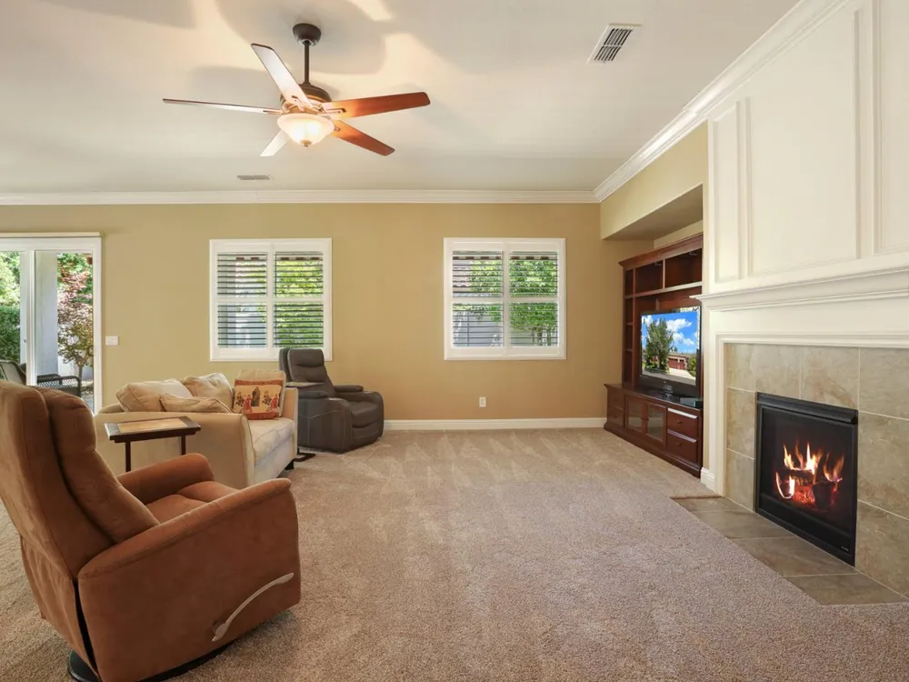 Welcome to this meticulously maintained 2,635 square feet, 3 bedroom, 2 1/2 bath Bedford floor plan located in the vibrant 55+ community of Del Webb Woodbridge in Manteca. This community is made for active seniors who want the social life and amenities of a gym, swimming pool, ballfield, line dancing classes and so many more activities! This home offers thoughtful design, quality upgrades, and an exceptional lifestyle. Curb appeal shines with brick veneer accents, a spacious 3-car garage, and a large front patio perfect for morning coffee or evening chats. Step inside to a bright and open layout featuring a den, plantation shutters, abundant natural light, and a cozy fireplace in the great room. The kitchen is a chef's dream with granite countertops, a large center island with bar seating, stainless steel appliances, and a dedicated dining area ideal for entertaining. The laundry room offers added convenience with upper/lower cabinets and a sink. Retreat to the spacious main bedroom with a charming bay window and ensuite featuring a luxurious roll-in shower, dual water closets, and generous storage. The backyard is great for relaxing underneath your covered patio with ceiling fan, surrounded by lush landscaping and the calming sound of a pond waterfall! This one has it all!