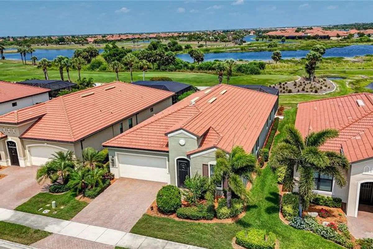 If you ever wanted to live on a golf course, then this home is just perfect for you! Located in the Golf Village of Sarasota National, this WCI built home has a spectacular water and golf course view with beautiful sunrises giving you one of the best vistas in the community! Situated just off the 9th tee, this 3 bedroom, 3.5 bath open concept Key Largo floorplan has 2,386 sq ft of stunning features. The home is being offered with most furniture, and features many desired upgrades showing 10 foot ceilings, 8 foot doorways, screened front entry, custom plank ceramic floor tile, ceiling fans, custom plantation shutters, an alarm system, and crown molding is featured throughout most of the home. The gourmet kitchen has a beautiful free-standing island with granite countertops, gorgeous cabinets, upgraded decorative tile backsplash, a coffee nook, and a large walk-in pantry. Conveniently located near the kitchen is the home's half bath. The Great room enjoys a gorgeously decorated tray ceiling, a cozy dining area, and sliding glass doors that open to a large, covered lanai. Fully opening the sliding glass doors offers the perfect entertaining space provided by the Kitchen, Great Room, and Lanai combination. This home has the perfect outdoor space for friends and family featuring a custom heated saltwater pool, complete with a travertine pool deck, and a custom outdoor kitchen. To complete the outdoor space, the lanai is equipped with a remotely operated Storm Smart hurricane screen and elegant shiplap planking installed on the lanai ceiling. The Primary Bedroom suite offers beautiful water views, a massive closet, and an Ensuite bath with two separate sinks, and a luxurious walk-in tiled shower. You and your guests will love the privacy afforded with the two guest bedroom ensuites, on the opposite side of the home. The den has custom sliding doors that add a unique touch to the home’s décor. The den also boasts a custom installed business center! Even better is this home has a new air conditioning system! The 2 car garage is outfitted with an epoxy floor coating. Further, this home includes 2 bundled Golf Memberships. Sarasota National is one of the Venice area’s most sought-after communities with a 30,000 sq. ft. clubhouse, spectacular zero entry resort style pool with spa and lap pool. Enjoy casual dining at the Tiki bar, fine dining at the Palm Club, a 7,000 sq. ft. fitness center with classes, personal trainers, and day spa, pickle ball, lighted tennis courts, bocce ball, coffee house, 18-holes of championship golf, and a magnificent 19th hole restaurant. Sarasota National is also a Silver rated Audubon Bird Sanctuary with more than half of the community being designated as a preserve. Sarasota National is less than 15 minutes from historic downtown Venice, shopping, and world-class beaches. Come and see how you can live like you’re on vacation every day!