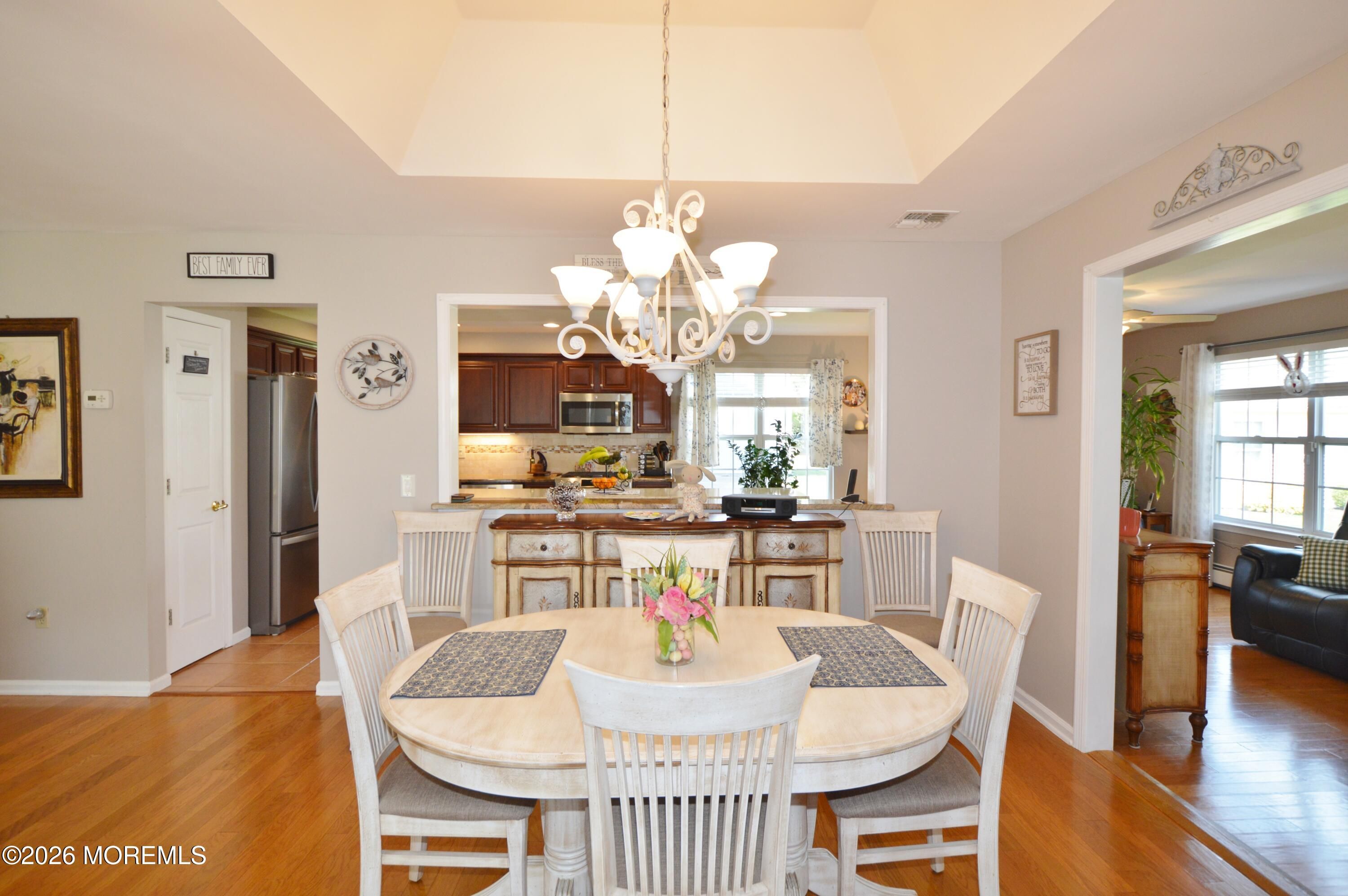HOME SWEET HOME is what you will call this IMMACULATE EXPANDED DEVON in the HIGHLY DESIRED LAKE RIDGE 55 PLUS ACTIVE ADULT COMMUNITY ~ BRAND NEW ROOF, GUTTERS AND LEADERS (Complete tear off Aug 2025) ~ The Hot Water Baseboard Heat is a HUGE MONEY SAVER ~ UPDATED KITCHEN with Beautifully Refaced Cabinets and a BONUS OVERSIZED CENTER ISLAND WITH SEATING which is perfect for entertaining, Granite Countertops, Tile Backsplash, Recessed Lights, Tile Floors. ''Crank Out'' window over the sink PLUS A BONUS ''CUT OUT'' to the Dining Room ~ Adjacent EXPANDED FAMILY ROOM with HARDWOOD FLOORS, Ceiling Fan and ANOTHER BONUS 'CUT OUT'' to the Dining Room and a door to the OVERSIZED REAR PATIO ~ Living Room/Dining Room Combo has beautiful HARDWOOD FLOORS and plenty of space for large gatherings. Primary Suite has Cathedral Ceilings, a Newer Window front window that has Custom Stained Glass on the Palladian Window and a Bench Seat, ceiling fan, TWO WALK IN CLOSETS and an ENSUITE BATH WITH A COMFORT HEIGHT VANITY, Garden Soaking Tub and a Stall Shower ~ Guest Bedroom with a Ceiling Fan and a Double Closet ~ Guest Bath with a tub ~ Laundry Room with a BONUS Utility Sink and the DIRECT ENTRY Two Car Garage has a Custom Built In Cabinets and work area plus EXTRA STORAGE CABINETS AND PULL DOWN STAIRS FOR ADDITIONAL ATTIC STORAGE ~ Highly Desired Lake Ridge is a Gated Active Adult Community which offers LOW HOA FEES, LOW TAXES, a heated indoor pool which is open all year, an outdoor pool, a fitness center, tennis and pickleball courts, mat yoga and chair yoga, bowling, bridge, bocce, dance, mahjongg, card rooms, billiards room, social room, library, community bus for shopping, many social clubs, multiday travel club, so much more and something for everyone. TRULY A MUST SEE HOME. COME JOIN US AND HAVE FUN! Don't miss out!