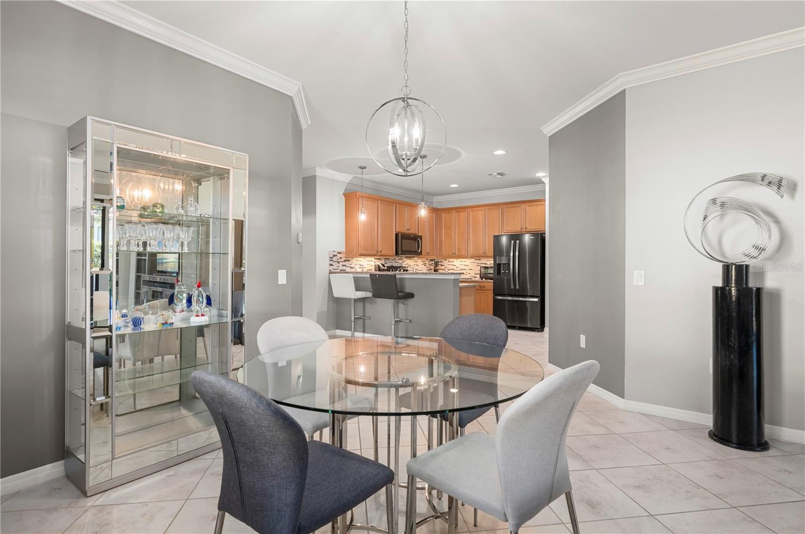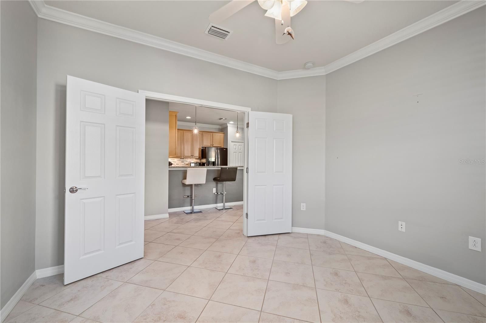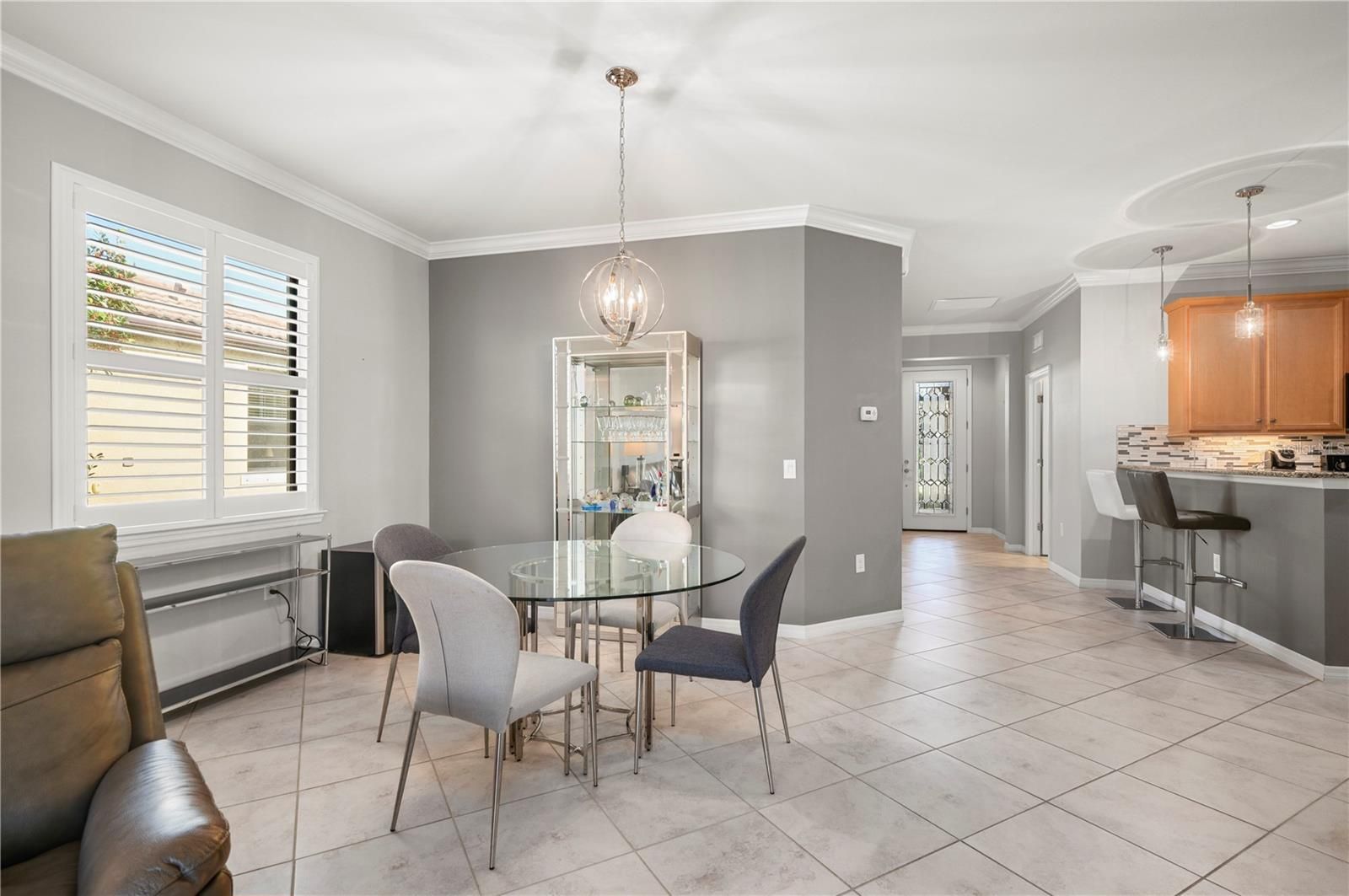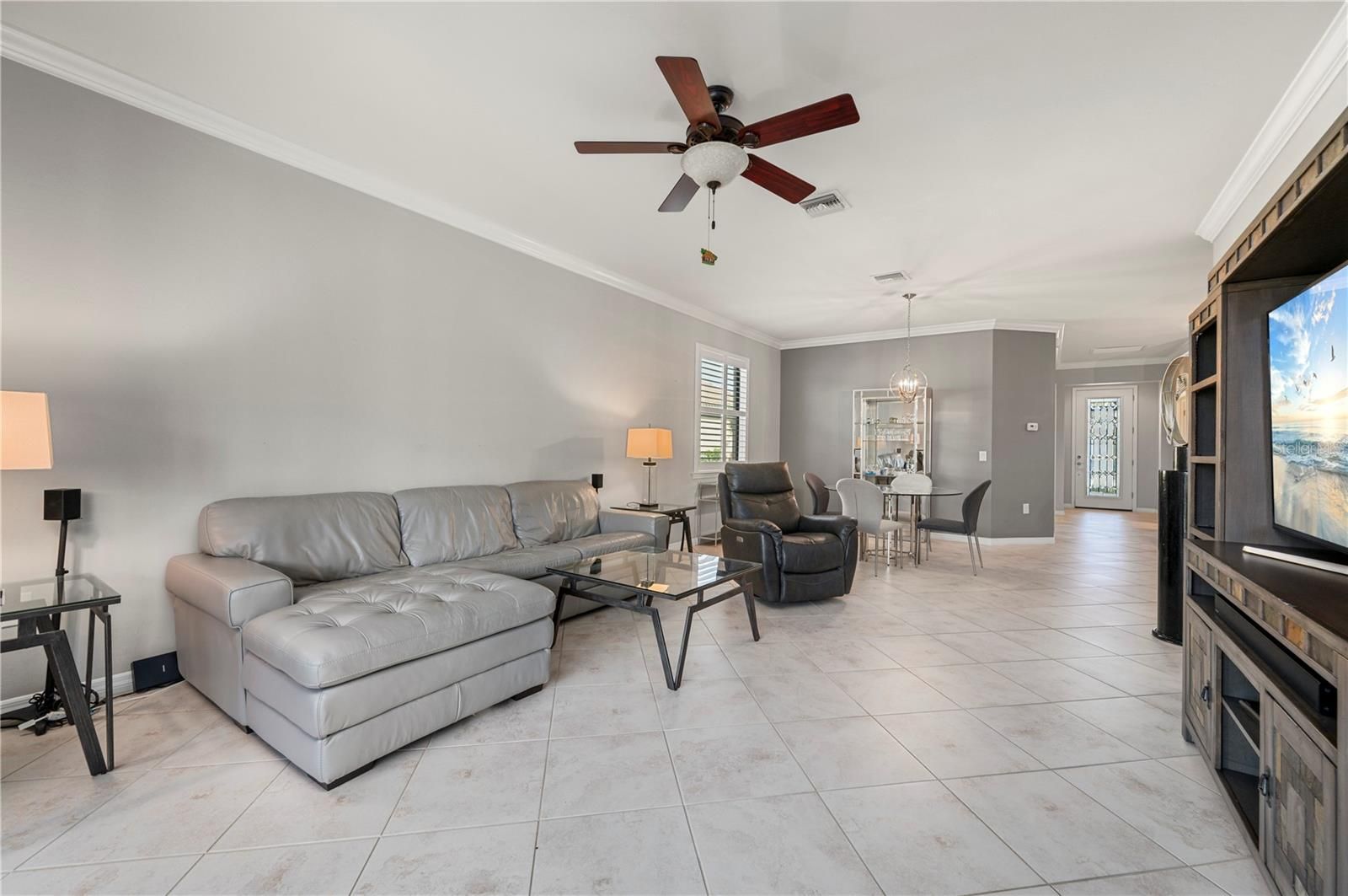 - Ceiling Fan(s), Crown Molding, Eat-in Kitchen, High Ceilings, Living/Dining Room