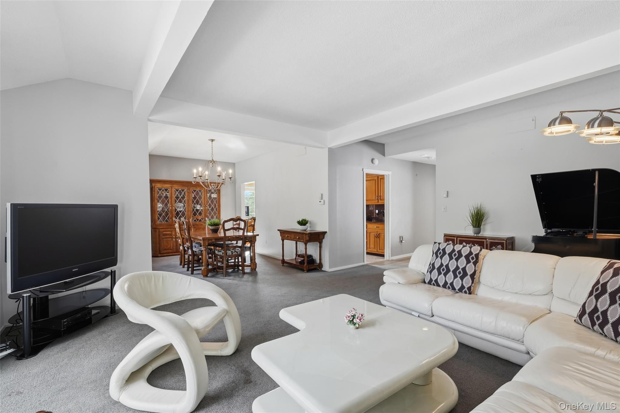 Beautiful three-bedroom, two-bath Jefferson II end unit offering 1,689 sq ft of true one-level living, with interior stairs leading to an oversized two-car garage and a versatile lower-level bonus area. Attached on only one side, this home provides added privacy and a highly desirable layout. The main level features three bedrooms, two full baths, an eat-in kitchen, formal living and dining rooms, and a dedicated laundry area. The spacious primary bedroom offers excellent closet space and an updated ensuite bath with two large closets, a dressing area, and newly renovated walk-in shower. The second bedroom includes custom built-in bookshelves, while the third bedroom is generously sized for guests or ideal as a home office. The hall bath features custom tiled walls, a walk-in shower, and a granite countertop. The inviting eat-in kitchen is appointed with granite countertops, a bar sink, oak cabinetry, and stainless-steel appliances. The formal living room offers wall-to-wall carpeting and sliding doors that open to an expanded, oversized deck—an ideal setting for outdoor dining, entertaining, or simply enjoying the peaceful surroundings. A formal dining room sits just off the main living area, creating an easy flow for gatherings. The lower level provides additional finished space perfect for a den, office, or hobby room, along with laundry hook-up and a large storage area. Residents enjoy a resort-style lifestyle with access to multiple pools, tennis and pickleball courts, fitness, and activity centers, 24-hour security with EMS, shuttle service to the train and shopping, and close proximity to dining, golf, and top-rated schools. Updates & Improvements: Primary bathtub-to-shower conversion (2024). Boiler and A/C unit (2019). Deck extension (1999). Basement use designation for laundry and storage (1985). Furniture can remain, if the buyer is interested. Must own the unit for two years before renting out. New buyer capital contribution fee: $1,500 to Society at closing. HOA: $1,023.45 total = (Condo 8: $764.96) + (Society: $258.49). Taxes without Basic STAR exemption: $1,447.22
