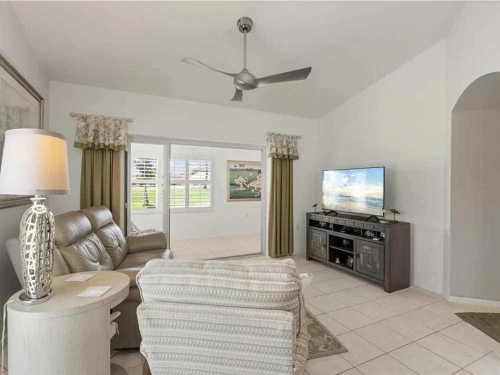 One or more photo(s) has been virtually staged. VERY LARGE home at the end of a cul-de-sac with gorgeous view of pond that splits holes 7 & 8 in the gated golf course/active resort of highly desirable Kings Gate, a 55+ community that is NOT in a flood zone and DOES NOT require flood insurance. Tons of updates to this home including 2023 Roof, 2022 AC, 2024 HWH, large bonus room addition - great as a 2nd TV room, bar, entertainment space - whatever fits your lifestyle. Kitchen has been updated as well and features gorgeous Quartz counters with SS appliances. A paver patio out back, plantation shutters and a thermaseal in attic are a few more of the many updates here. Ideal location inside of Kings Gate on a very quiet cul-de-sac street and with nice curb appeal. Step inside the screened entry way and then into the house and you'll notice the large living room/dining room combo that leads out to the lanai - with the gorgeous pond/golf course view just beyond. The VERY SPACIOUS kitchen features an eat-in area and connects seamlessly with the family room that also leads out to that lanai and view. That lanai connects to the bonus room as does the master bedroom. This very spacious bonus rooms features AWESOME views of the pond & golf course and offers access to the paver patio. WOW - so many places to entertain and/or relax here. The master bedroom features his/her closets and a master bath that has separate tub & shower and dual vanities. Guest wing is at the front right of the home and has a built in wall/murphy bed in one of the rooms and sensational built in office in the other. And if you haven't been to Kings Gate before - you're going to love the options for activity (Olympic size heated swimming pool and spa, tennis courts, pickle ball, lawn bowling, shuffle board, bocce, horseshoes, gym, billiards, library, euchre, bingo, bridge, Texas hold em, poker, mahjong and more). The onsite AND NEWLY REMODELED Lions Den restaurant and bar is super convenient and also offers Tuesday night Karaoke and monthly trivia contests. Many residents love the fact that they are just a golf cart ride away from the shopping plaza that provides you access to grocery store (ALDI), drug store, bank, restaurants and shopping. Want to explore outside of Kings Gate – you are minutes away from the restaurants and shops of downtown Punta Gorda and Fisherman's village. And if you want to explore more of Florida's fun spots you’re near I75 to quickly head north or south. An AWESOME home with TONS OF UPDATES and a SENSATIONAL view in a PREMIER gated community that DOES NOT REQUIRE FLOOD INSURANCE needs to be on your list. Call today for a private showing and a golf cart tour of the community/amenities.
