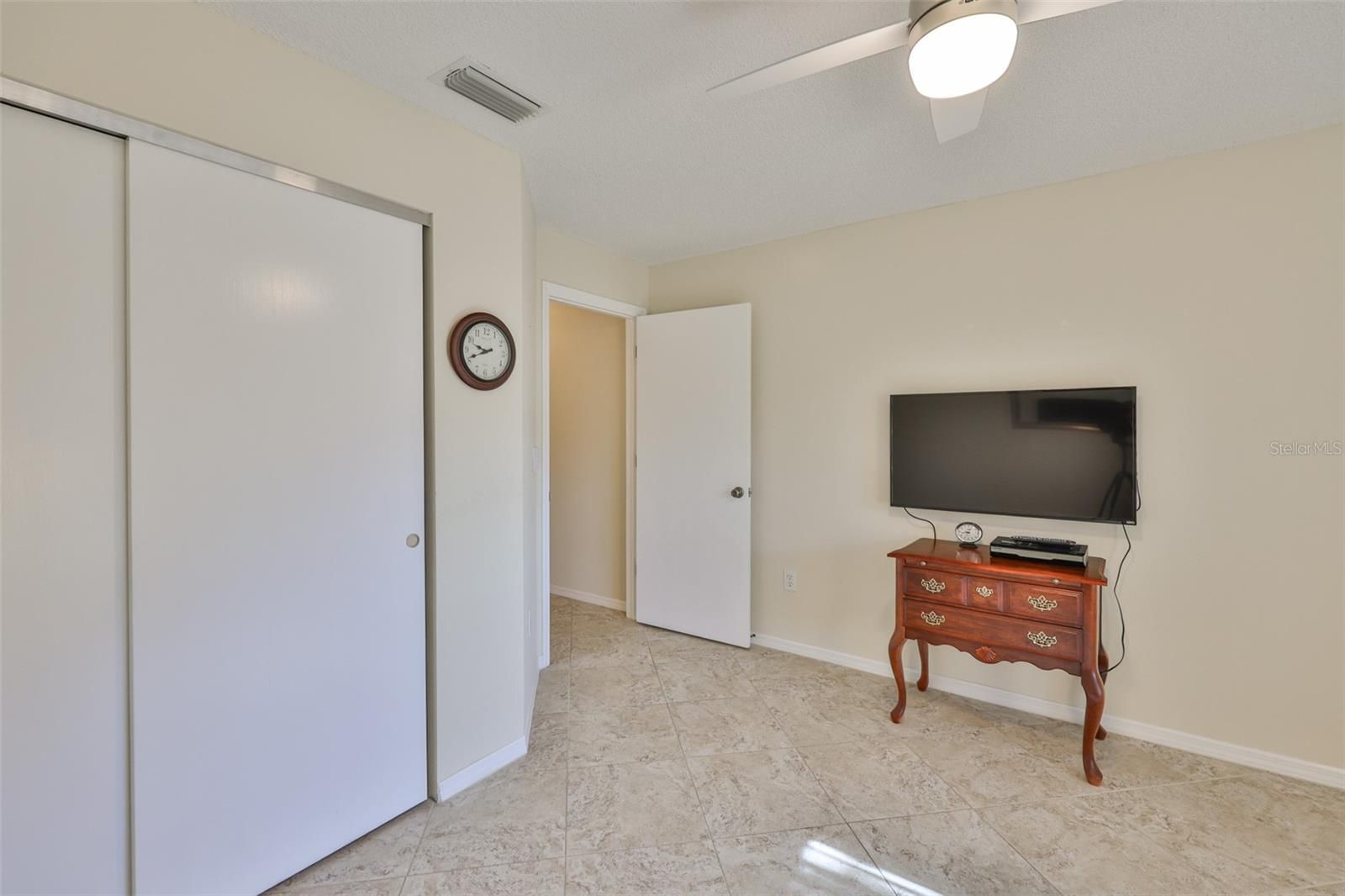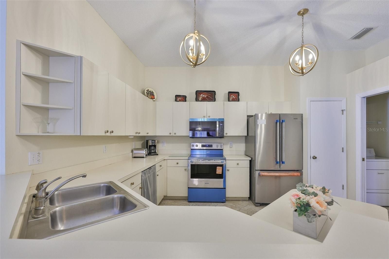 BRAND NEW ROOF! NEW STAINLESS APPLIANCES AND LIGHTED CEILING FANS! Updated modern lights enhance the beautiful porcelain tile throughout the house. Available 4-point inspection transferable to new owners at no cost! Welcome to your slice of Florida paradise in the nation's #1 rated 55+ community, where the essence of easy Florida living provides warmth and tranquility. This charming 2-bedroom, 2-bathroom split floor plan home offers 1,205 interior square feet of thoughtfully designed space. You will enjoy watching wildlife in your screened, private lanai with no rear neighbors. Enjoy the spacious garage for your car and storage needs. As you step inside, you're greeted by natural light and matching updated lighted fans and fixtures for a bright, open-concept living area that seamlessly blends with functionality. The living room flows effortlessly into the dining area for dinners or lively gatherings with friends and family. The kitchen, with its open design and ample counter and cabinet space, invites you to stay connected with the adjacent living areas while creating meals that bring everyone together. Retreat to the primary suite, where there is plenty of room for oversized furniture. The en-suite bathroom offers a spa-like experience, where you have a walk-in shower and a walk-in closet with shelving. The second bedroom, equally inviting, is perfect for guests or a home office, offering flexibility to suit your lifestyle needs. Each room is a canvas, ready to be personalized with your unique touch. Fees include maintaining/replacing the roof, exterior painting, internet & cable, exterior building insurance, maintenance grounds, pest control, security, water, sewer, trash & more! King's Point has two clubhouses, indoor/outdoor heated pools, pickleball, fitness centers including trainers, classes, a salon & spa, two restaurants, dog park and over a hundred clubs to join!