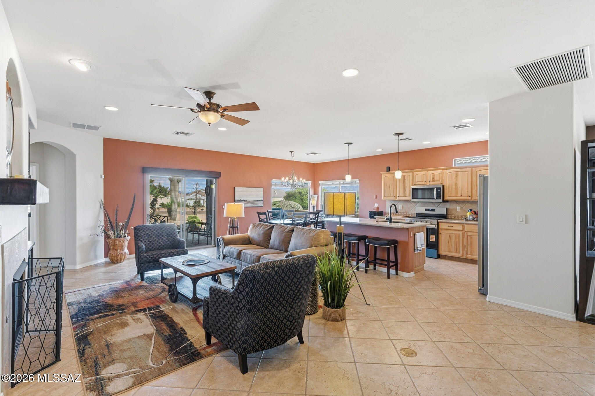 This appealing 3-bedroom, 2-bathroom, Den, traditional home is a remarkable find in the The Legends development, within the Green Valley, AZ 55 + Active Community area. Enjoy inspiring views of Santa Ritas and Madera Canyon. The patio is perfect for grilling. The spacious, low-maintenance, and attractively landscaped yard sits on a pleasant street. An enclosed front porch and open-air back porch extend your living space. Step from the Welcome mat into an interior embrace that includes a stately entryway, an open layout, stylish fixtures, plentiful natural light, and a fireplace. The ample peninsula kitchen brims with granite countertops. Restful main-floor primary bedroom. The Sought after Holiday Floor Plan is ready to reflect your good taste in decor. Extended 2-car garage.