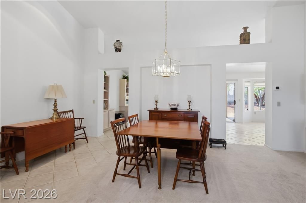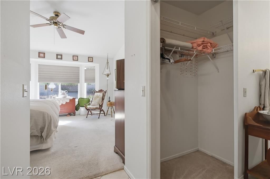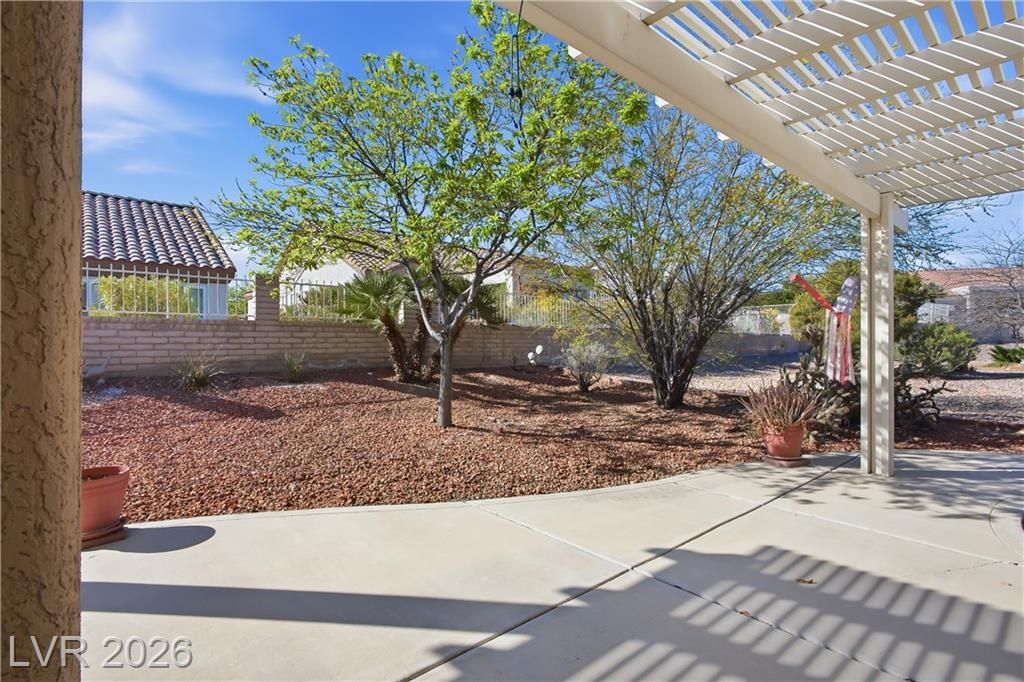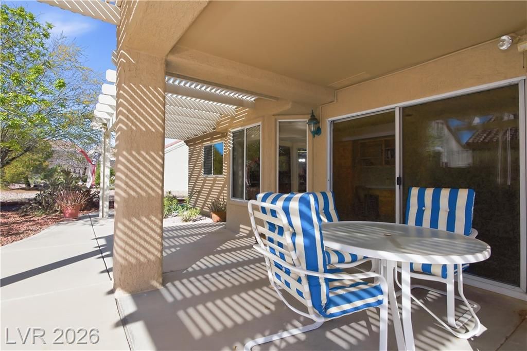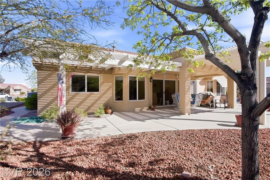Popular Silverton model in premier 55+ Sun City Summerlin, the 1,804 sq. ft. home has 2 bedrooms & 2 baths. Home is located on a quiet cul-de-sac, set on a spacious lot with well-maintained desert landscaping & excellent curb appeal.The open, flowing floor plan is filled with natural light from thoughtfully placed windows, vaulted ceilings enhance the bright, airy ambiance. A partial wall defines the living and dining areas from the family/great room, creating an ideal layout for everyday living & entertaining. Overlooking the great room, the open kitchen features a breakfast bar & a bay window-enhanced eat-in nook. Spacious primary en-suite has dual vanities, a walk-in shower & closet & charming bay window. Down the hall, you’ll find a generously sized 2nd bedroom & full bath. Enjoy patio life under the multiple pergola covers. Laundry moved to oversized 2-car garage with storage cabinets. 3 Golf course community with 4 pools, sports courts & many amenities, clubs and activities