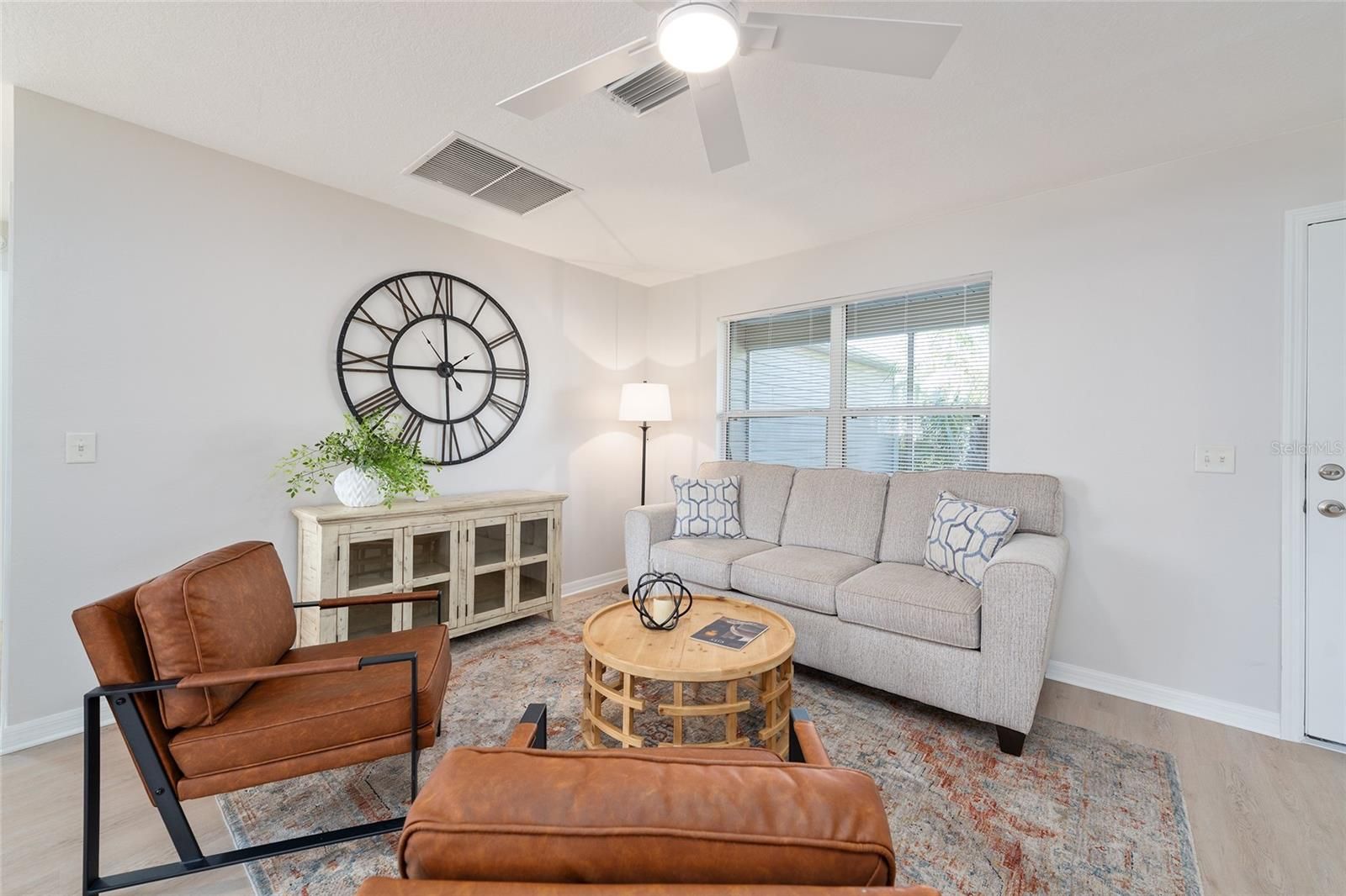 This wonderfully COZY and UPDATED home in The Village of Lynnhaven offers the bright, easy Florida lifestyle in the heart of The Villages. The BOND is PAID. This OPEN FLOOR PLAN features NEW LUXURY VINYL PLANK FLOORING, knock-down textured ceilings (NO POPCORN), and plenty of NATURAL LIGHT that gives the home a warm, welcoming feel. Enjoy peace of mind with a BRAND NEW ROOF (2025) and NEWER HVAC (2020). The kitchen offers AMPLE CABINETRY and WORKSPACE and flows comfortably into the living and dining areas—perfect for relaxed everyday living. The PRIMARY BEDROOM provides a comfortable space with an EN SUITE BATH, while the split design floorplan places two guest bedrooms on the opposite side of the home, ideal for a guest area, hobby room, or home office. A SCREENED LANAI overlooking the tranquil backyard is the perfect spot to enjoy morning coffee or evening breezes under the Florida sky. Additional conveniences include an indoor laundry room and an excellent location just a SHORT GOLF CART RIDE to LAKE SUMTER LANDING with its NIGHTLY ENTERTAINMENT, WATERFRONT DINING, and SHOPPING, plus quick access to COSTCO, WALMART, the many restaurants, and everyday conveniences on CR466. A charming and comfortable home ready to enjoy year-round or seasonally. Bond is paid! Call for a showing today!