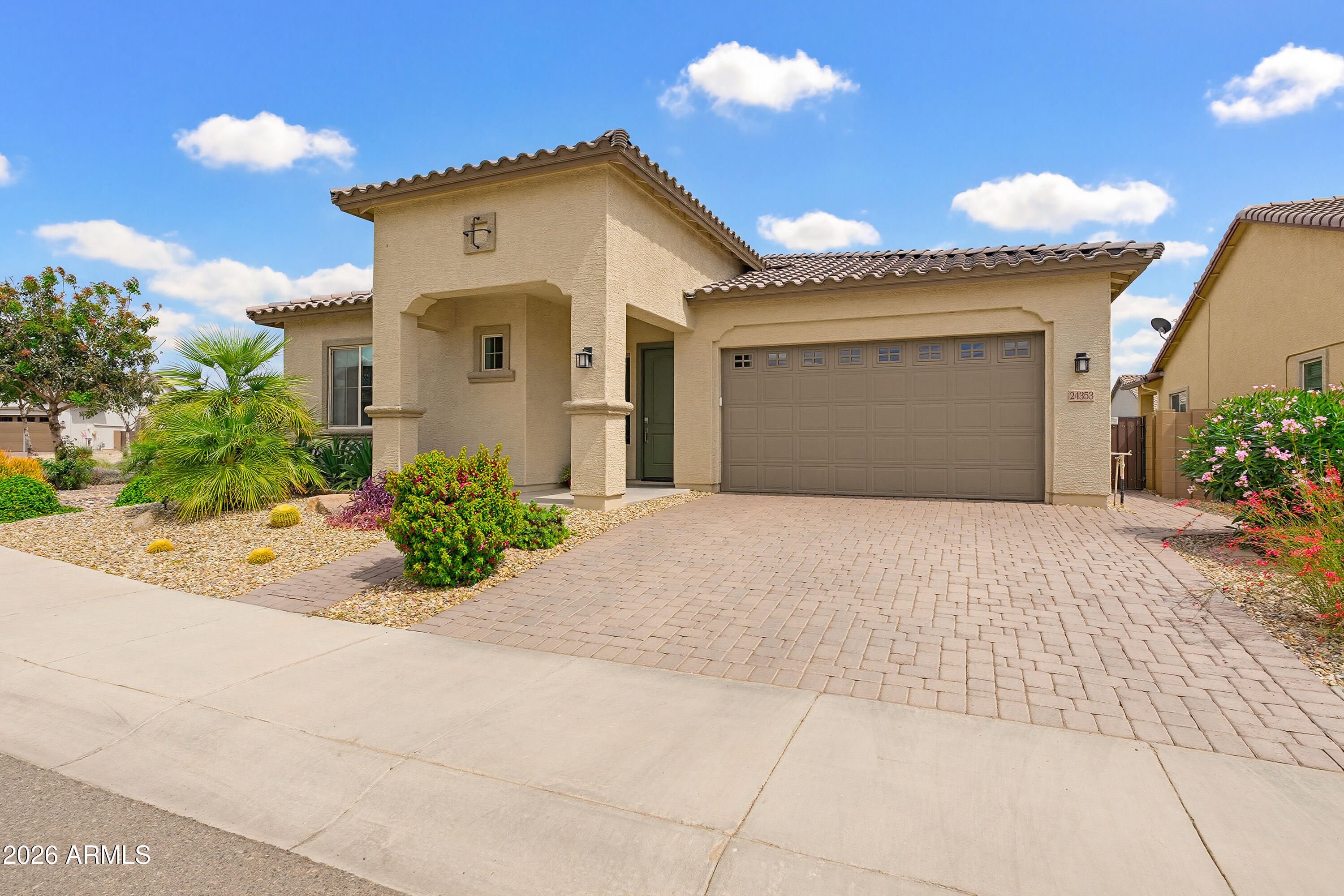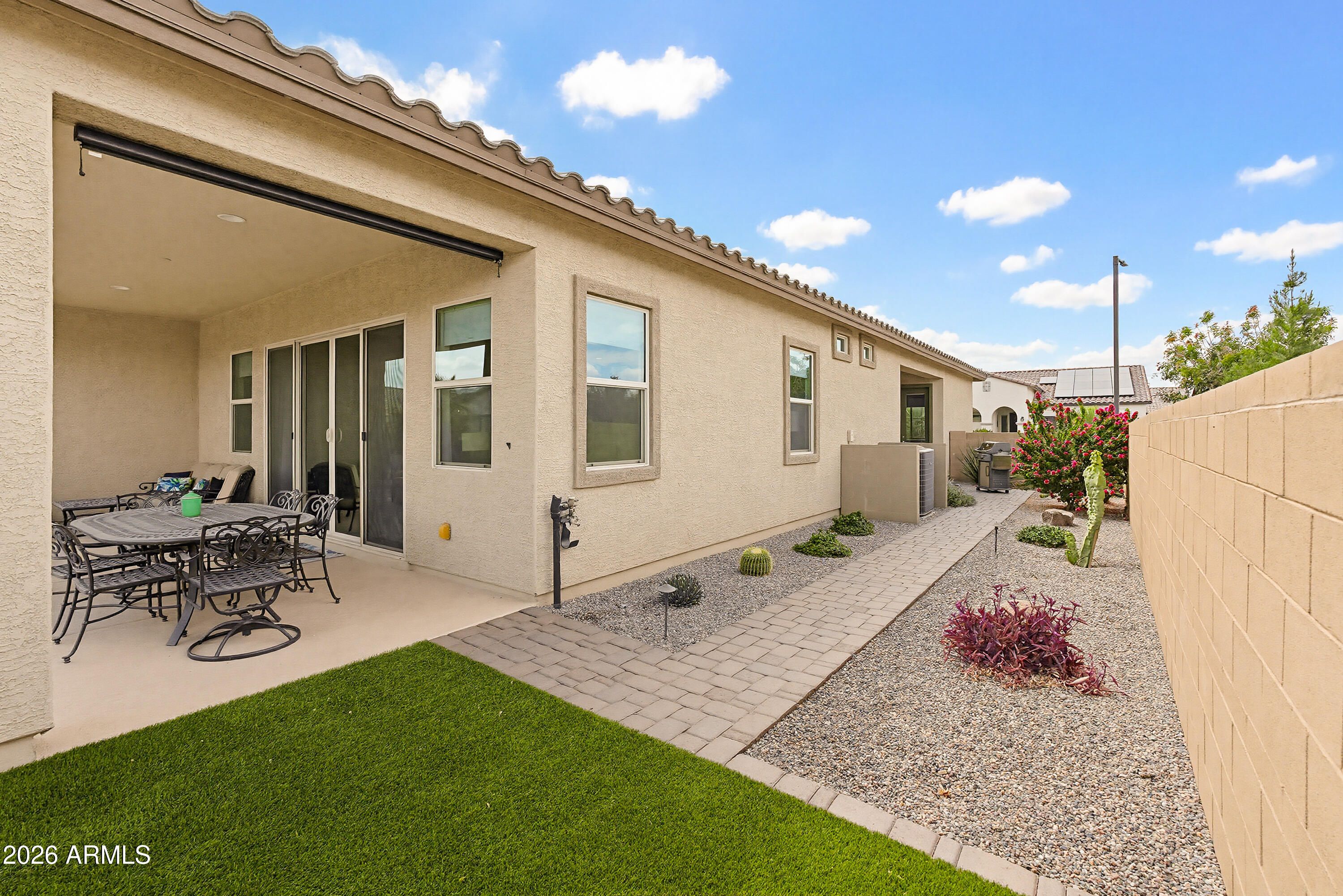 Welcome to resort-style living in Heritage at Asante featuring the sought-after Crest floorplan by Lennar. This single-level home offers a thoughtful layout with a bedroom off the entry featuring an en-suite bath and access to the covered patio, plus a nearby den providing flexible living space. The open-concept kitchen, dining, and living areas create the heart of the home, while two additional bedrooms are privately tucked away, including the luxe owner's suite with walk-in closet and private bath. Upgrades include designer wallpaper, pendant lighting, upgraded roller shades, and a chef's kitchen with upgraded oven. Enjoy a backyard oasis with pool and turf, upgraded front yard, and epoxy garage with added storage. Residents enjoy access to the community center, resort-style pool, fitness center, pickleball courts, and walking paths.