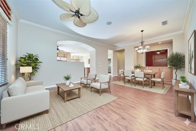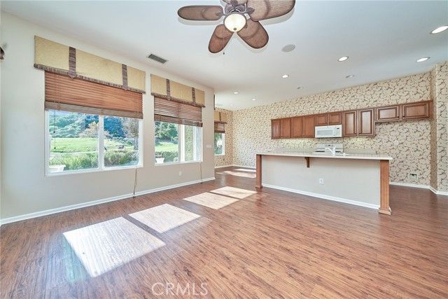 This one-of-a-kind former model home is perfectly positioned in a prime location within the community, capturing some of the best views available. Enjoy breathtaking 180-degree panoramic views of Temescal Canyon, city lights, mountains, and the Glen Ivy Golf Club. Perched at over 1,300 feet above sea level, this exceptional Sycamore Model residence showcases extensive upgrades and designer features throughout. The airy, light-filled interior offers 2 bedrooms plus a dedicated office/den with French doors, ideal for a home office or flexible living space. Highlights include hardwood flooring, travertine tile, custom window treatments, ceiling fans, and striking accent walls that reflect its former model-home status. The spacious gourmet kitchen features abundant cabinetry and flows seamlessly into both the great room and a separate living room—each framed by unobstructed canyon and golf course views. Spa-like bathrooms further enhance the luxury living experience. Ideally located just a 5-minute walk to the clubhouse or a quick 30-second ride by golf cart, this home offers unmatched convenience within Trilogy. Residents of the prestigious, gated Trilogy at Glen Ivy active adult community enjoy resort-style amenities including a 13,000 sq ft clubhouse, 15,000 sq ft state-of-the-art fitness center, indoor and outdoor pools, jacuzzi, pickleball, tennis and bocce courts, BBQ areas, indoor walking track, amphitheater, fitness classes, and countless social clubs. Conveniently close to Cleveland National Forest, Glen Ivy Hot Springs, Dos Lagos shopping, and the Glen Ivy Golf Club, this is a rare opportunity to own a former model home with unmatched views, a prime location, and premium upgrades in one of Southern California’s most desirable 55+ communities.