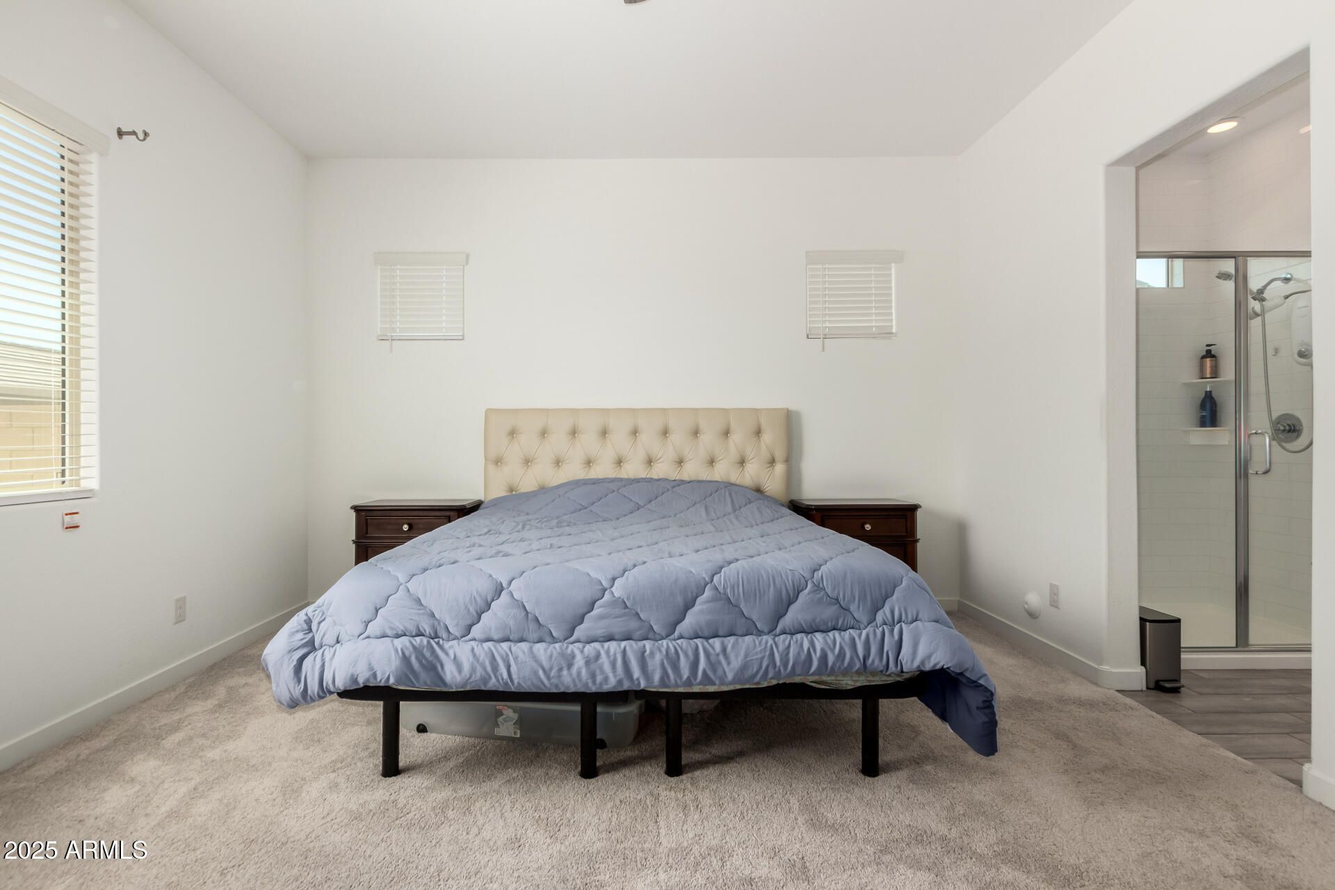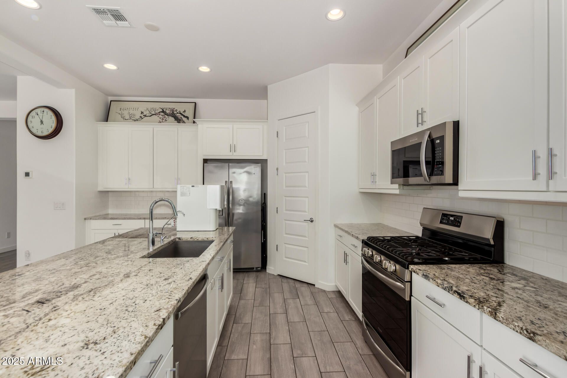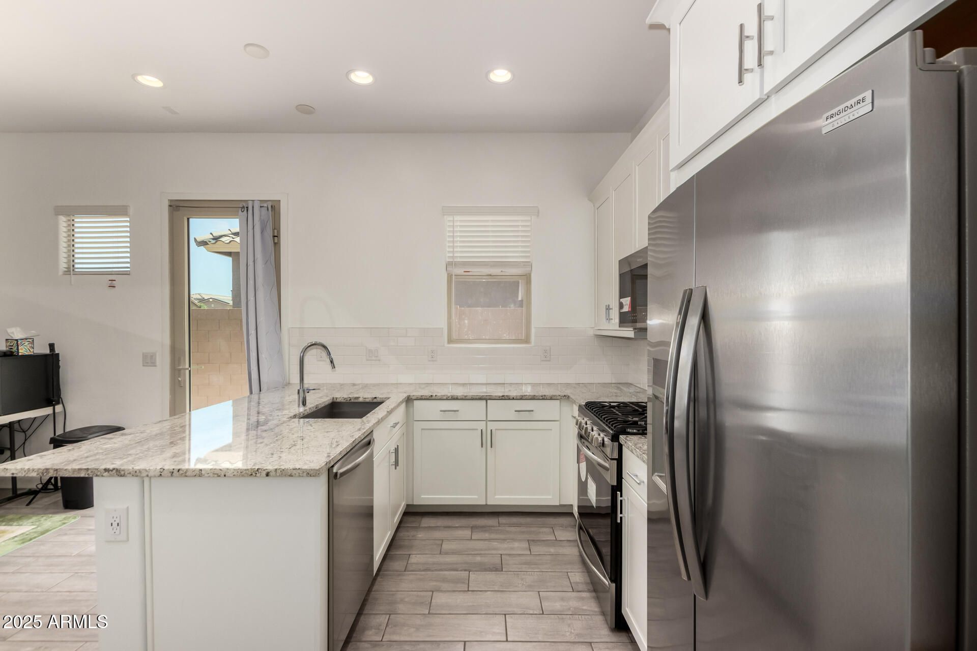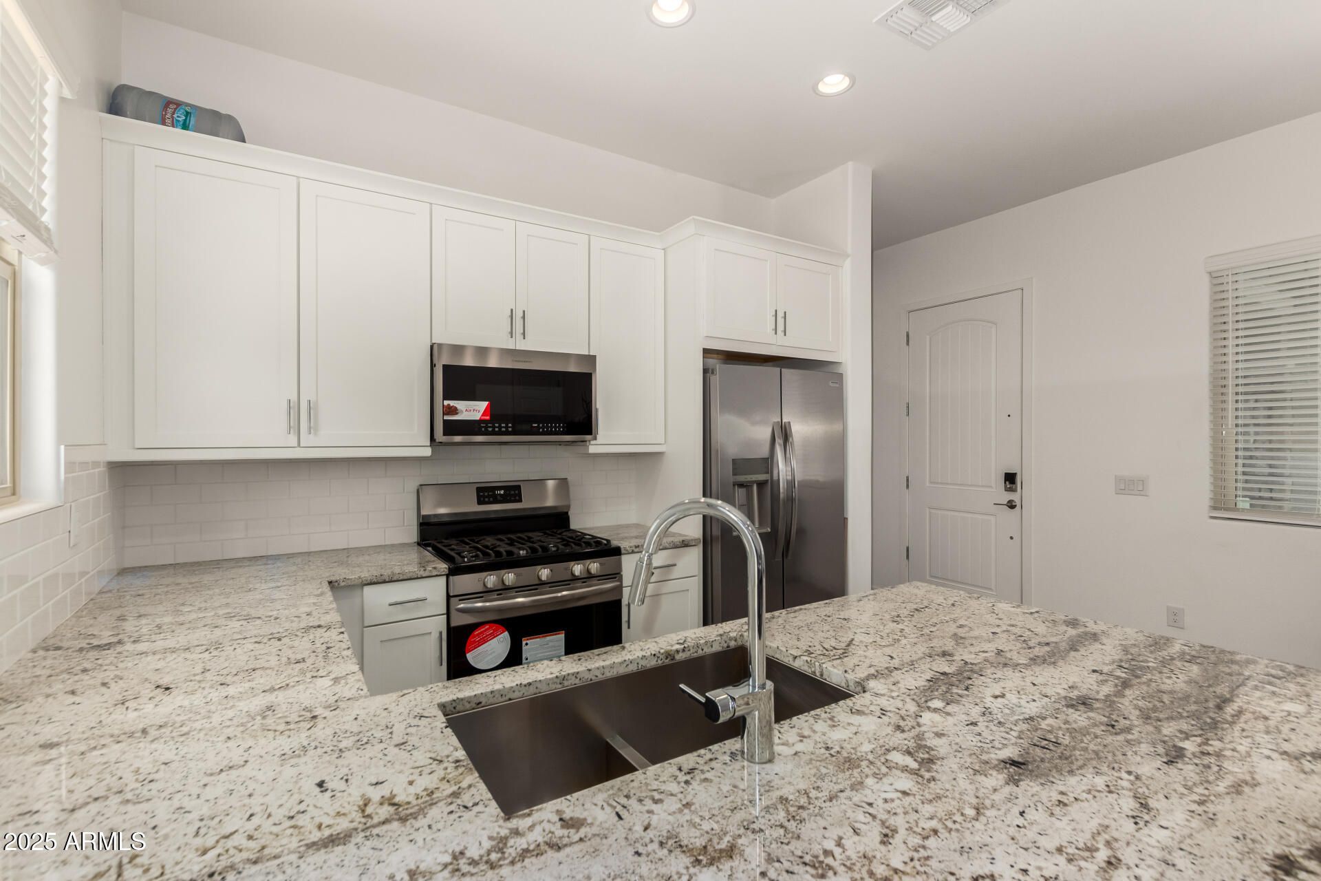 Discover this stunning single-level home with a casita and a 3-car garage! Inside, you'll find spacious living areas with tile flooring, abundant natural light, and neutral paint. The impeccable culinary space showcases recessed lighting, shaker cabinetry with crown molding, tile backsplash, sleek granite counters, a pantry, stainless steel appliances & an island. The main bedroom displays carpet for added comfort, a walk-in closet & a bathroom with double sinks. The guest quarters are complete with a bedroom, bathroom, laundry area, and kitchen. The backyard boasts a cozy covered patio perfect for unwinding after a long day, and a low-maintenance landscape waiting for your projects. What's not to love? Welcome home!