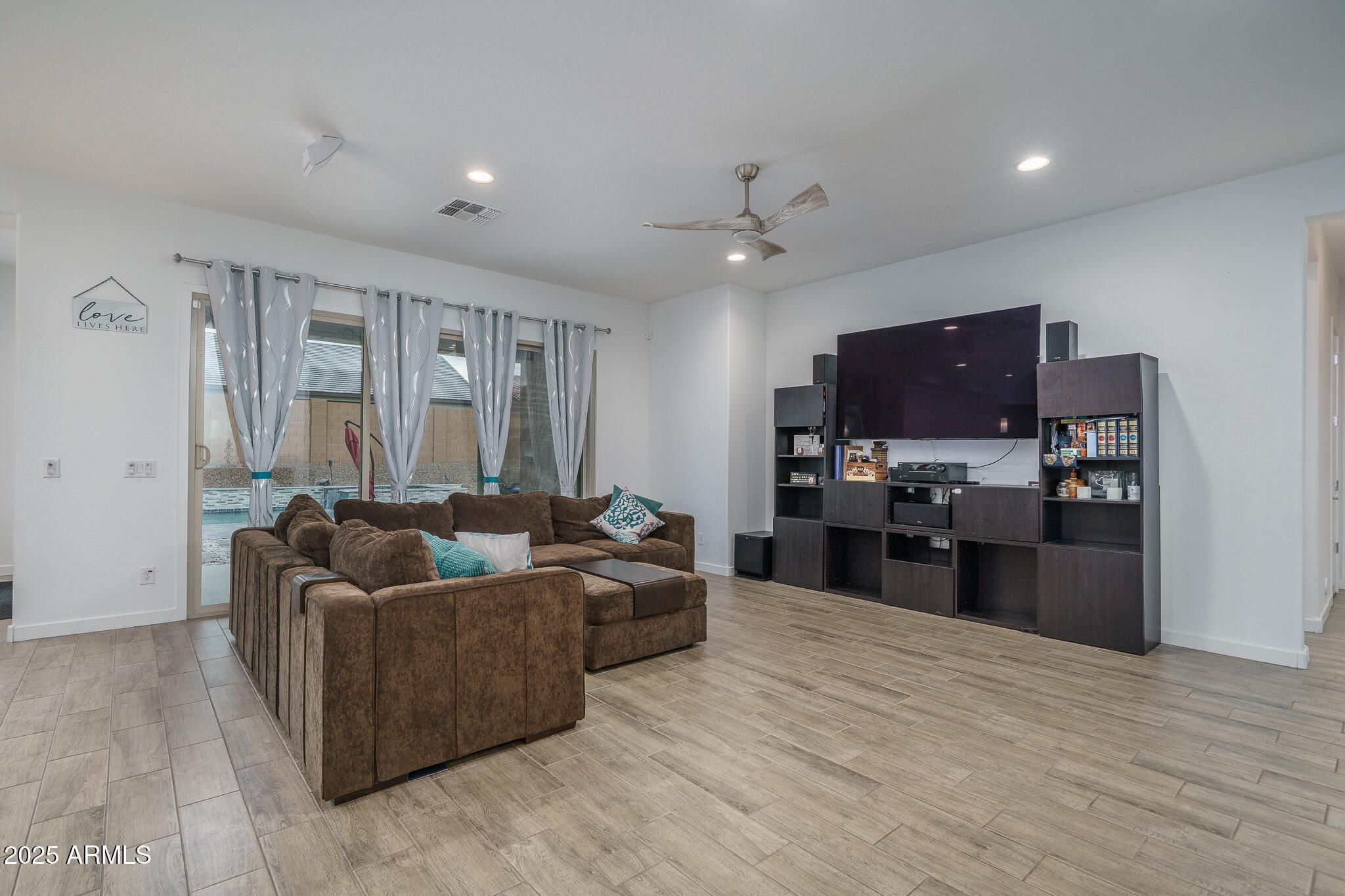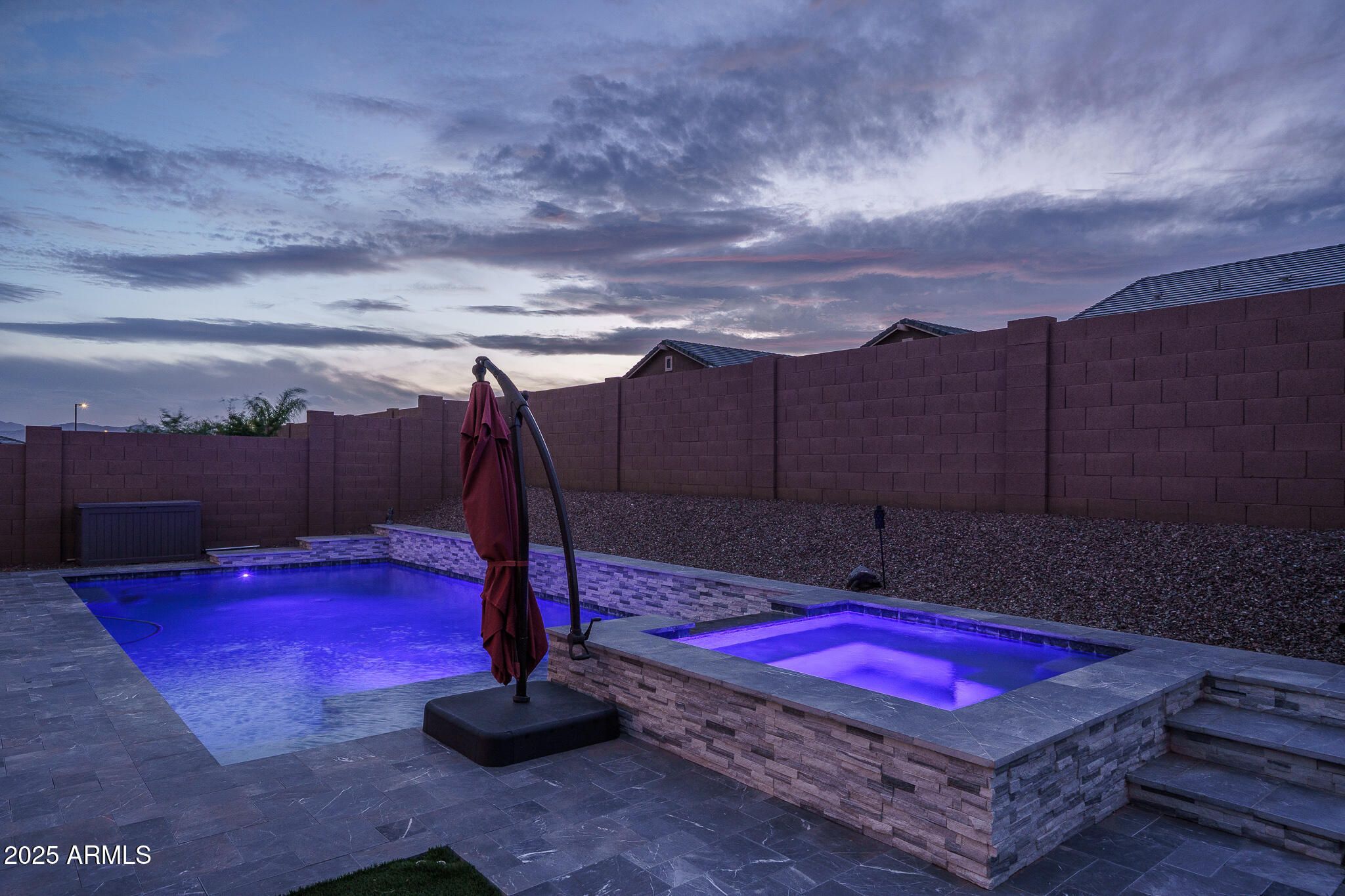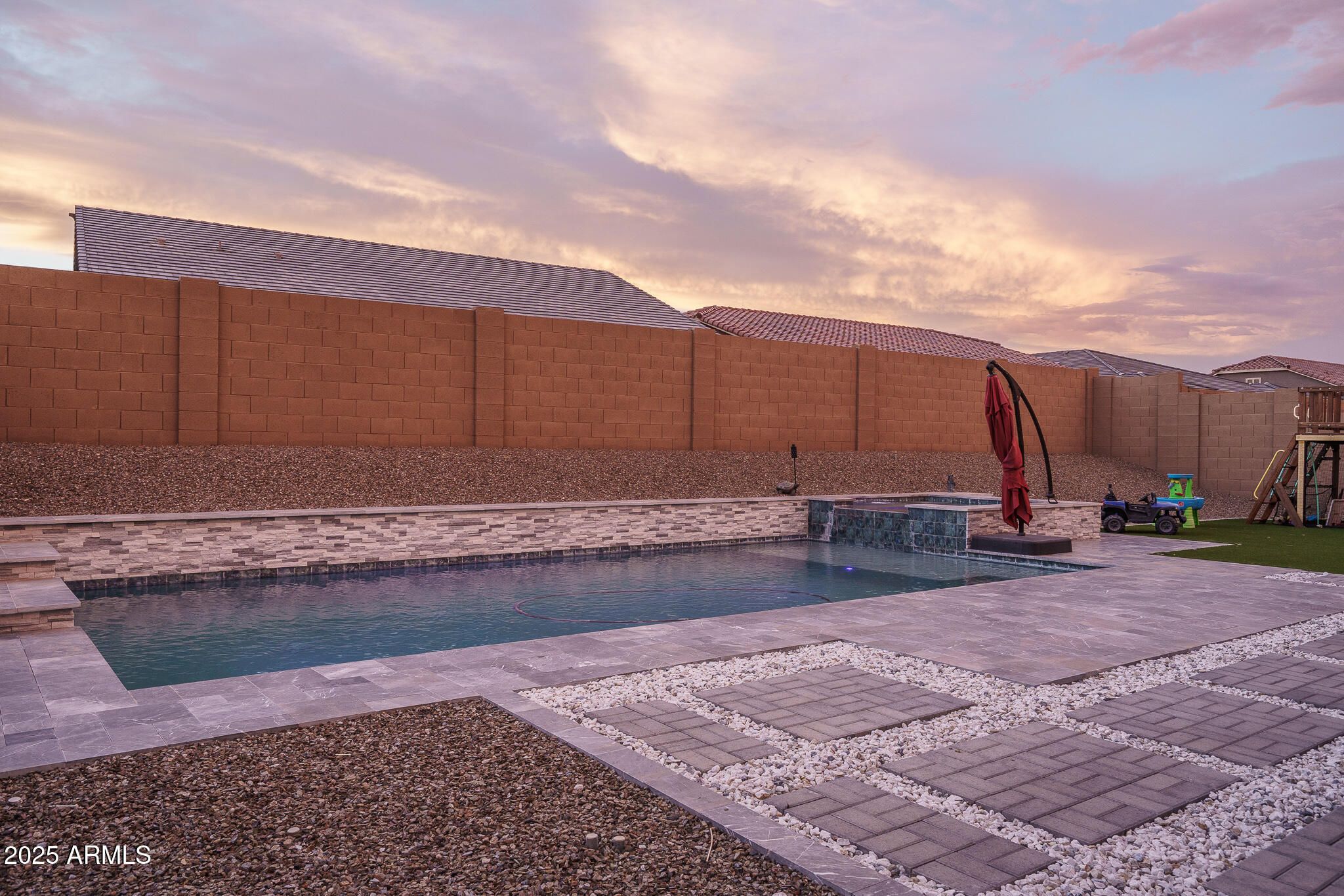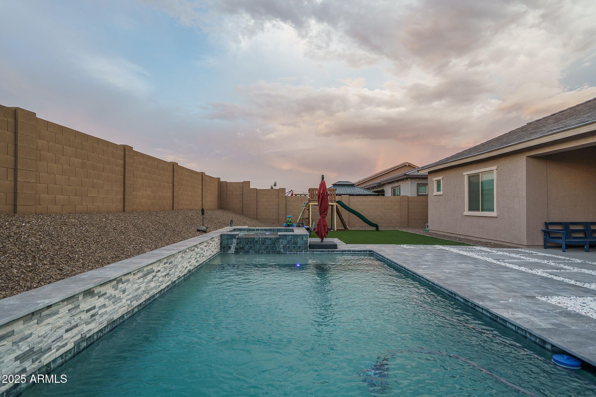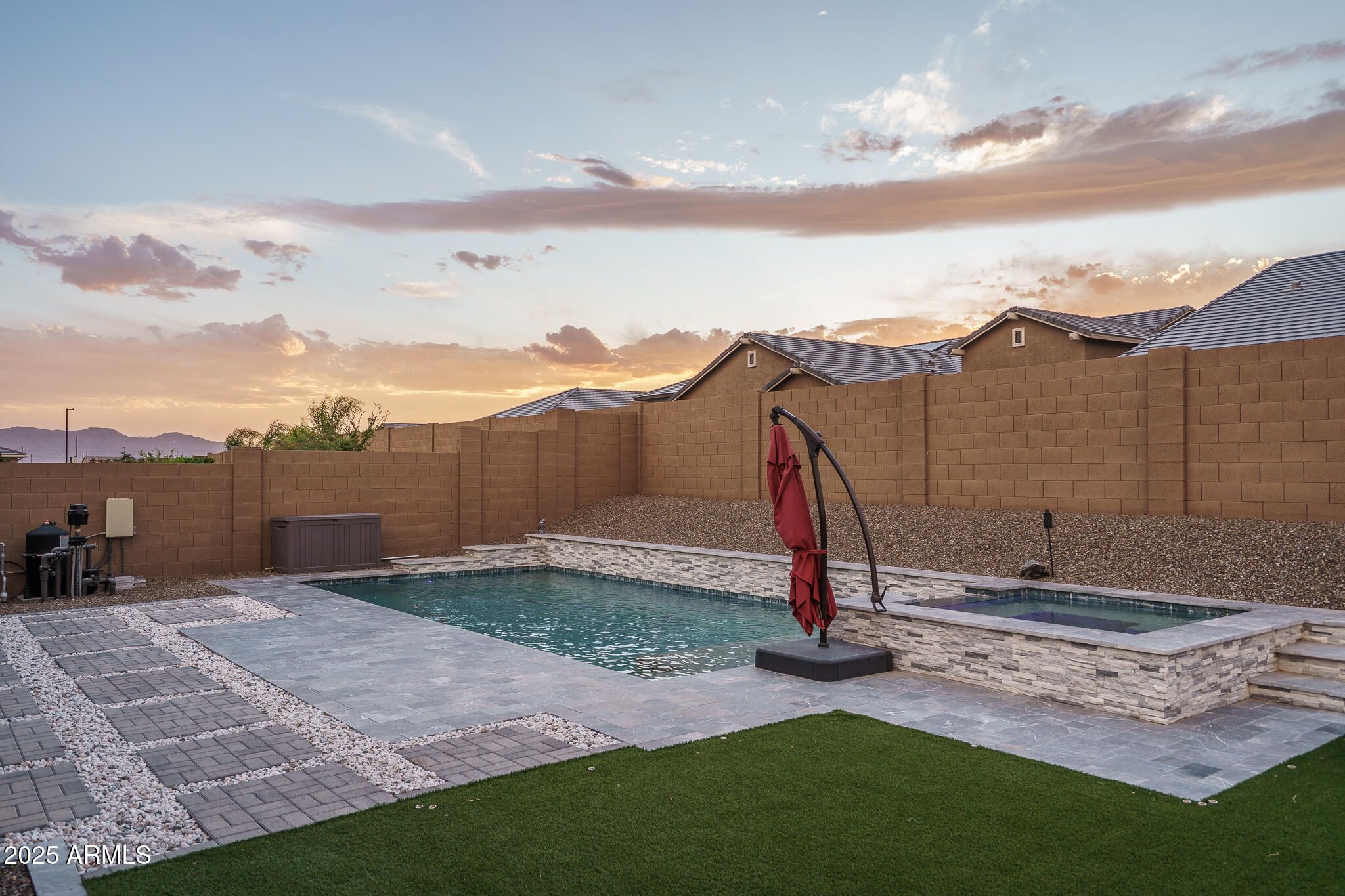 This beautifully maintained, original-owner single-level residence in the sought-after Asante community offers 5 spacious bedrooms and 3 well-appointed baths across 3,024 square feet of thoughtfully designed living space. The popular Evolution floor plan includes a versatile next-gen suite, complete with its own living area, fully equipped kitchen, private bedroom and bath, and laundry hookups discreetly tucked into a walk-in closet—perfect for multi-generational living or guest accommodations. The main home showcases an expansive great room and a chef's kitchen featuring shaker-style cabinetry, gleaming Quartz countertops, a classic subway tile backsplash, stainless steel appliances, a walk-in pantry, and a generous island with breakfast bar and pendant lighting. Sliding glass doors from both the great room and dining area open to a covered patio that overlooks a stunning heated Pebble Tec pool and spa, accented with stacked stone and surrounded by elegant paver decking. The backyard is designed for low-maintenance enjoyment, with artificial turf ideal for children and pets, plus a private patio off the casita living room for added relaxation. The luxurious primary suite boasts an en-suite bath with dual vanities, framed mirrors, an oversized tiled shower with bench seating, and a spacious walk-in closet. Guests will appreciate the extended vanity and tiled tub/shower combo in the secondary bath. Additional highlights include a split 3-car garage with an EV charging port and access to fantastic community amenities such as pools, playgrounds, and a charming lending library. Convenient proximity to the 60 and Loop 303 for commutes around the Valley.