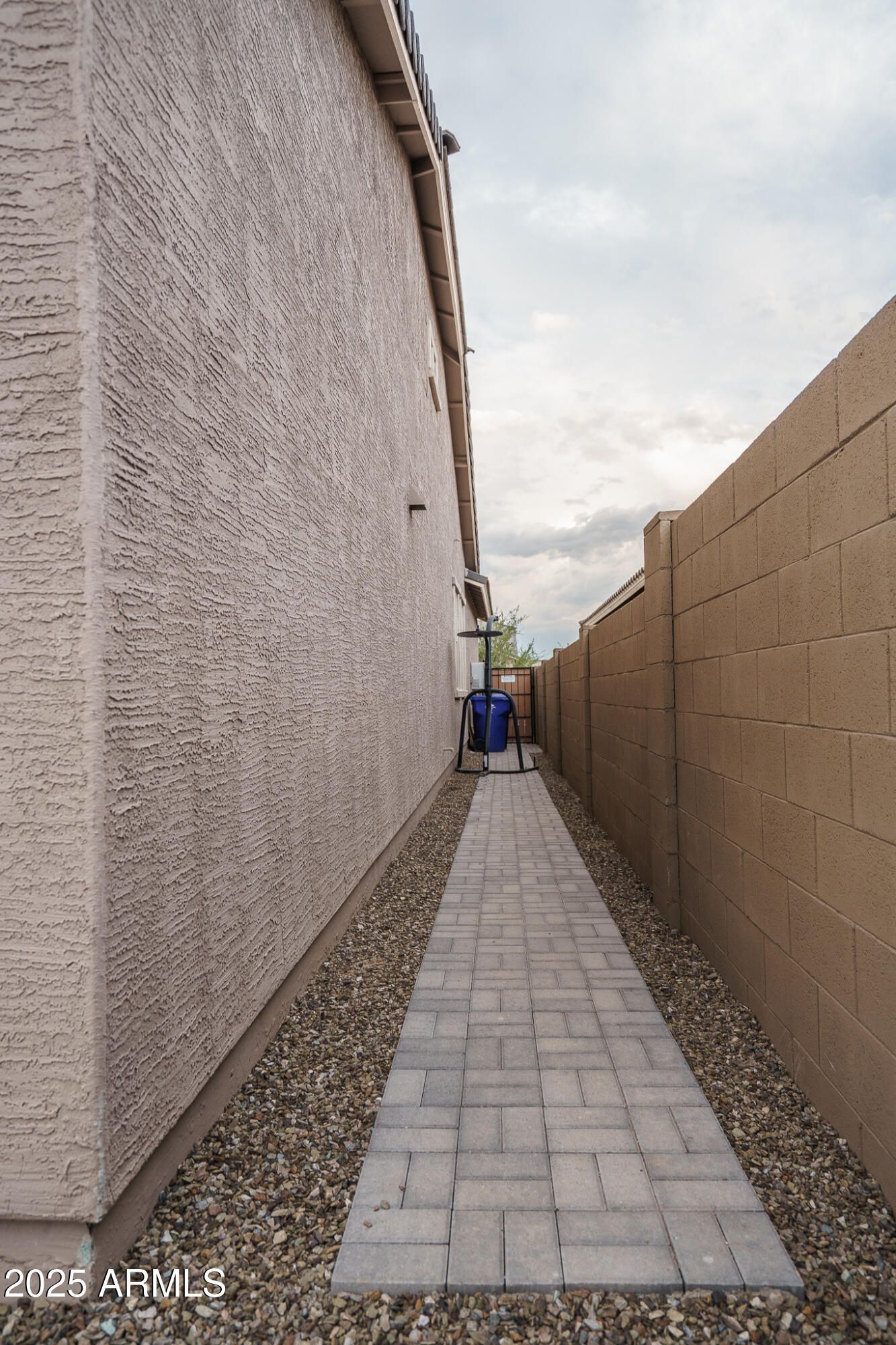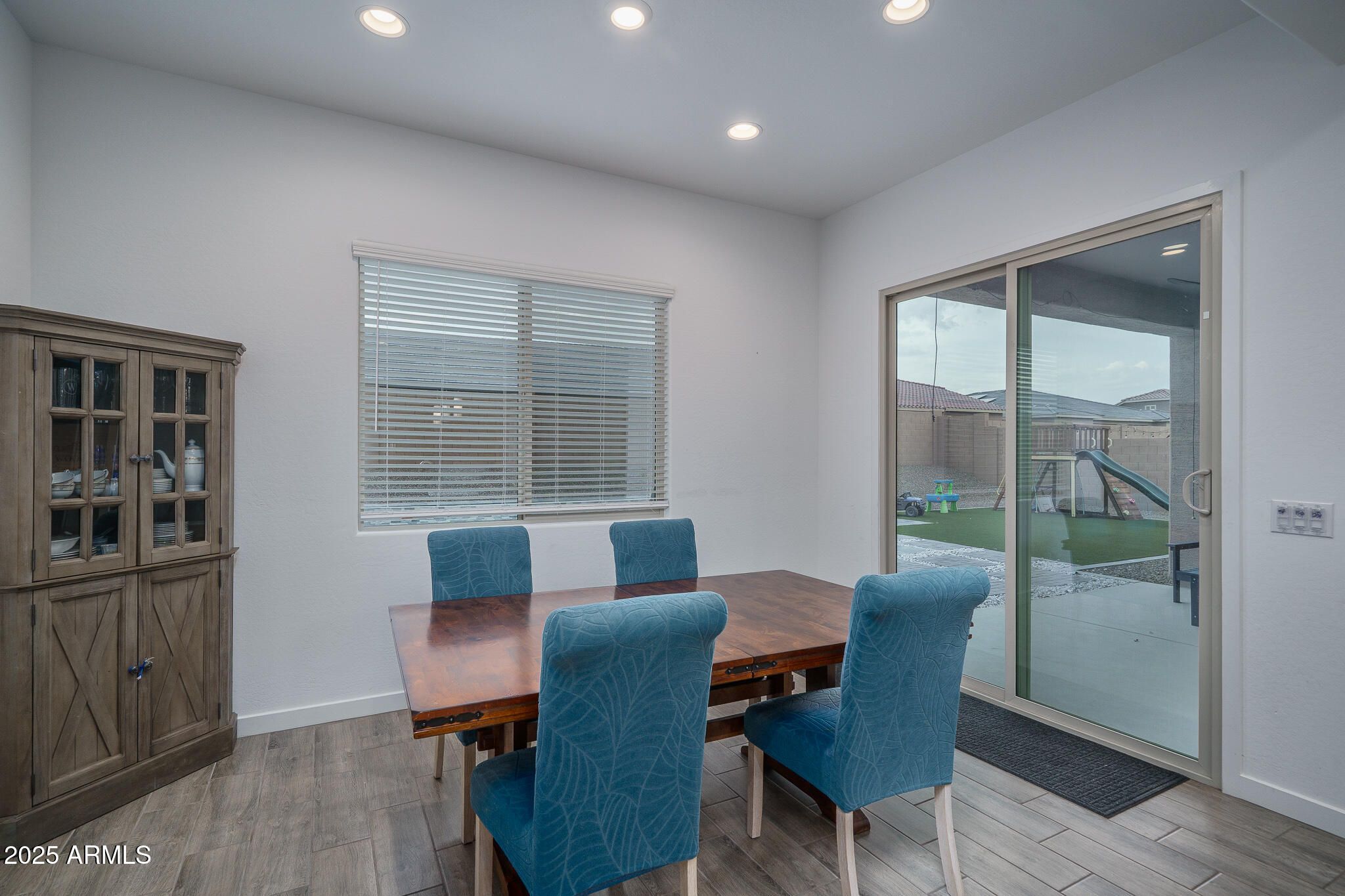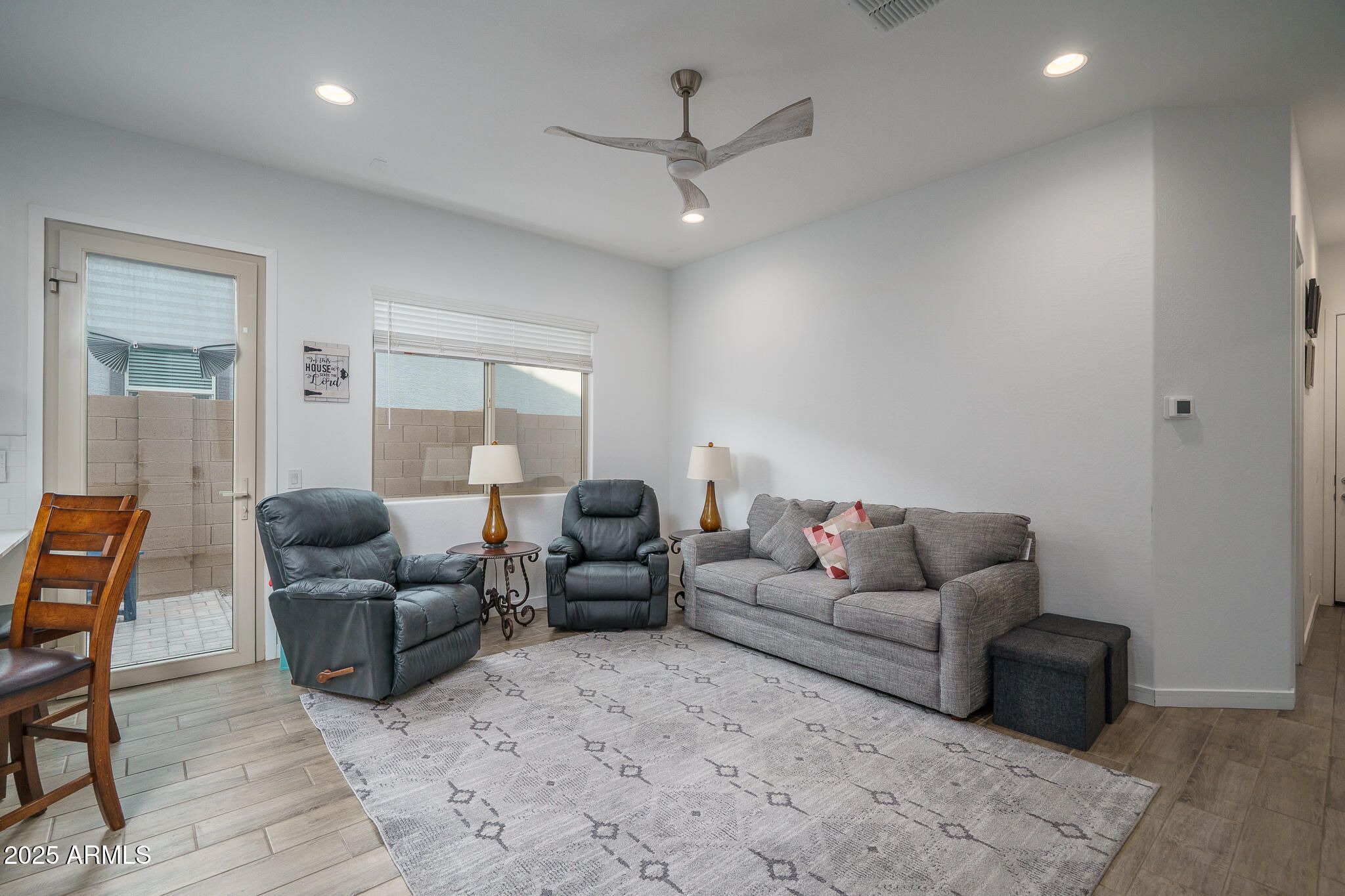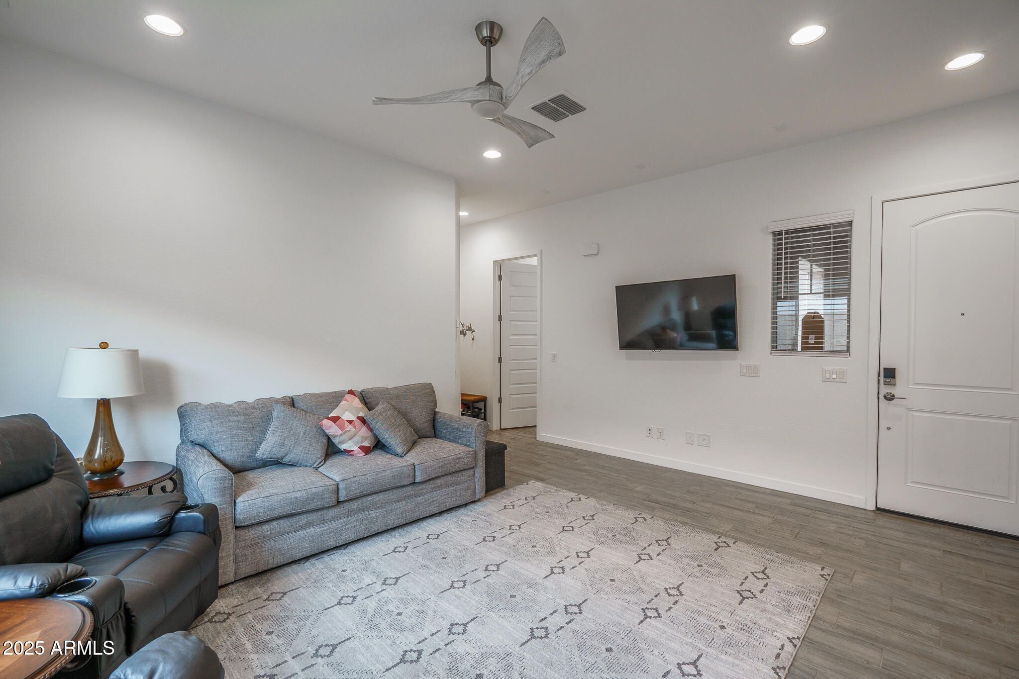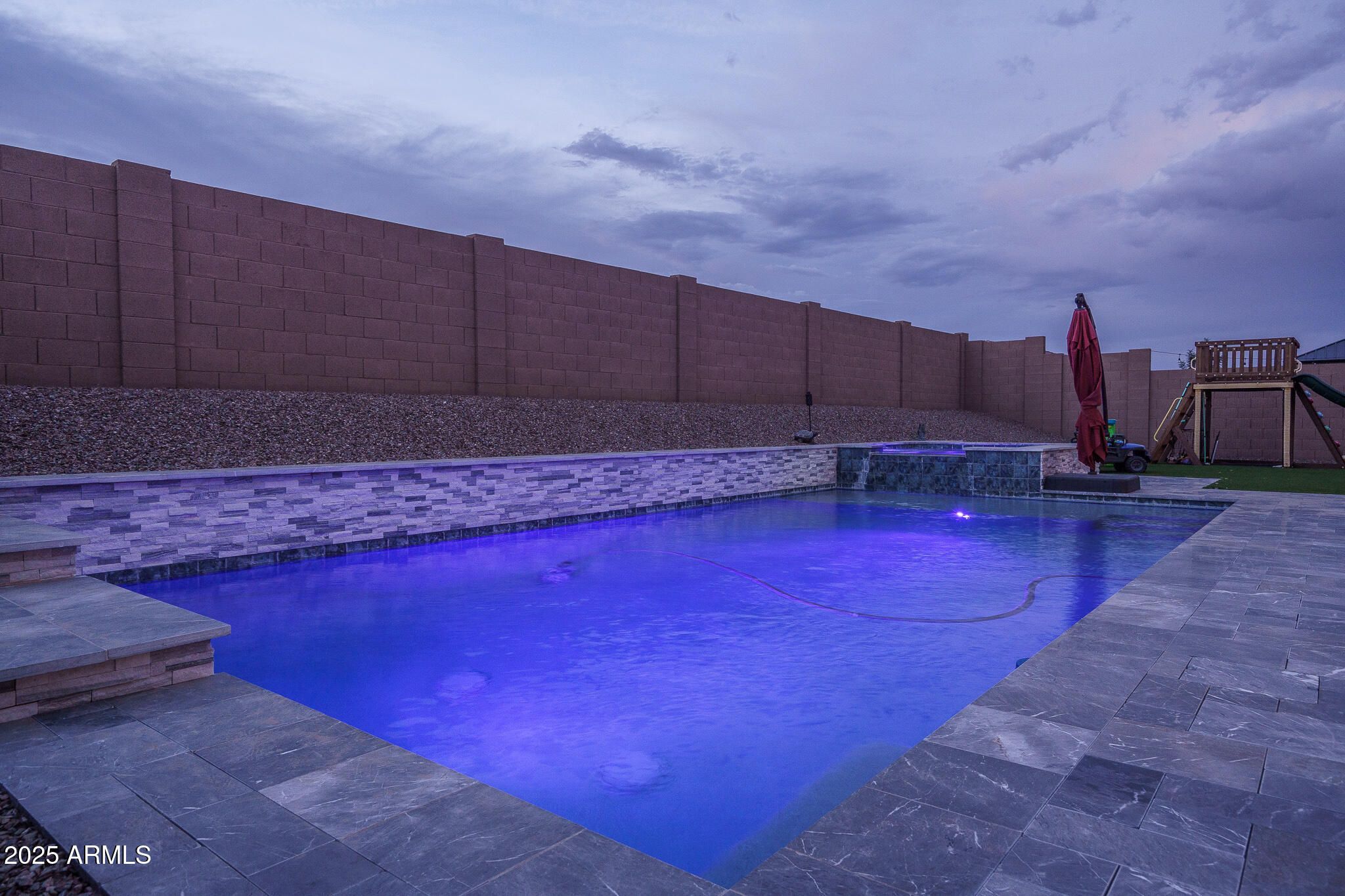 This beautifully maintained, original-owner single-level residence in the sought-after Asante community offers 5 spacious bedrooms and 3 well-appointed baths across 3,024 square feet of thoughtfully designed living space. The popular Evolution floor plan includes a versatile next-gen suite, complete with its own living area, fully equipped kitchen, private bedroom and bath, and laundry hookups discreetly tucked into a walk-in closet—perfect for multi-generational living or guest accommodations. The main home showcases an expansive great room and a chef's kitchen featuring shaker-style cabinetry, gleaming Quartz countertops, a classic subway tile backsplash, stainless steel appliances, a walk-in pantry, and a generous island with breakfast bar and pendant lighting. Sliding glass doors from both the great room and dining area open to a covered patio that overlooks a stunning heated Pebble Tec pool and spa, accented with stacked stone and surrounded by elegant paver decking. The backyard is designed for low-maintenance enjoyment, with artificial turf ideal for children and pets, plus a private patio off the casita living room for added relaxation. The luxurious primary suite boasts an en-suite bath with dual vanities, framed mirrors, an oversized tiled shower with bench seating, and a spacious walk-in closet. Guests will appreciate the extended vanity and tiled tub/shower combo in the secondary bath. Additional highlights include a split 3-car garage with an EV charging port and access to fantastic community amenities such as pools, playgrounds, and a charming lending library. Convenient proximity to the 60 and Loop 303 for commutes around the Valley.