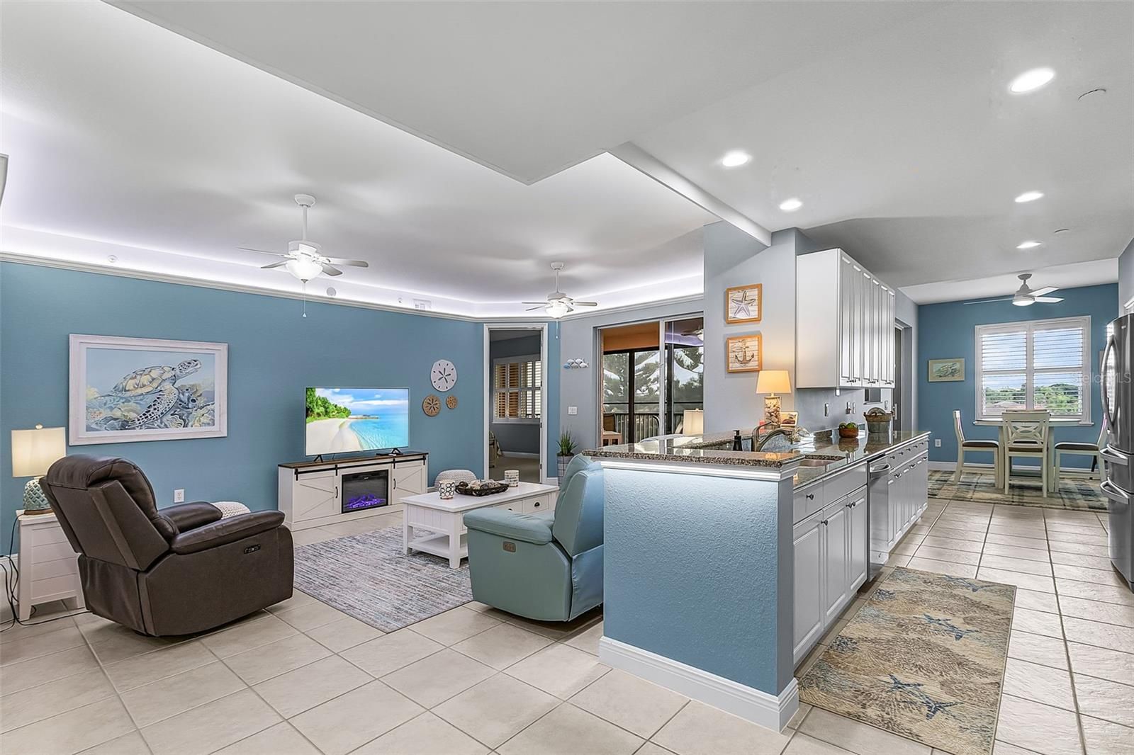 Considering a condo that truly lives like a home—without the maintenance? This beautifully designed, move-in ready mostly furnished 2-bedroom plus den, 2-bath residence offers nearly 1,800 square feet of light-filled living space, complemented by peaceful lake and golf course views and an exceptional oversized private garage. The modern open floorplan is both welcoming and functional, featuring a long galley-style kitchen that opens seamlessly to the main living area with an intimate dining space positioned to enjoy expansive views. The kitchen is well-designed for entertaining, showcasing 42” cabinetry, granite countertops, newer stainless-steel appliances, a decorative backsplash and undermount lighting. Ten-foot ceilings, a split-bedroom layout, and a versatile den/office provide comfort and privacy, allowing guests their own wing while offering flexible space for a home office or additional sleeping area. Attractive crown molding accented by LED lighting adds a sophisticated ambiance in the great room, while southern exposure fills the space with natural light through wide sliding glass doors. Step outside to the generous screened lanai and unwind as you take in tranquil lake views, golfers on the course, Florida wildlife, and glorious sunsets. When it’s cooler, you can close the acrylic sliding doors that also offer sun shade, or easily remove them and enjoy the breeze. The lanai is also accessible from the oversized primary suite, which features dual walk-in closets and a thoughtfully designed ensuite bath with two sinks, a soaking tub, and a large walk-in shower. The guest suite with an adjacent full bath is located on the opposite side of the residence for more privacy. A rarely found bonus is the enormous ground-level private garage, with its expansive space for vehicles, a golf cart, bicycles, beach gear, and other toys. For either a seasonal retreat or a full-time residence, this condo delivers newer-construction features, generous interior space, stunning views, and outstanding storage. The community is beautifully maintained and includes a private heated pool and spa, a fitness room and its own gated entry. Burnt Store Marina is the largest private marina on Florida’s west coast with immediate access to deep water, a 27 hole golf course that’s open to the public, tennis, fitness and pickleball center and two restaurants all within the gates. Come see your new home in the sun!
