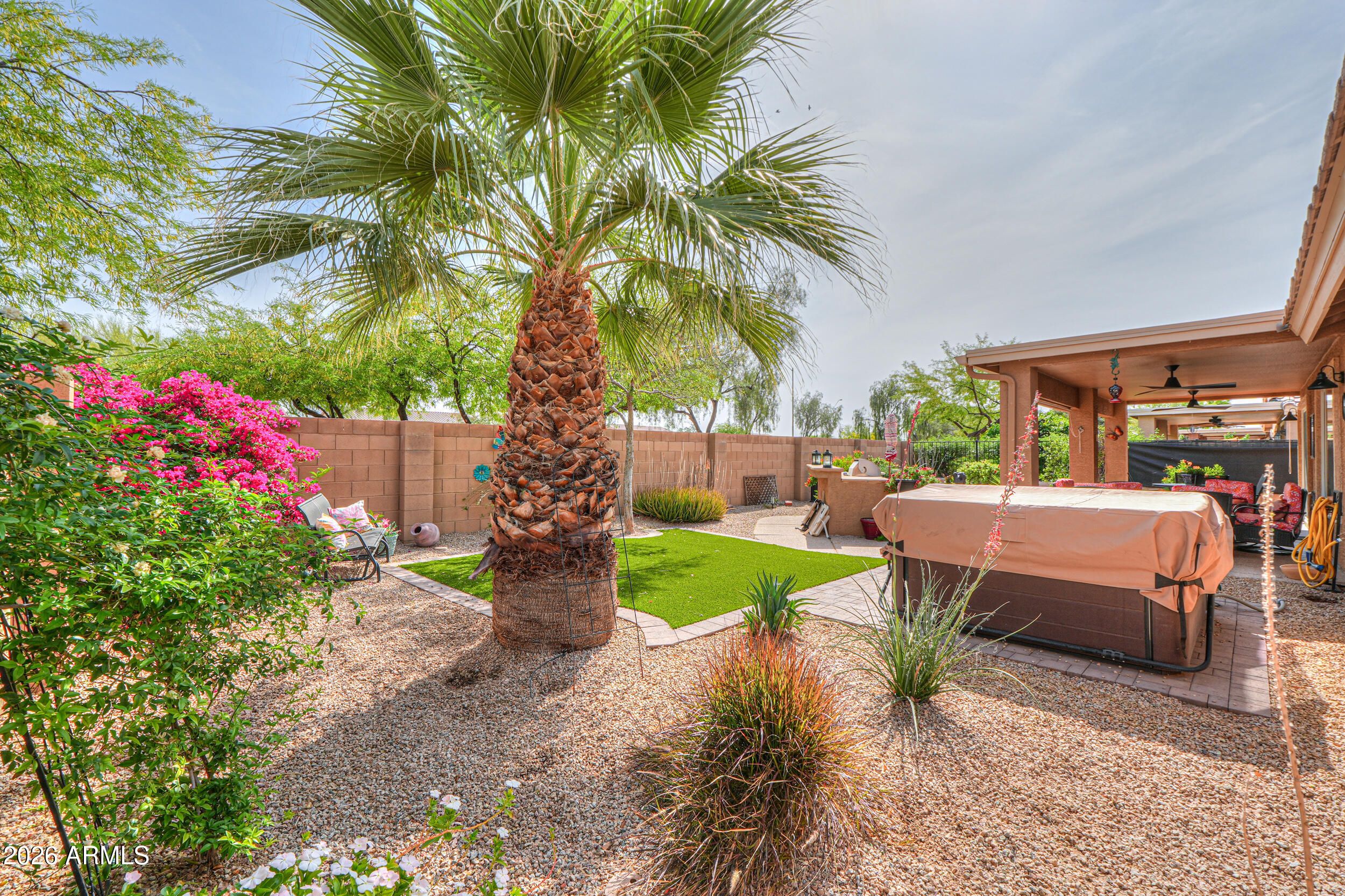 Beautiful 2 bedroom + den, 2 bath home located on a desirable corner lot in Mission Royale Active Adult Community with Owned Solar! This well maintained property features fresh exterior paint, stunning curb appeal, and a welcoming front courtyard with pavers. Inside, you'll find custom two-tone paint, tile flooring throughout with cozy carpet in the bedrooms, and a bright eat-in kitchen complete with Corian countertops, white cabinetry, stainless steel appliances, and a convenient breakfast bar that opens to a spacious great room with vaulted ceilings. The primary suite offers French doors, a walk-in closet, and an ensuite bath with a tiled walk-in shower. The guest bedroom includes a charming bay window and generous closet space. Step outside to your private, fenced in backyard oasis, featuring a covered patio, lush landscaping with turf, a built-in BBQ, and a brand-new hot tub--perfect for relaxing or entertaining. Additional highlights include ceiling fans throughout, an extended garage with epoxy floors, built-in shelving, and a workbench. Furnished Option!