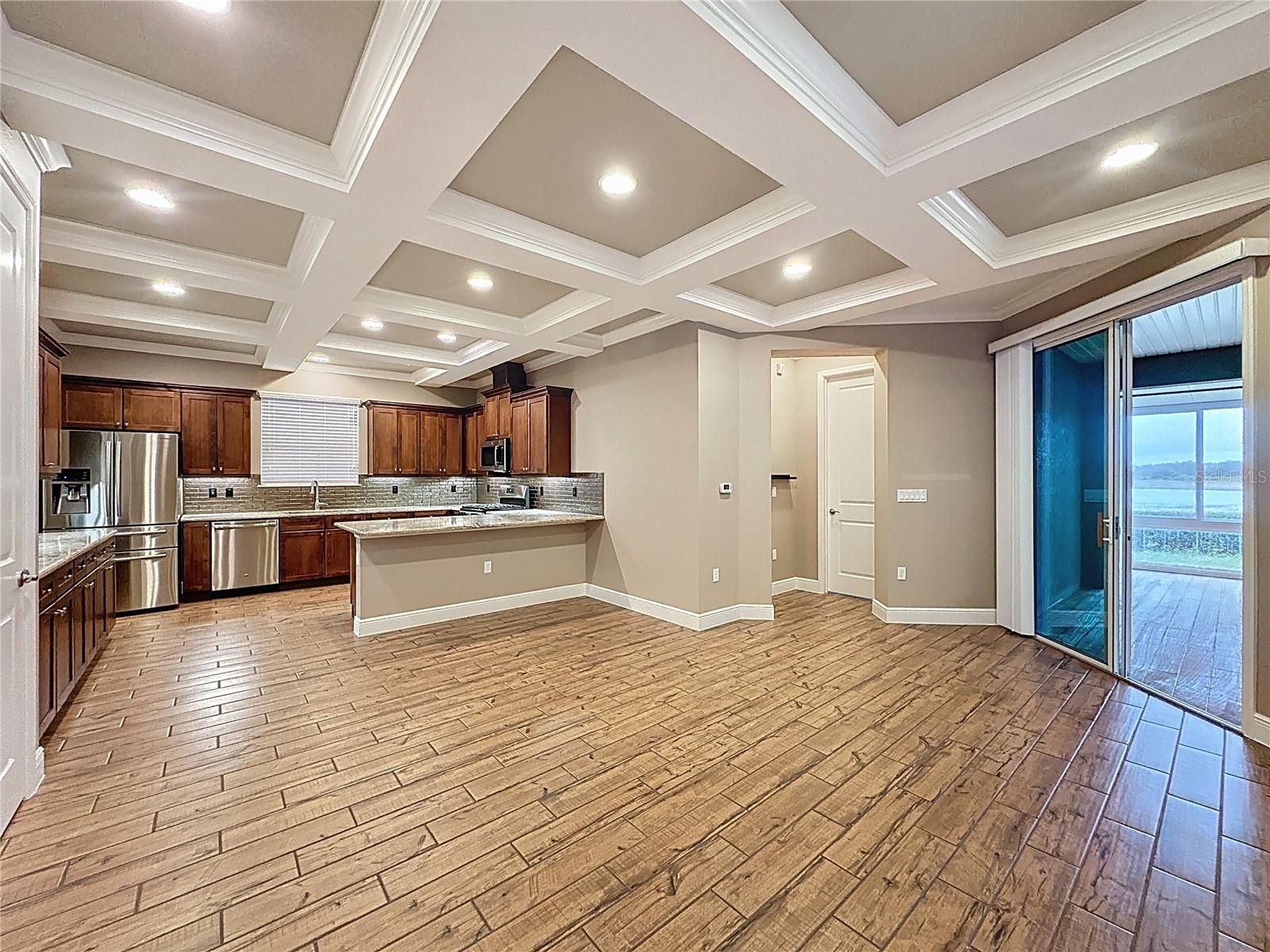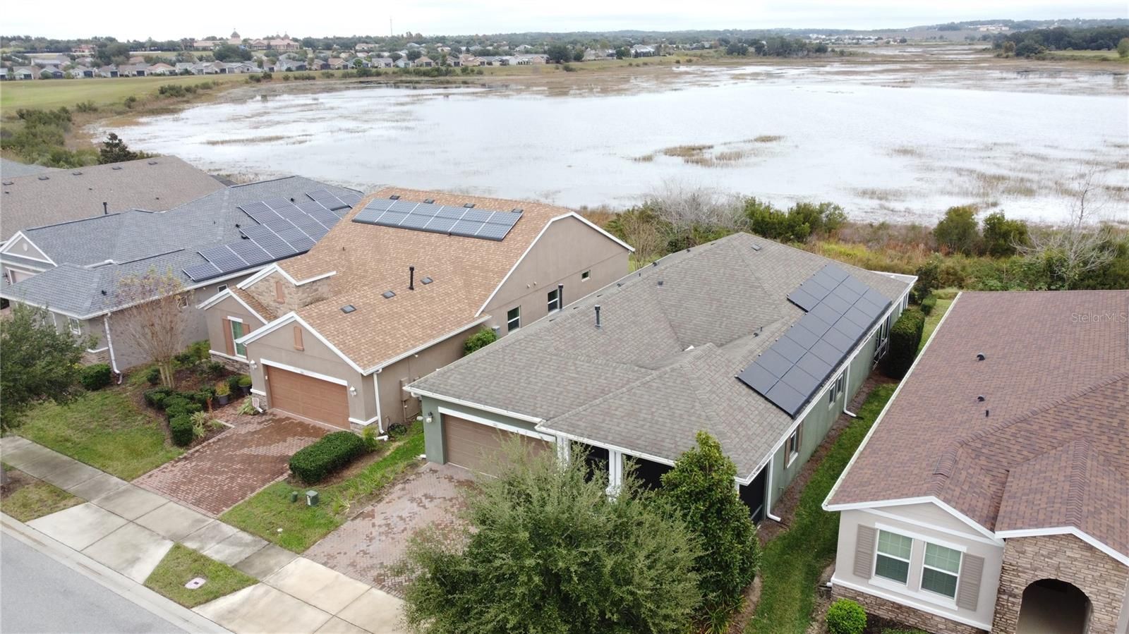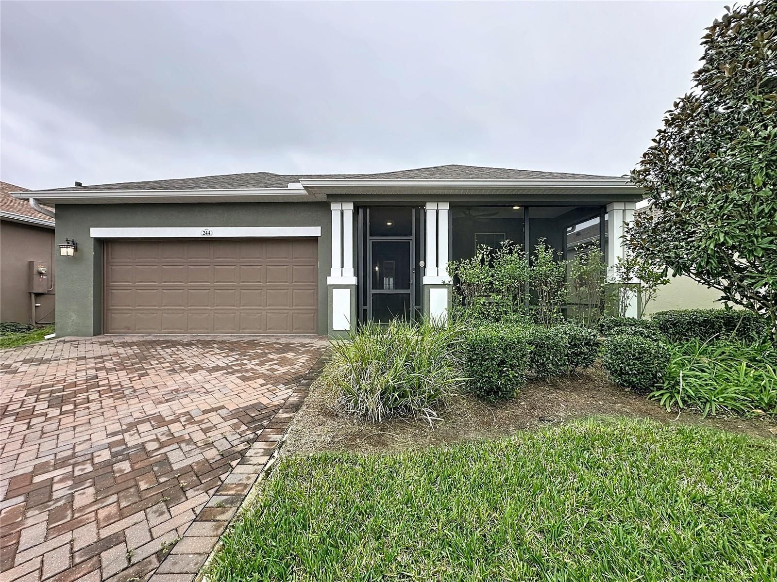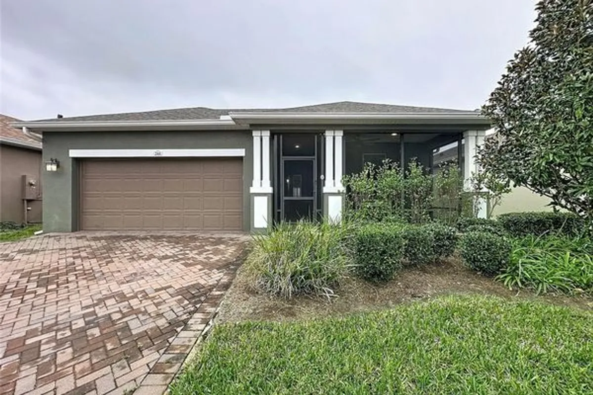 One or more photo(s) has been virtually staged. Live Your Best Life in Trilogy! As soon as you step inside, your eyes are drawn straight to the sparkling water views—an immediate reminder that this is lakefront living at its finest. Serenity surrounds you with no rear neighbors, a peaceful backdrop, and an enclosed Florida Room overlooking School House Lake, complete with its own A/C unit and built-in remote-controlled fireplace for year-round comfort. This thoughtfully designed home offers upgraded porcelain wood-look plank floors throughout *NO CARPET*and custom concrete flooring in the Florida Room designed to mimic the warmth and beauty of wood. The open concept layout is enhanced by a coffered ceiling spanning the kitchen, dining, and great room, creating both volume and elegance. The inviting front porch is screened and covered, outdoor living. The kitchen offers solid wood cabinetry with an abundance of cabinets, large Island, designer backsplash and granite countertops. Stainless steel appliances and Open Concept. Smart Space combining laundry, storage, and office functionality—highly sought after and beautifully efficient. The expanded primary bedroom includes an additional A/C unit for comfort. The ensuite features: *Walk-in shower*Granite counters & dual sinks*Private commode with custom shelving*Spacious walk-in closet* Linen Closet* GUEST RETREAT is a private guest bedroom and an impressively spacious ADA-accessible bathroom. Flex space ideal for a den, hobby room, fitness area, or extra seating. Expanded 4’ garage extension with built-in cabinets for storage. Tesla Solar System transfers at no cost, providing energy savings and efficiency. Located in a gated community on private roads within a golf-cart-friendly community. Community Perks: This guard-gated, resort-style community offers more than just a home; it delivers a lifestyle! The HOA covers cable, high-speed internet, security monitoring, and landscaping/ lawn care so you can focus on enjoying your time. At the heart of it all is the spectacular 57,000 sq ft Magnolia House, where you’ll enjoy Member-exclusive restaurant and bar with live entertainment. Indoor/outdoor heated pools & a state-of-the-art athletic club, Artisan studio, poker room, culinary kitchen, and creative spaces. Sports courts for tennis, pickleball, bocce, billiards & virtual golf,50+ active, member-led clubs for every hobby and interest. A show-stopping Event Center with a stage and professional AV setup. This isn’t just a home, it’s a lifestyle upgrade where you’ll find connection, wellness, excitement, and belonging every day. Conveniently located 45 minutes to Theme Parks, including Universal and Disney World, and Orlando International Airport, 1 ½ hour to Beaches and Port Canaveral Cruise Terminal. This isn’t just a home — it’s a lifestyle upgrade. Live your BEST LIFE at Trilogy!