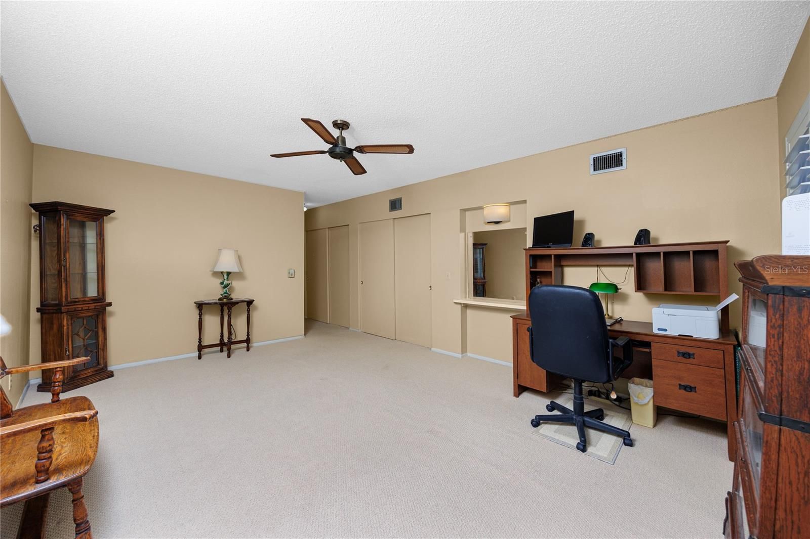 - Built-in Features, Ceiling Fan(s), Eat-in Kitchen, High Ceilings, Living/Dining Room, Open Floorplan, Solid-Wood Cabinets, Split Bedrooms, Stone Counters, Thermostat