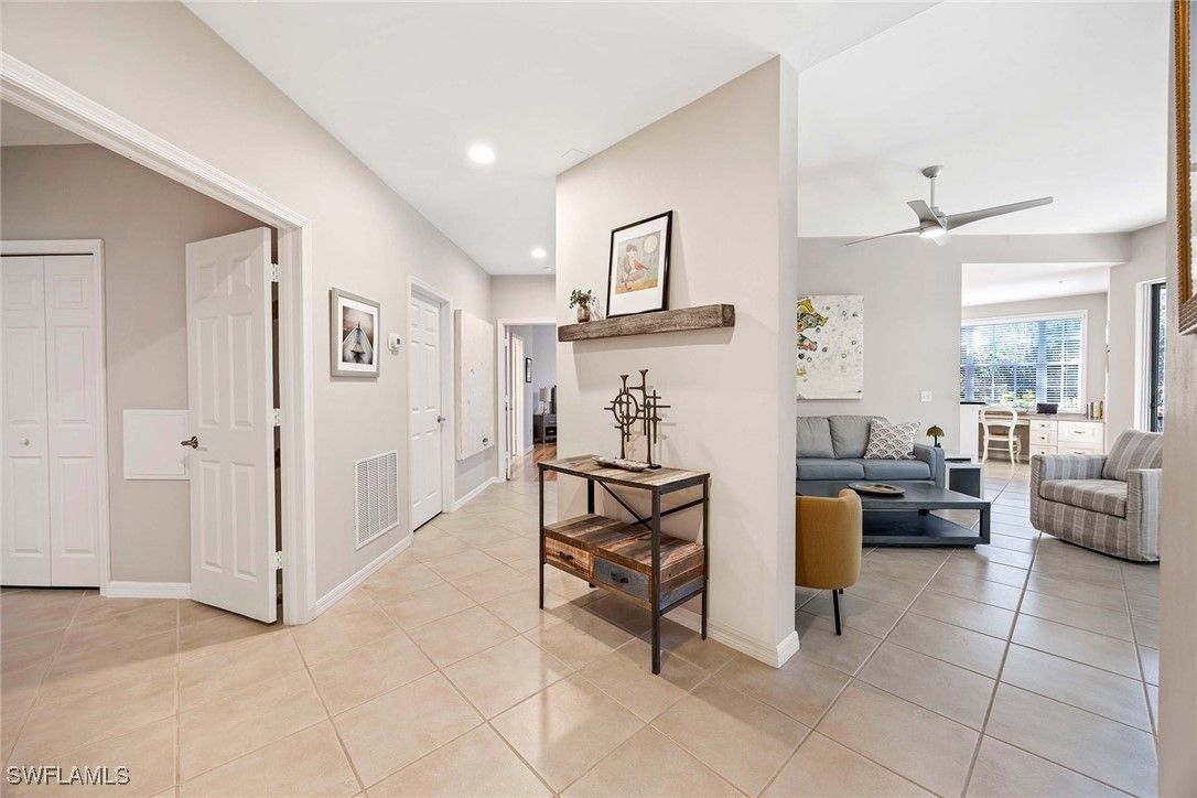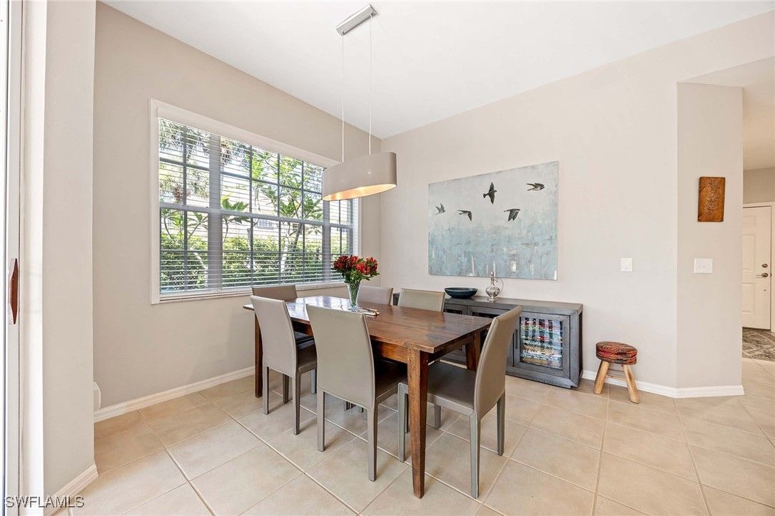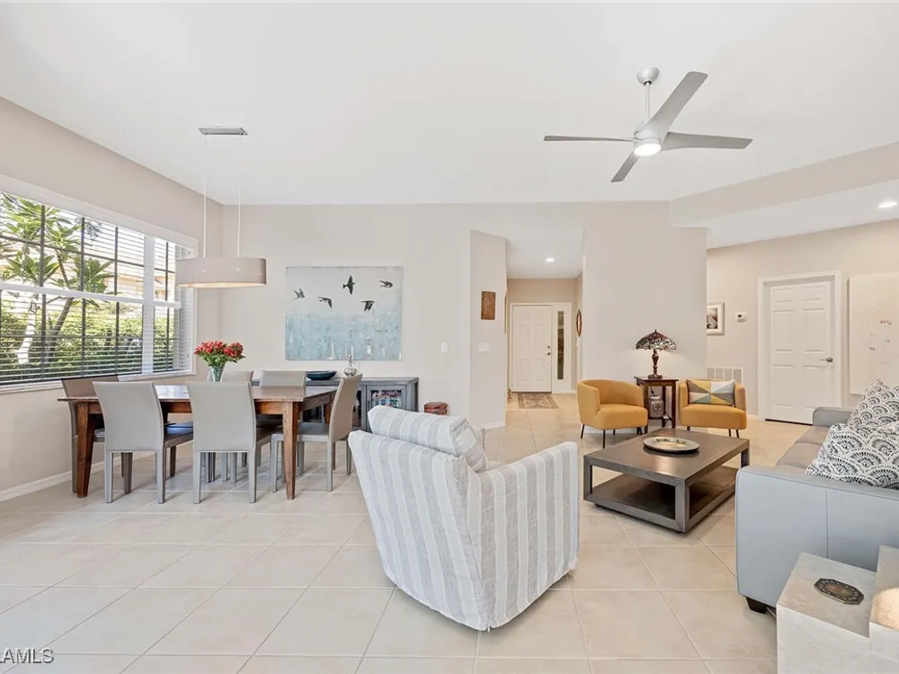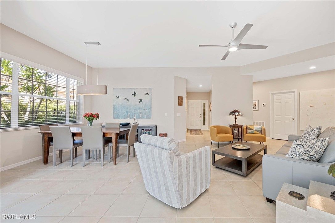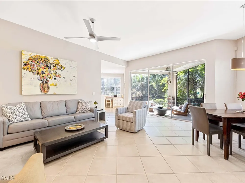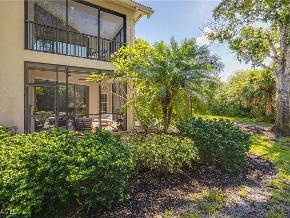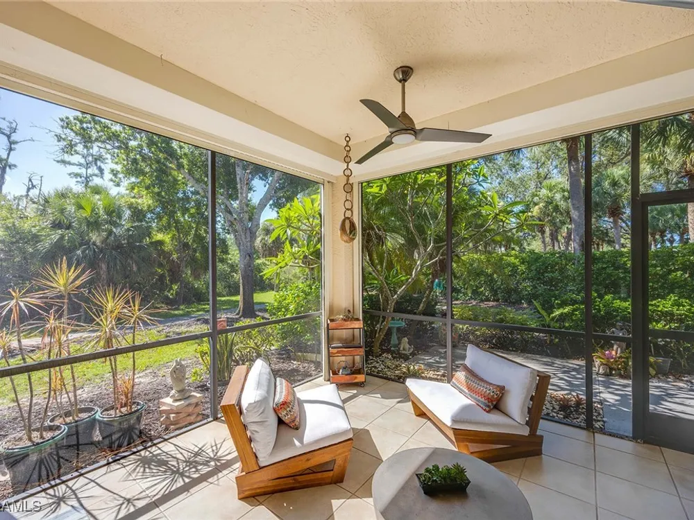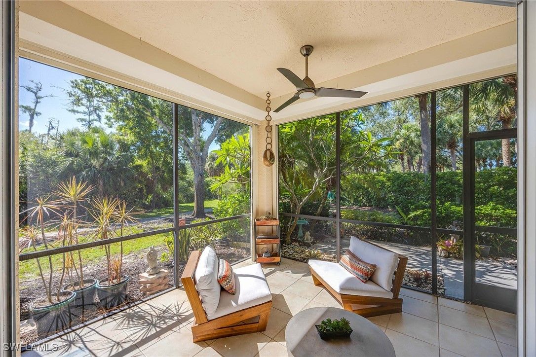 Nestled within the verdant, tropical landscape of The Reserve at Pelican Landing, this meticulously maintained coach home presents an exceptional living experience. The residence features three well-proportioned bedrooms, two bathrooms, and 1,640 square feet of carefully planned living space. The open-concept design seamlessly integrates the living and dining areas, enhanced by elegant tile flooring throughout the main living spaces, with ample storage provided by generous closet space. Recent upgrades include sophisticated Hunter Douglas window treatments, contemporary ceiling fans, and updated lighting fixture. Expansive sliding glass doors lead to a screened lanai equipped with storm shutters, offering panoramic views of the surrounding nature preserve and fostering an effortless connection between indoor and outdoor living. A private outdoor patio provides an additional space for relaxation and contemplation. Residents benefit from convenient access to a resort-style amenity center located directly across the street, featuring a totally re-finished pool and spa, as well as an outdoor kitchen complete with dual grills.