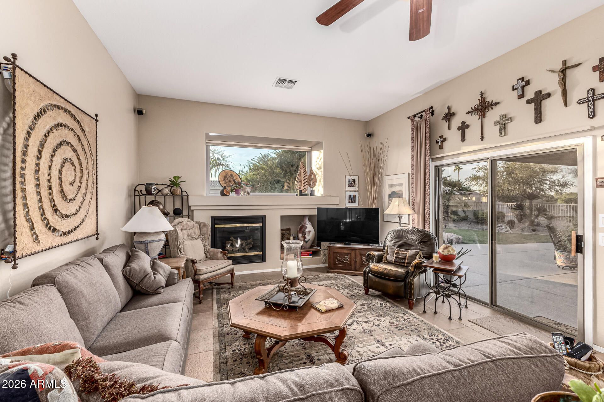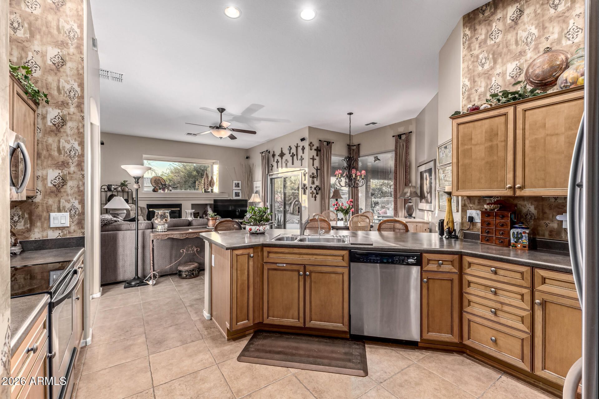 Beautiful, expanded Milano model. Courtyard entry. Versatlle floorplan with dual living areas. Neutral tile and carpets thoughout. Kitchen features high end cabinetry in today's warm earth tones, stainless appliances , refrigerator with craft ice and barstool seating. Cozy gas fireplace in family room. Master suite has newer Anderson windows, 2 closets and walk in shower. Guestroom on opposite side for maximum privacy. Office easily converted to a third sleeping area when needed. Expanded laundry room offers additional storage. Extended length garage will accomodate larger vehicles. Garage storage and workbench. Corner lot offers privacy, views and fabulous sunsets. Easy care artificial turf in backyard. Extended patio is perfect for entertaining. Close to access gates and club amenities