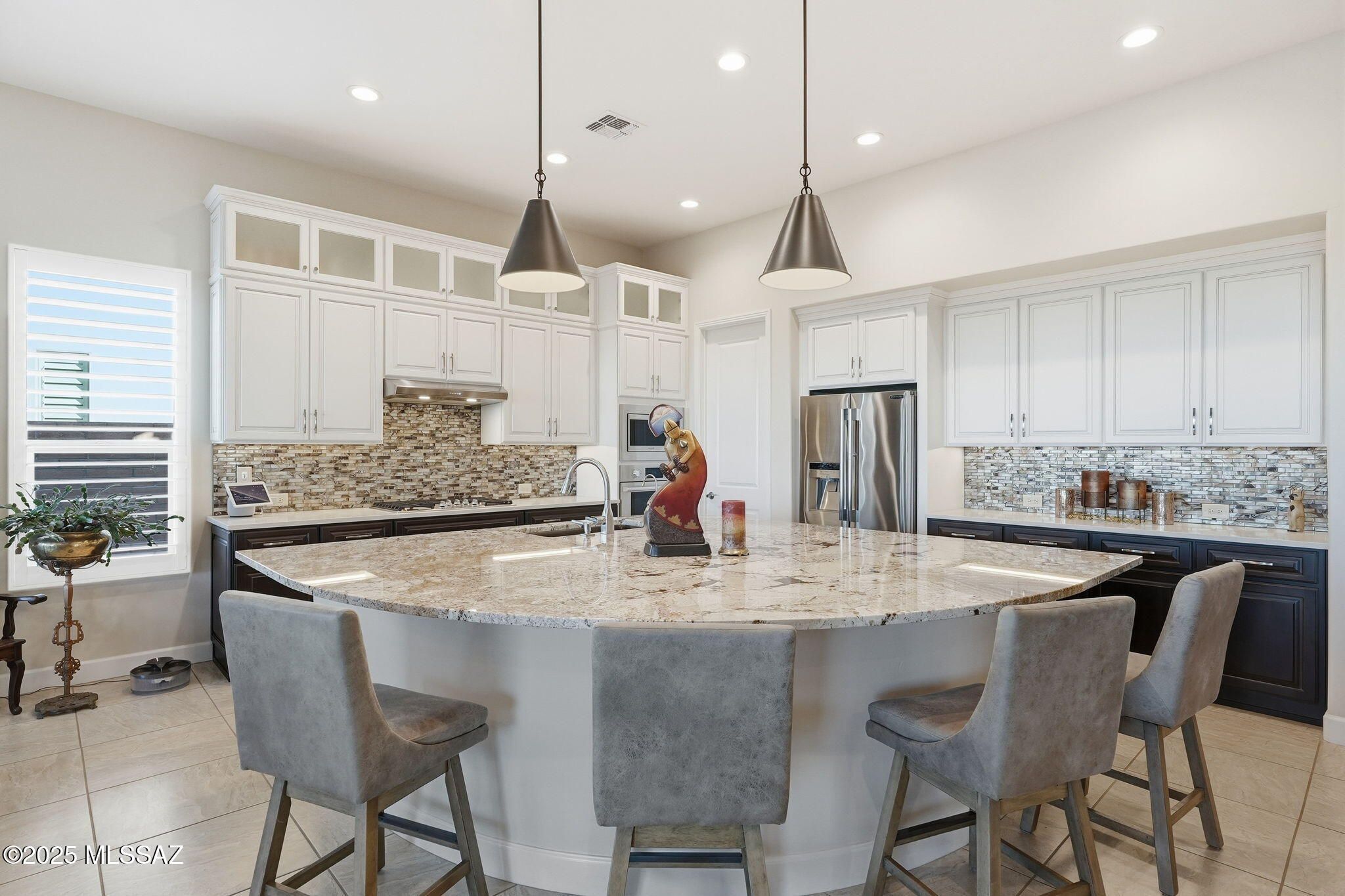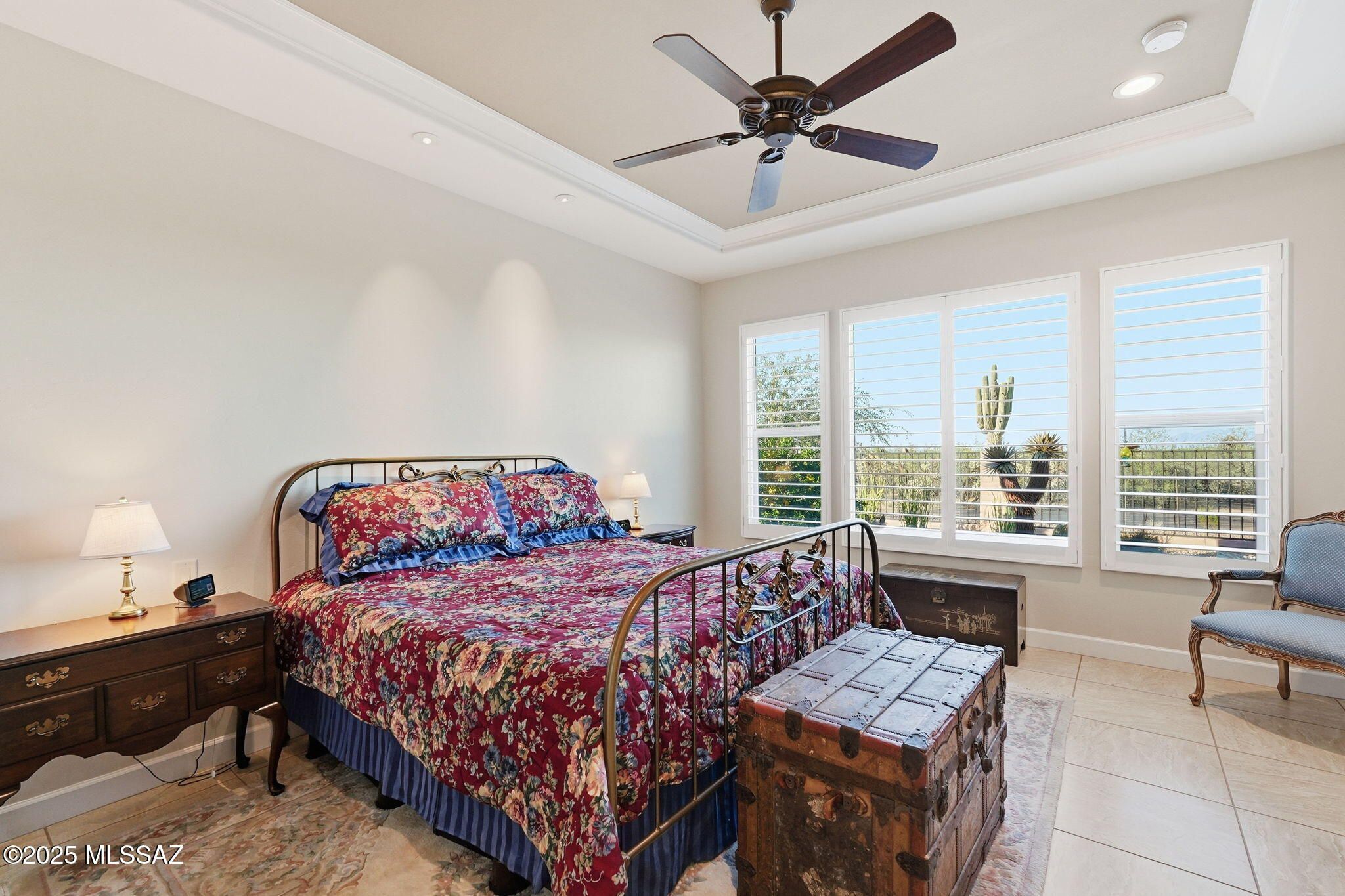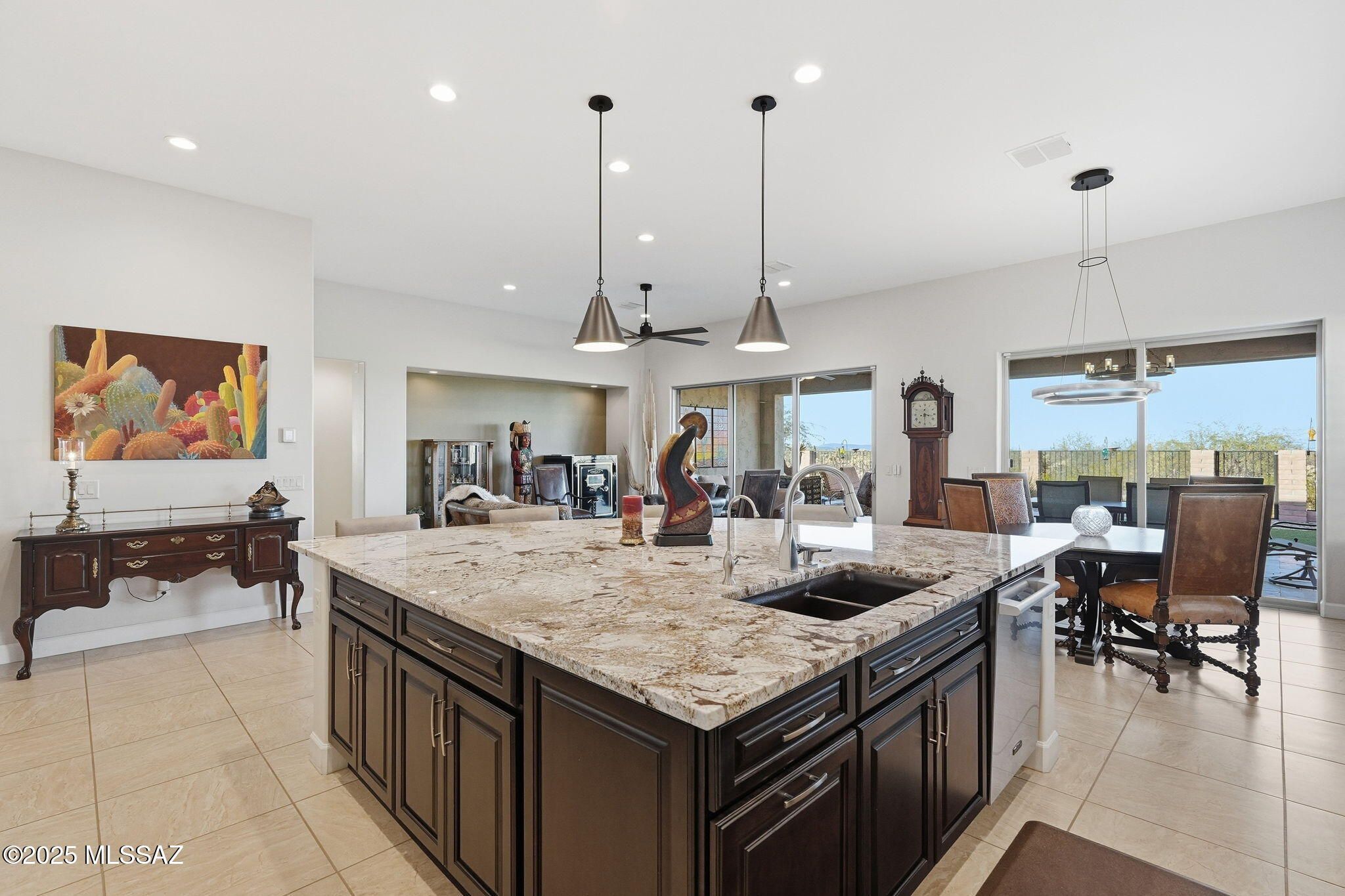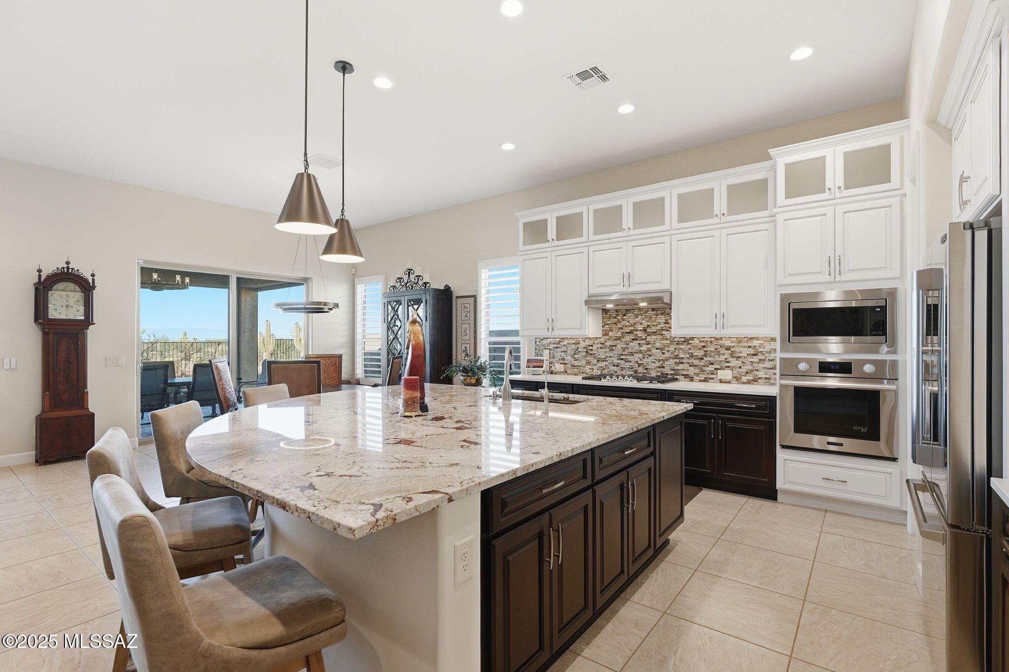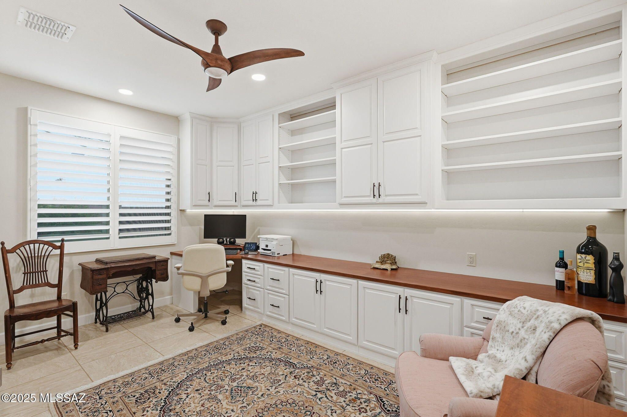 This magnificent Vienta floor plan is a true shining star of Quail Creek, offering breathtaking panoramic north-facing views and an exceptional level of quality throughout. From the moment you arrive, the home impresses with its striking curb appeal, enclosed front courtyard, and private casita with a tiled shower with glass door--perfect for guests, hobbies, or a quiet retreat.Inside, thoughtful upgrades and architectural details abound. Coffered ceilings grace the foyer, primary suite, and den, while upgraded cabinetry, crown molding, 5.25-inch baseboards, plantation shutters, and high-end ceiling fans elevate every room. The expansive kitchen is a showstopper with an extra-large granite island, additional upper cabinetry, soft-close and roll-out shelves, RO water system, and a