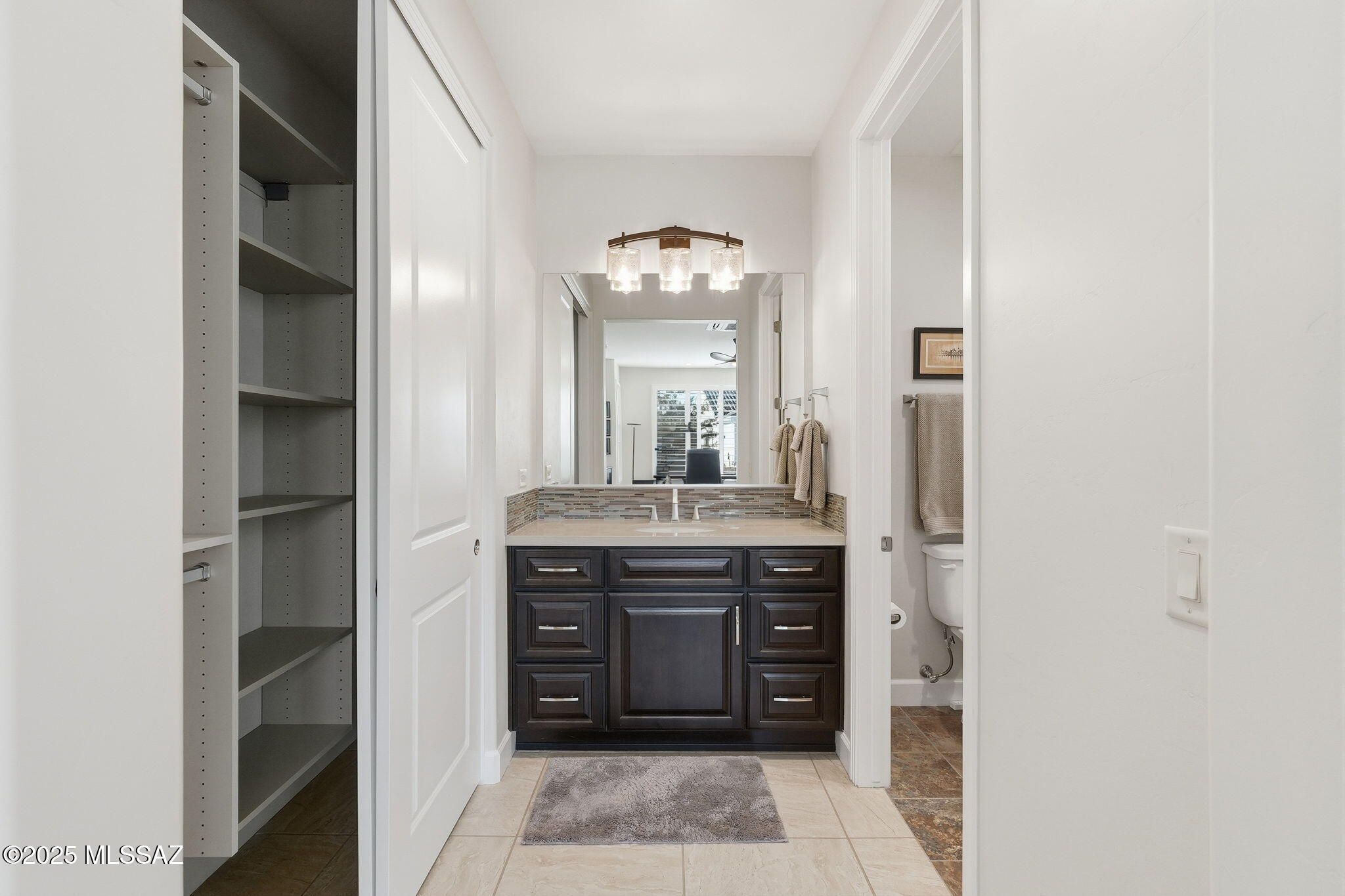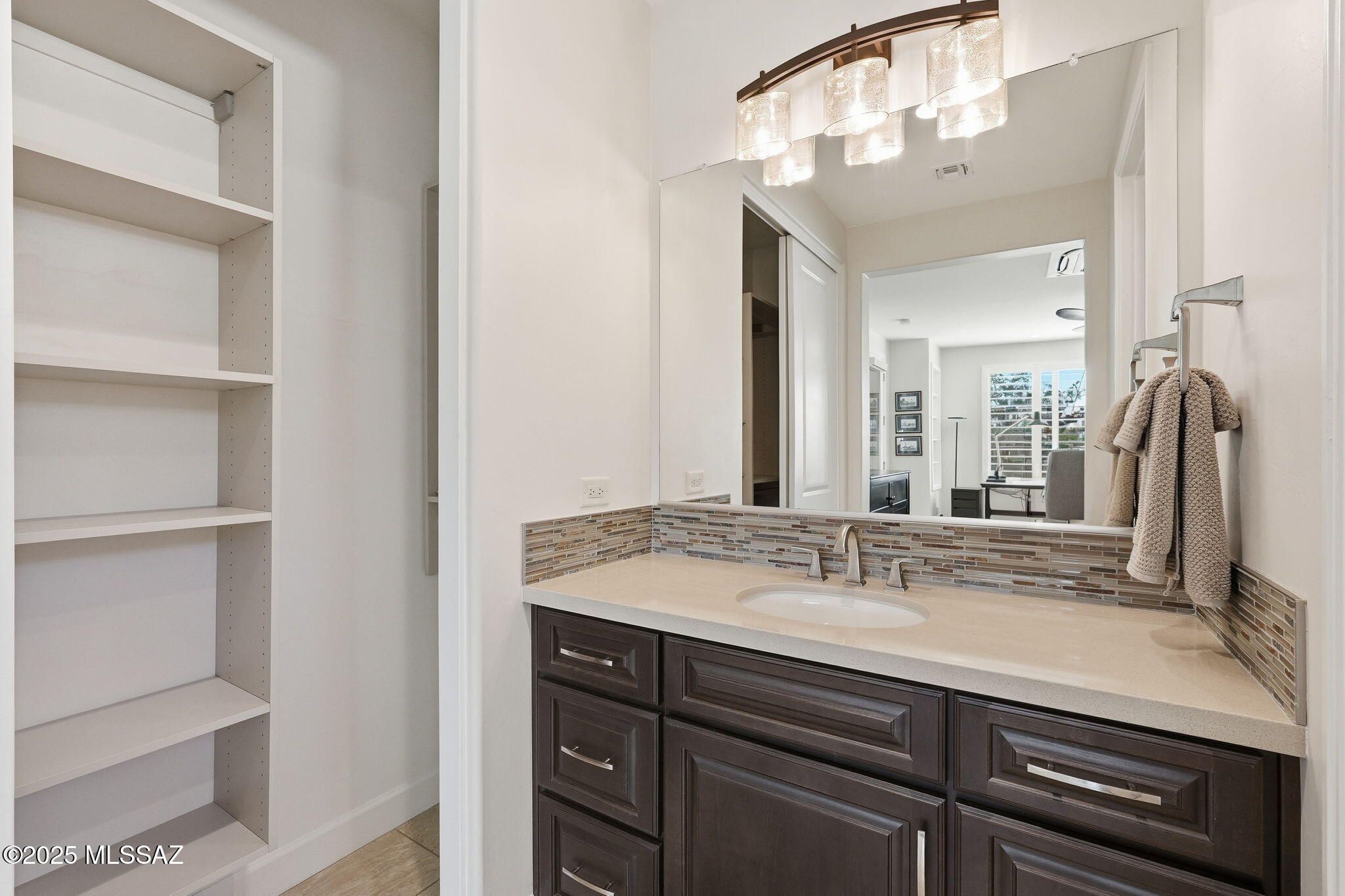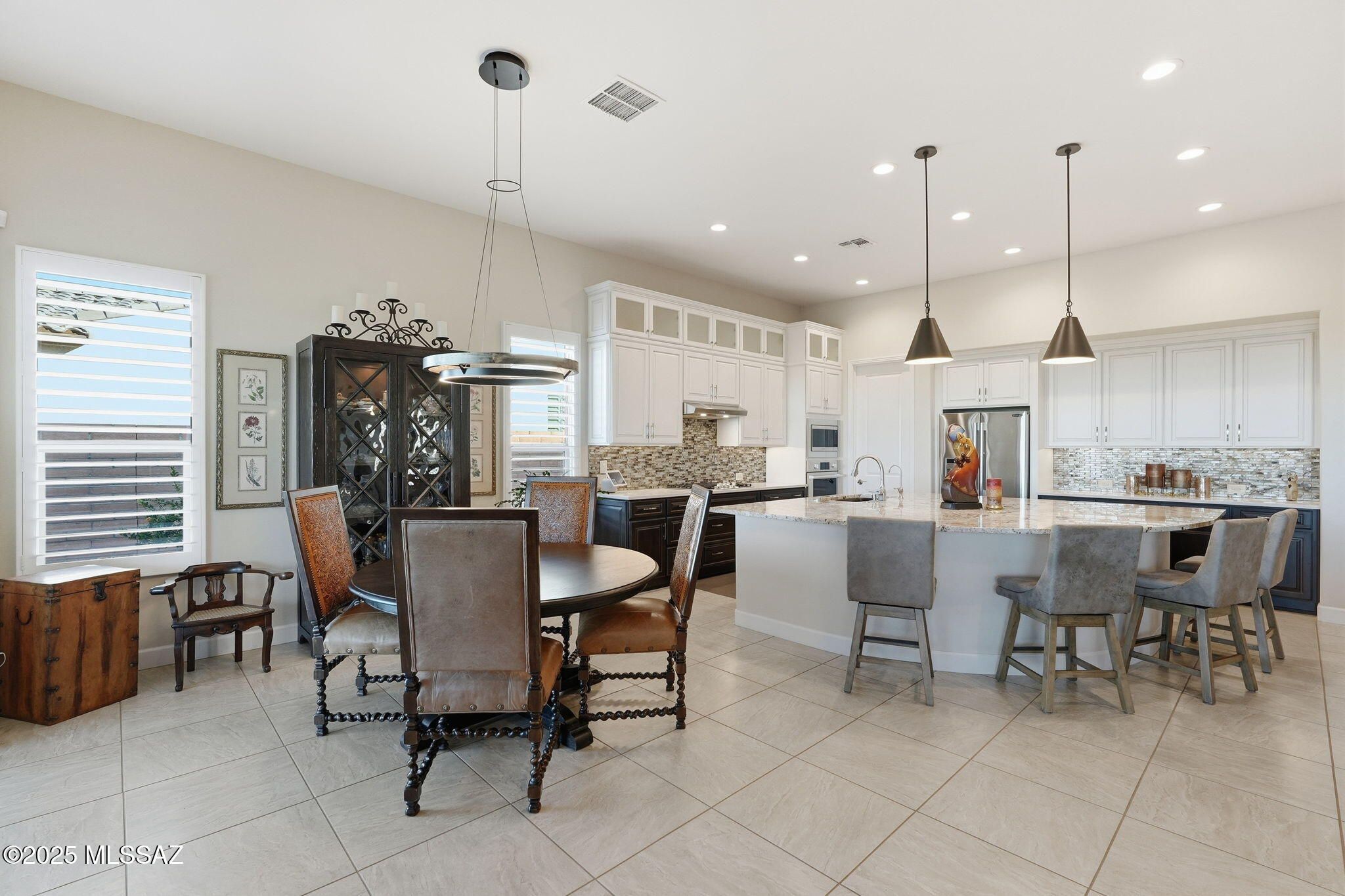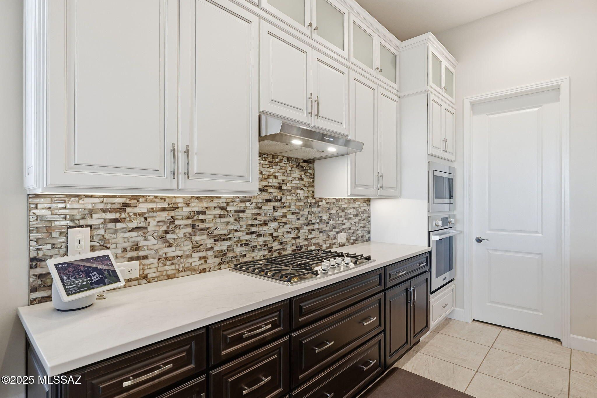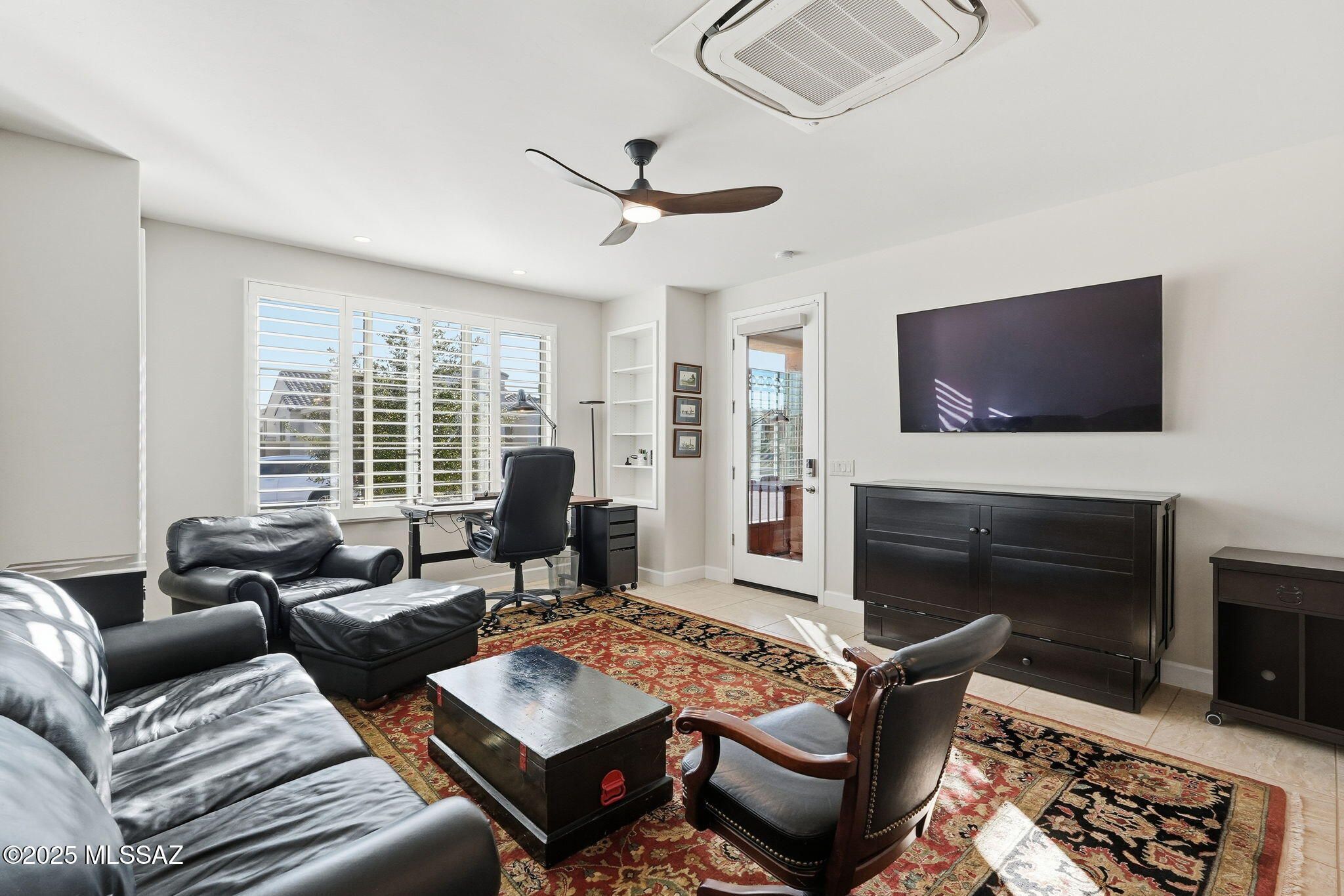 This magnificent Vienta floor plan is a true shining star of Quail Creek, offering breathtaking panoramic north-facing views and an exceptional level of quality throughout. From the moment you arrive, the home impresses with its striking curb appeal, enclosed front courtyard, and private casita with a tiled shower with glass door--perfect for guests, hobbies, or a quiet retreat.Inside, thoughtful upgrades and architectural details abound. Coffered ceilings grace the foyer, primary suite, and den, while upgraded cabinetry, crown molding, 5.25-inch baseboards, plantation shutters, and high-end ceiling fans elevate every room. The expansive kitchen is a showstopper with an extra-large granite island, additional upper cabinetry, soft-close and roll-out shelves, RO water system, and a