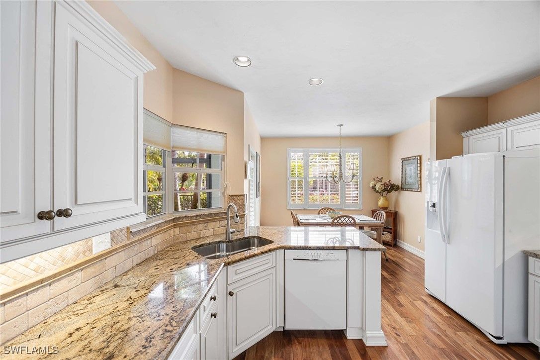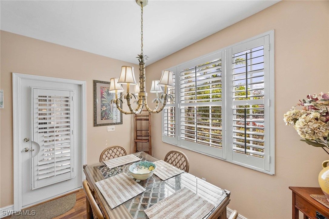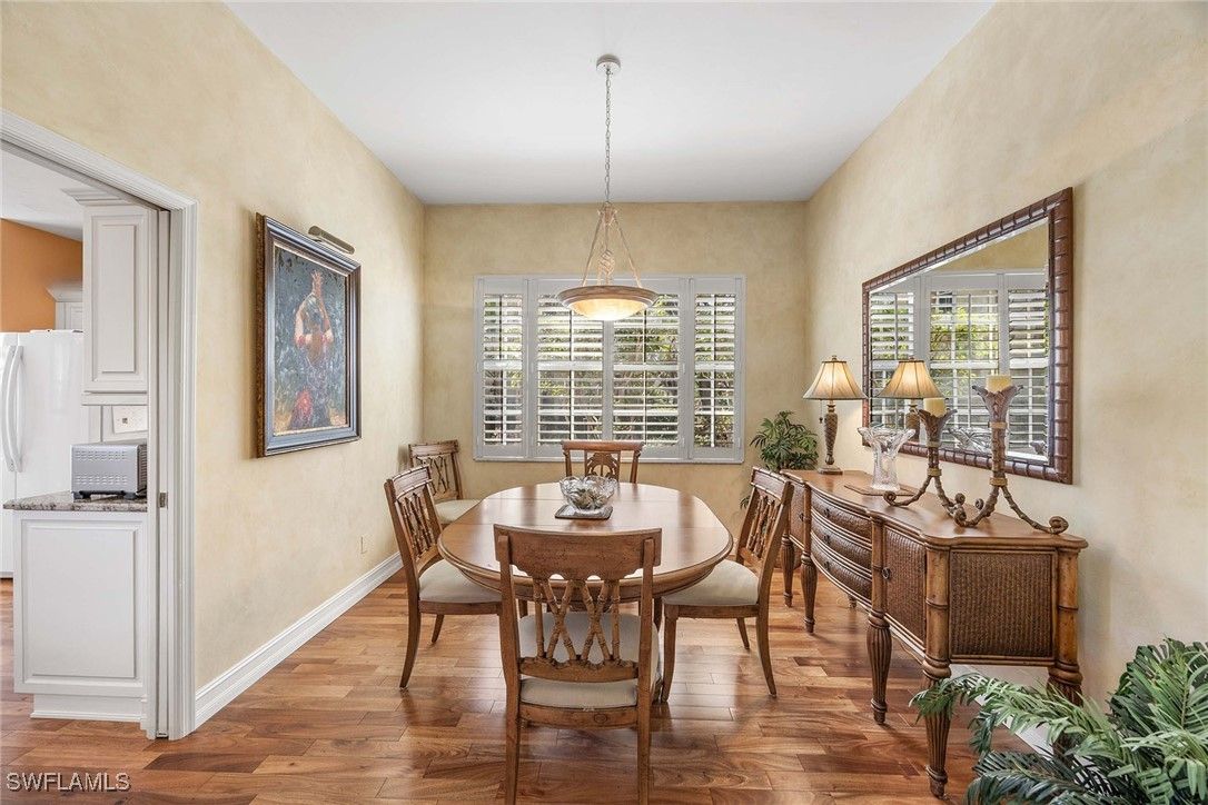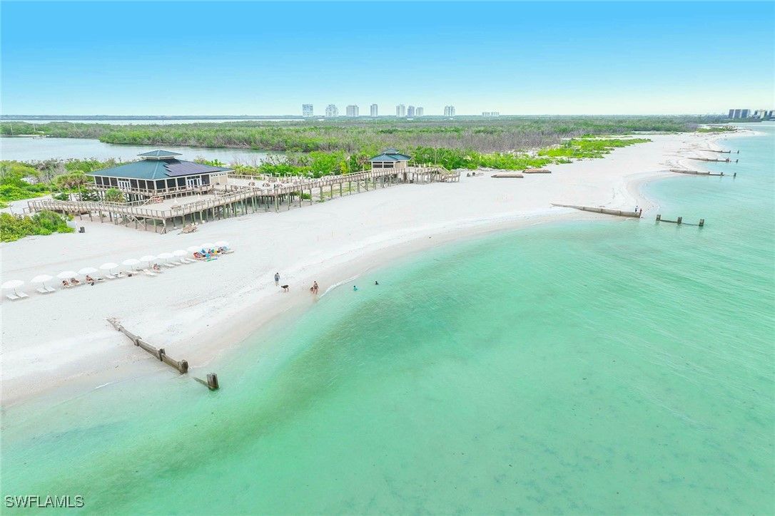 The three-bedroom, two-bath residence offers 1,789 square feet of interior living space and was built in 1995. Hardwood flooring extends throughout the living areas and bedrooms, with tile flooring in both baths. Ten-foot ceilings contribute to an open and functional floor plan. The kitchen and baths feature an earlier remodel and provide practical layouts for everyday living. The primary suite includes a walk-in closet. A spacious screened-in lanai overlooks the community pool and is equipped with electric storm shutters. Additional features include a single-car attached garage and a location that is not within a flood zone. Community amenities include a private island beach, community pool, fitness room, additional fitness center located in the community building, pickle ball and tennis courts, sailing and multiple barbecue areas. Conveniently situated near shopping and dining, this residence offers a well-maintained opportunity in a desirable Bonita Springs community.
