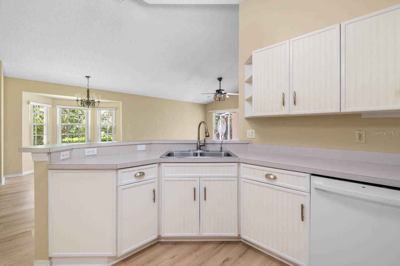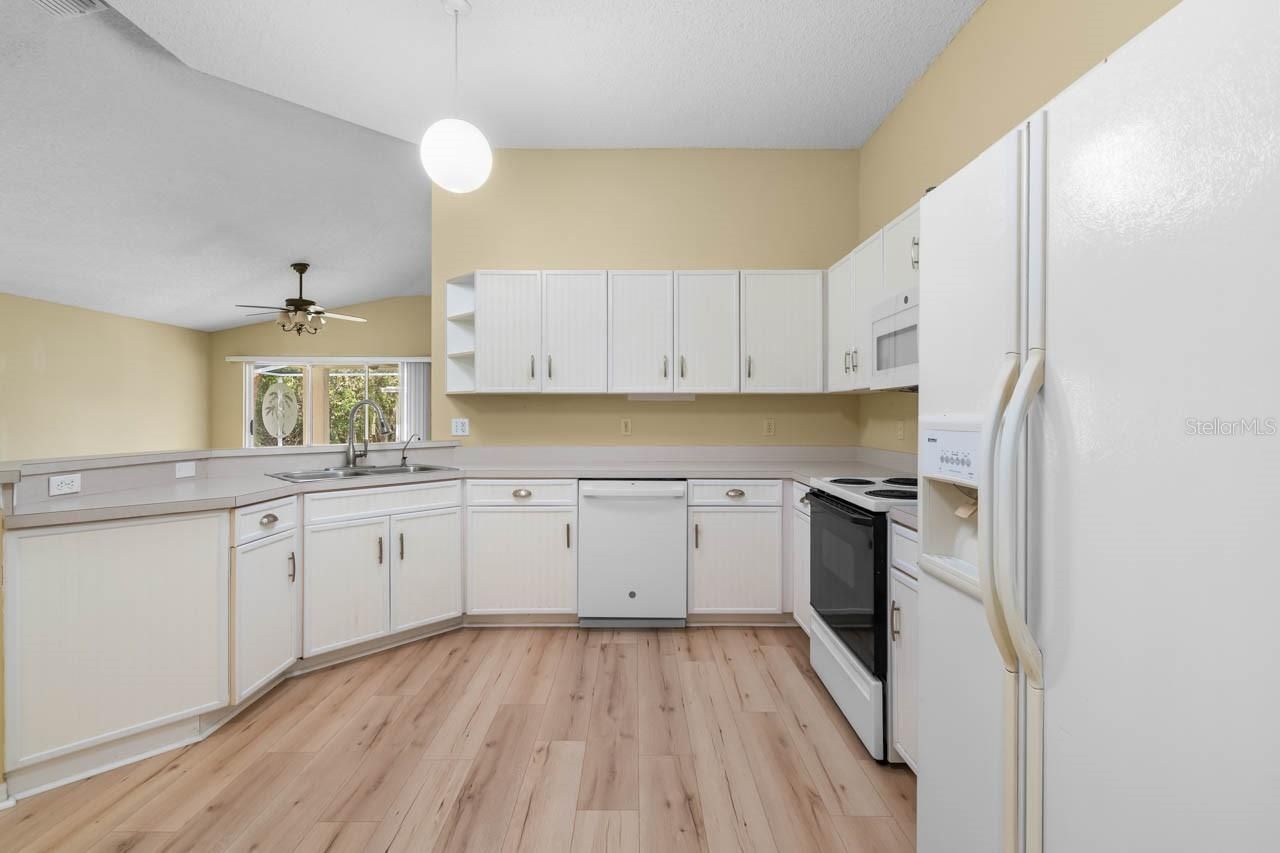 MOVE-IN READY 2-bed, 2-bath, 1-car garage home now available in the beautiful, active 55+ community of Kings Point! Covered front porch, oversized COVERED/SCREENED LANAI, PAVER DRIVEWAY, high ceilings, newer LUXURY VINYL FLOORING THROUGHOUT, mature landscaping, WATER SOFTENER, and more! The great room combines living and dining areas, has a lovely bay window, a coat closet, and provides slider access to the spacious lanai. The kitchen boasts a BREAKFAST BAR, pantry, and pocket door access to the Laundry on out to the attached garage with deep sink! The primary bedroom features an EN-SUITE BATHROOM with UPDATED single-sink vanity, shower stall, and WALK-IN CLOSET! On the other side of this SPLIT-BEDROOM LAYOUT is the secondary bathroom, with its UPDATED single-sink vanity and tub/shower combination, along with the secondary bedroom, featuring a darling window seat. Kings Point is a bustling gated and golf cart friendly community known for a myriad of recreation facilities, indoor/outdoor heated pools, a state-of-the art fitness center, arts, crafts, tennis, pickle-ball, lawn bowling, auditorium with 800+ seating and over 200 clubs & activities. Don't miss this great opportunity; schedule your showing today!