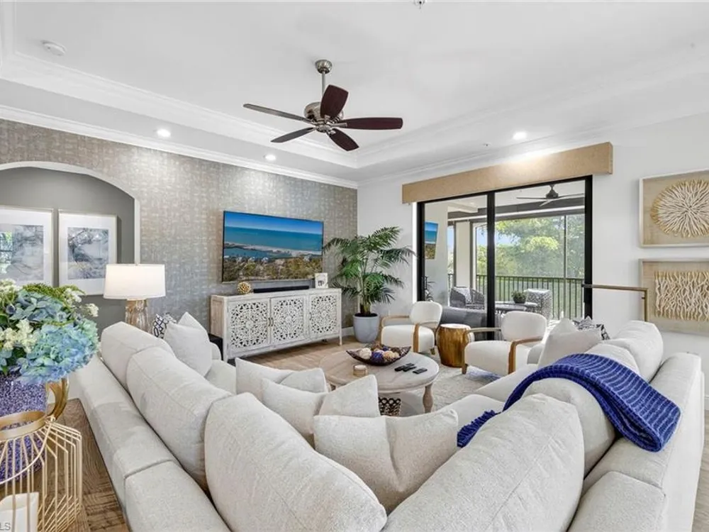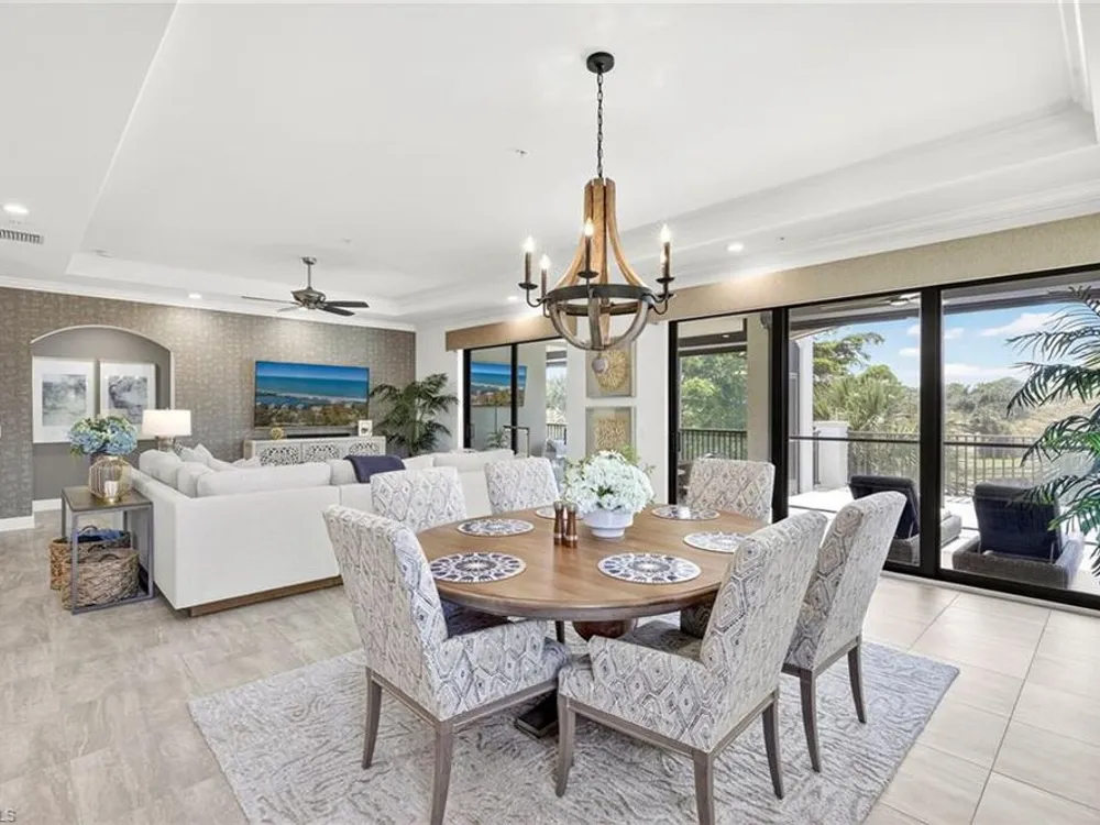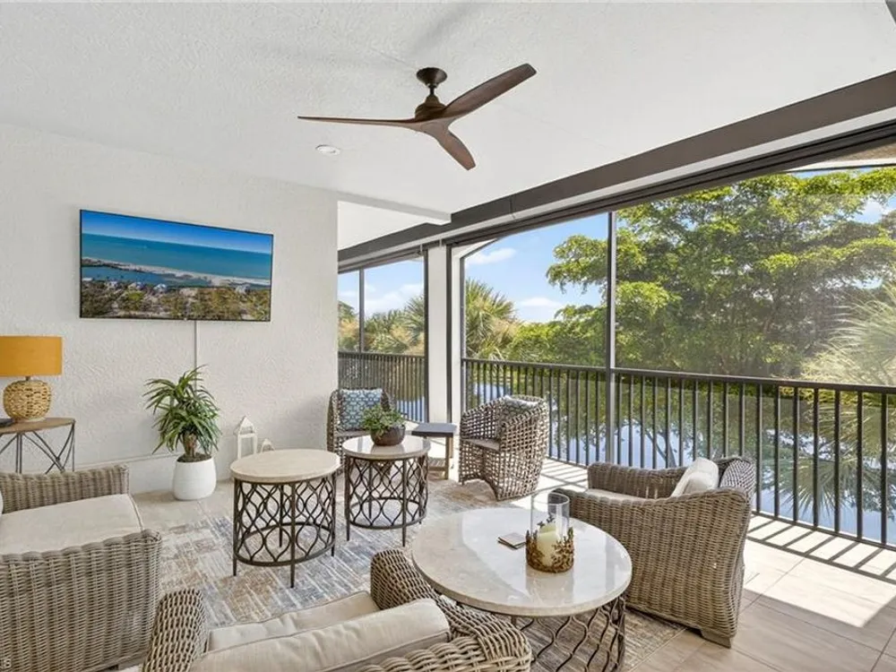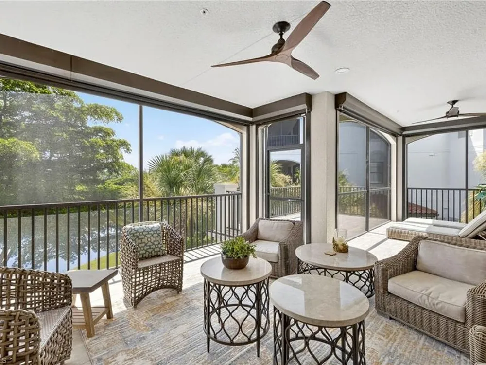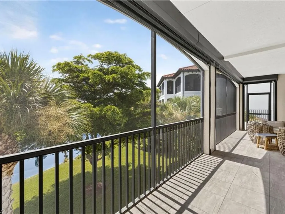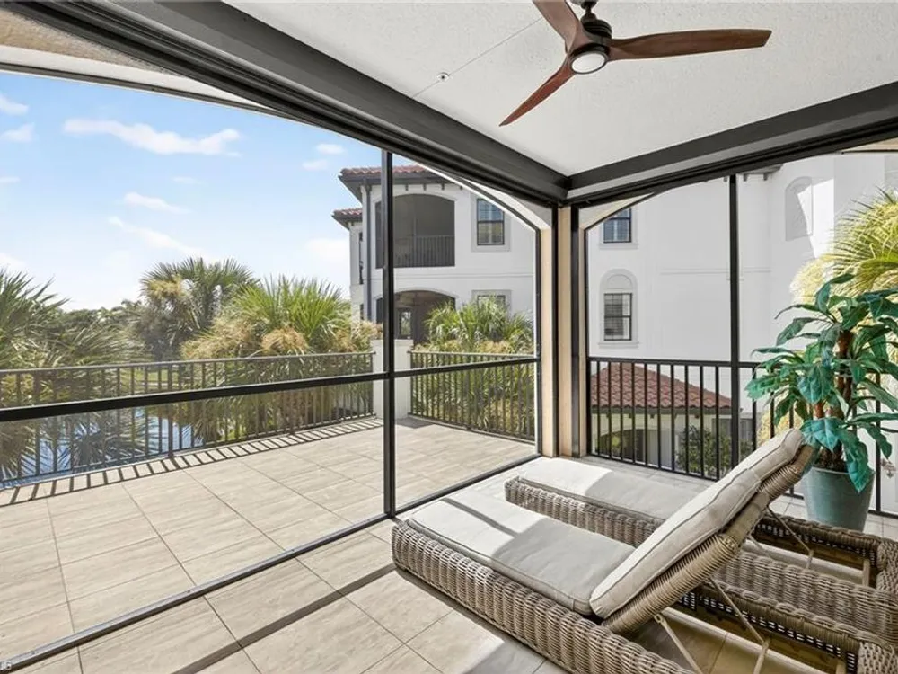 Experience Elevated Living at Terzetto in The ColonyThis stunning second-floor, furnished residence at Terzetto offers the feel of a spacious penthouse with a casual, yet elegant design. Tastefully decorated, the open-concept floor plan seamlessly connects indoor and outdoor living, ideal for both everyday comfort and effortless entertaining. Unique to second-floor units, enjoy a private open-air sun deck in addition to the expansive screened lanai—perfect for relaxing or taking in the peaceful, southern lake views. Every detail of this home reflects the highest level of upgrades, from the gourmet kitchen and luxurious bathrooms to premium flooring that extends gracefully onto the lanai. Custom features include remote-controlled electric shades in the great room, primary suite, and bath, as well as a built-in wine and beverage bar with wine cooler—adding a touch of sophistication to your entertaining space. Additional highlights include impact-resistant windows and doors throughout including electric storm shades on both the back and front balcony. 2-car private garage. This is a rare opportunity to enjoy refined living in one of The Colony’s most desirable communities.Amenities for Colony residents include dining at the Colony’s private and newly renovated Bay Club with unparalleled views of Estero Bay and kayak park. Pelican Landing amenities included in the HOA- private beach park with boat shuttle access from the community, tennis center, pickle-ball, bocce, attended fitness center and kayak park. Optional golf and sports memberships may be available at the Colony Golf Club and The Nest Country Club.