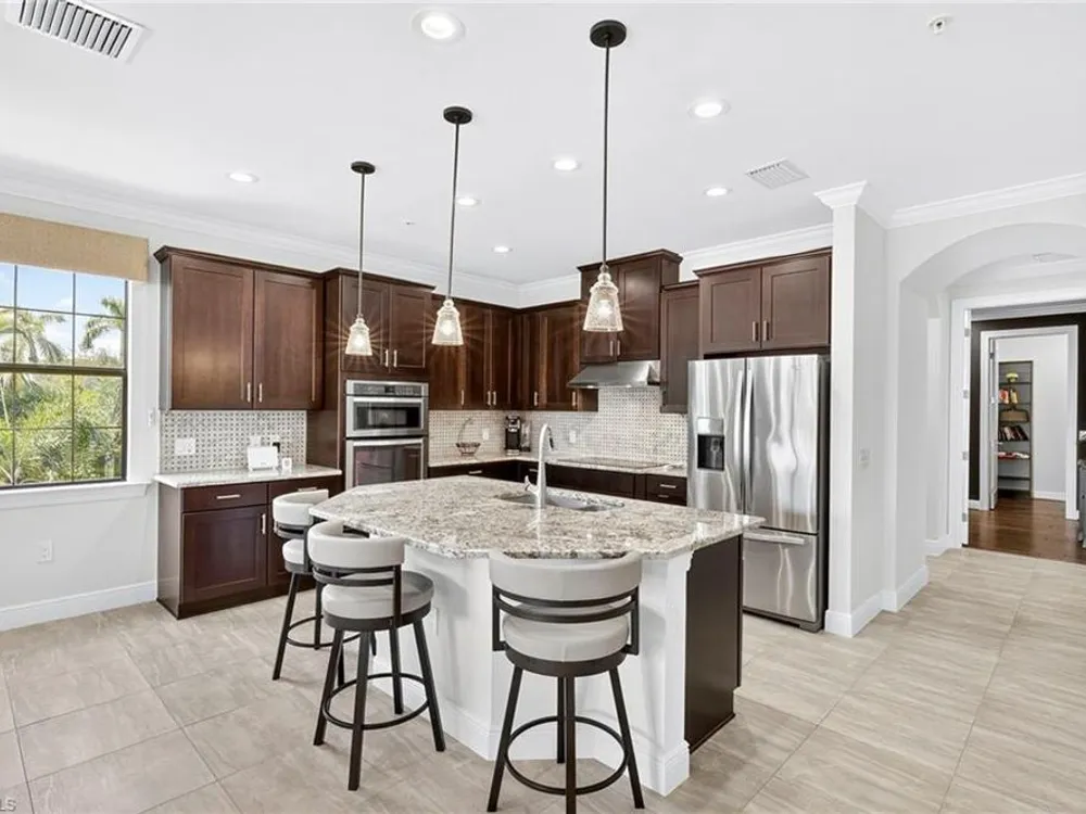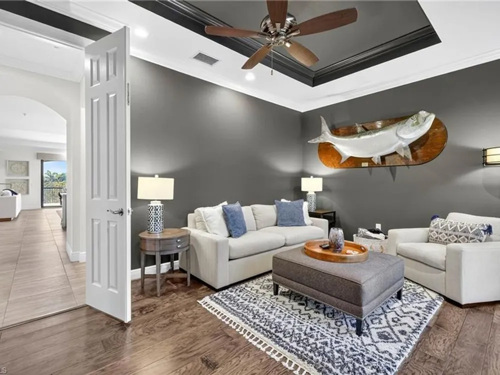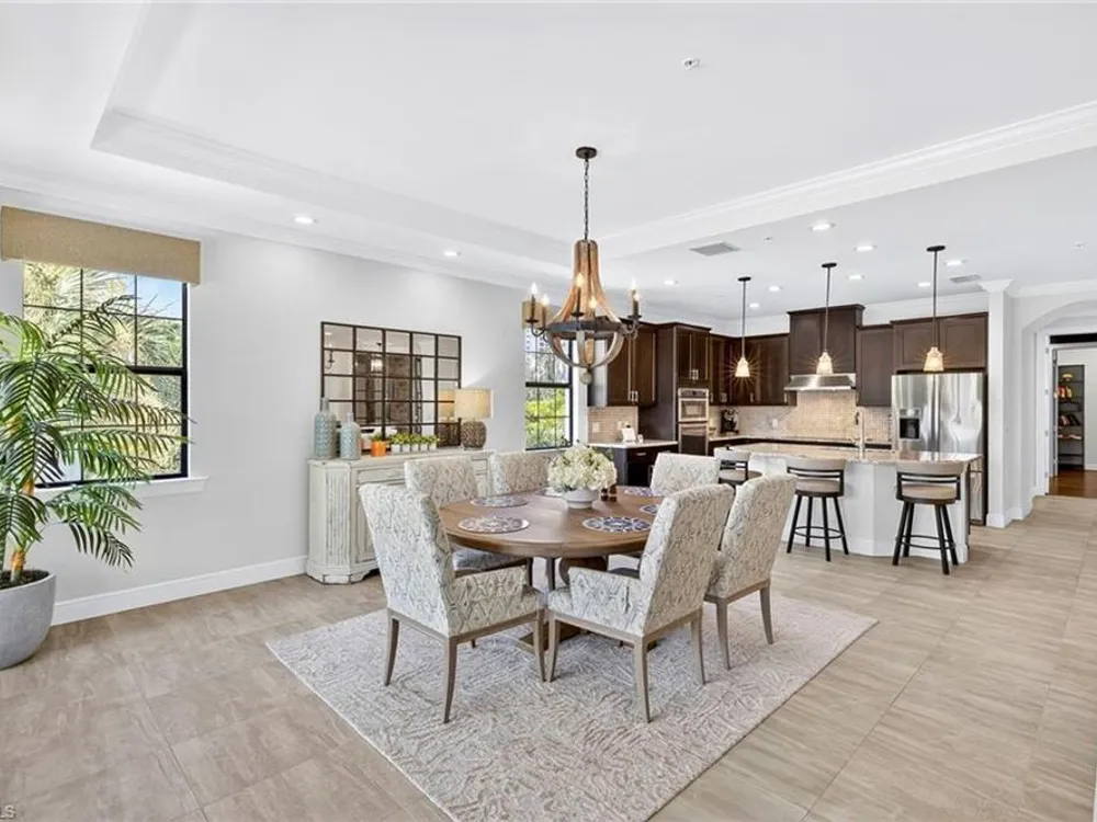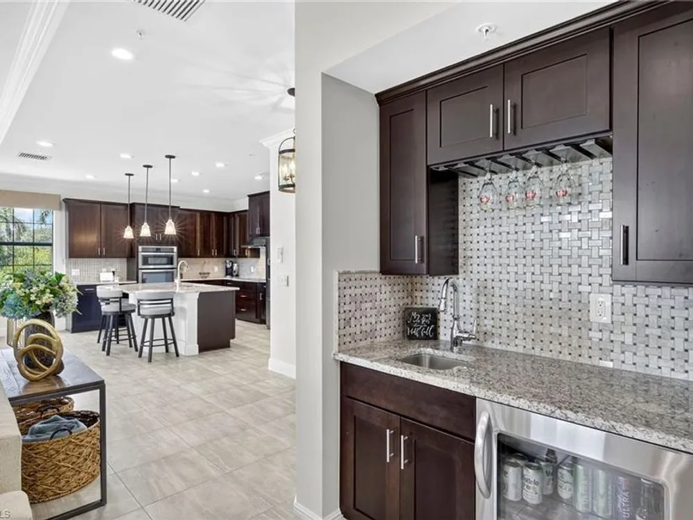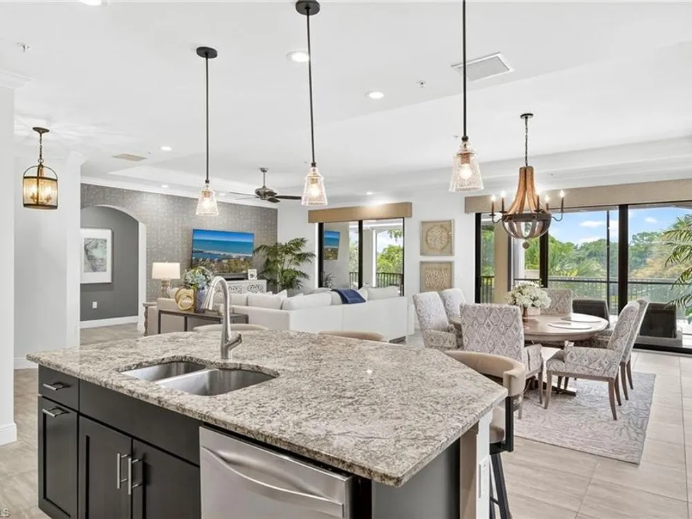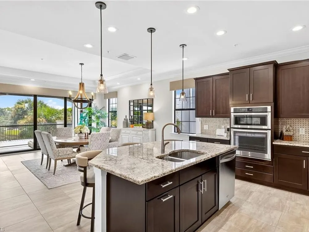 Experience Elevated Living at Terzetto in The ColonyThis stunning second-floor, furnished residence at Terzetto offers the feel of a spacious penthouse with a casual, yet elegant design. Tastefully decorated, the open-concept floor plan seamlessly connects indoor and outdoor living, ideal for both everyday comfort and effortless entertaining. Unique to second-floor units, enjoy a private open-air sun deck in addition to the expansive screened lanai—perfect for relaxing or taking in the peaceful, southern lake views. Every detail of this home reflects the highest level of upgrades, from the gourmet kitchen and luxurious bathrooms to premium flooring that extends gracefully onto the lanai. Custom features include remote-controlled electric shades in the great room, primary suite, and bath, as well as a built-in wine and beverage bar with wine cooler—adding a touch of sophistication to your entertaining space. Additional highlights include impact-resistant windows and doors throughout including electric storm shades on both the back and front balcony. 2-car private garage. This is a rare opportunity to enjoy refined living in one of The Colony’s most desirable communities.Amenities for Colony residents include dining at the Colony’s private and newly renovated Bay Club with unparalleled views of Estero Bay and kayak park. Pelican Landing amenities included in the HOA- private beach park with boat shuttle access from the community, tennis center, pickle-ball, bocce, attended fitness center and kayak park. Optional golf and sports memberships may be available at the Colony Golf Club and The Nest Country Club.