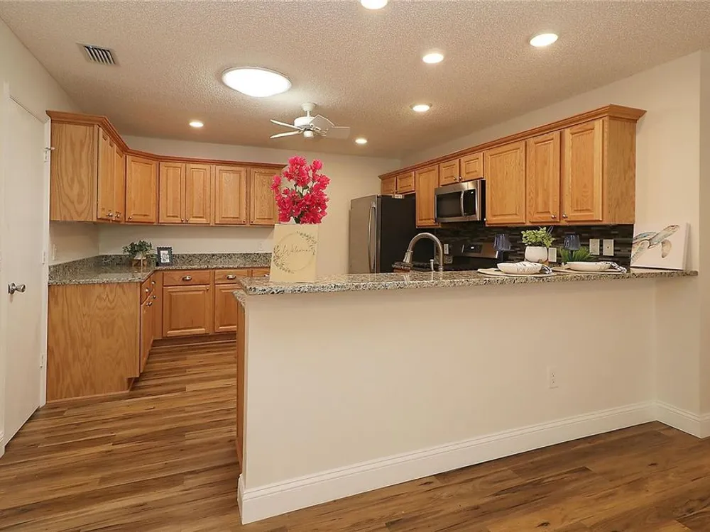 If you’ve been searching for a move-in ready patio villa with stylish updates and a fantastic location, welcome home. This 2 bedroom, 2 bath Colony model in the Southern Oaks Villas of Lynnhaven has all the right touches and a warm, inviting feel from the moment you walk in. Step into the bright kitchen, where new granite countertops, additional cabinetry with matching granite, and stainless steel appliances — including a gas range and French door refrigerator — make cooking a pleasure. A large solar tube fills the space with natural light, creating a cheerful and airy atmosphere. The upgrades continue throughout the home with granite countertops in both bathrooms, plantation shutters on the windows, and luxury vinyl plank flooring in every room — no carpet to worry about. The Primary Suite offers plenty of room for a king bed, a generous walk-in closet, and a private bath with a walk-in shower. The Guest Room is both comfortable and versatile, featuring built-ins and a cleverly designed queen-size Murphy bed with sliding cabinet doors that keep it tucked away when not in use. The guest bath has been beautifully refreshed with taller cabinets, a large storage cabinet above the toilet, and a brand-new tub/shower combination. The enclosed front lanai is the perfect place to start your day with a cup of coffee or unwind in the evening. It features tile flooring, shades for privacy, and space for comfortable seating. Practical updates mean peace of mind — the BOND is PAID, the roof was replaced in 2022, the hot water heater was replaced in 2020, and the landscaping is rock-filled for easy maintenance. Located in a friendly neighborhood just minutes from golf, recreation centers, shopping, and dining, this villa offers the perfect balance of comfort, style, and convenience.