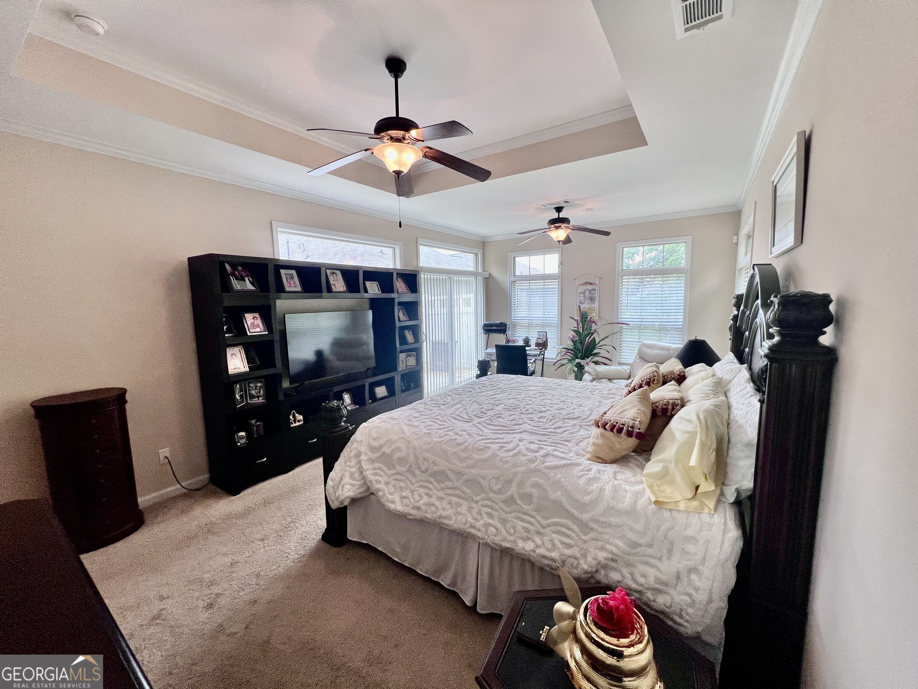 - Double Vanity, High Ceilings, In-Law Floorplan, Main Level Primary, Roommate Floorplan, Separate Shower, Split Bedrooms, Tile Bath, Tray Ceiling(s), Walk-In Closet(s), Dual Pane Window(s), Window Treatments, Entrance Foyer, Great Room, Laundry Facility, Sunroom