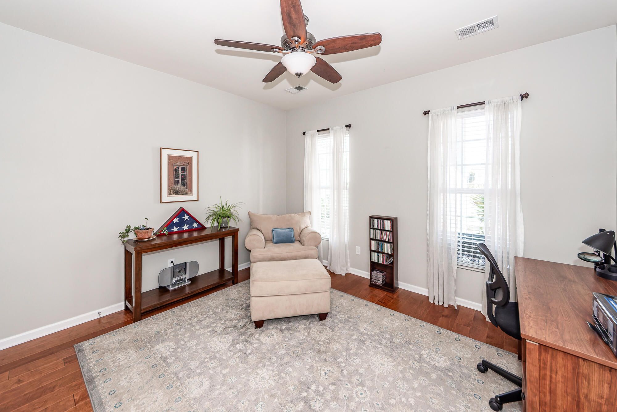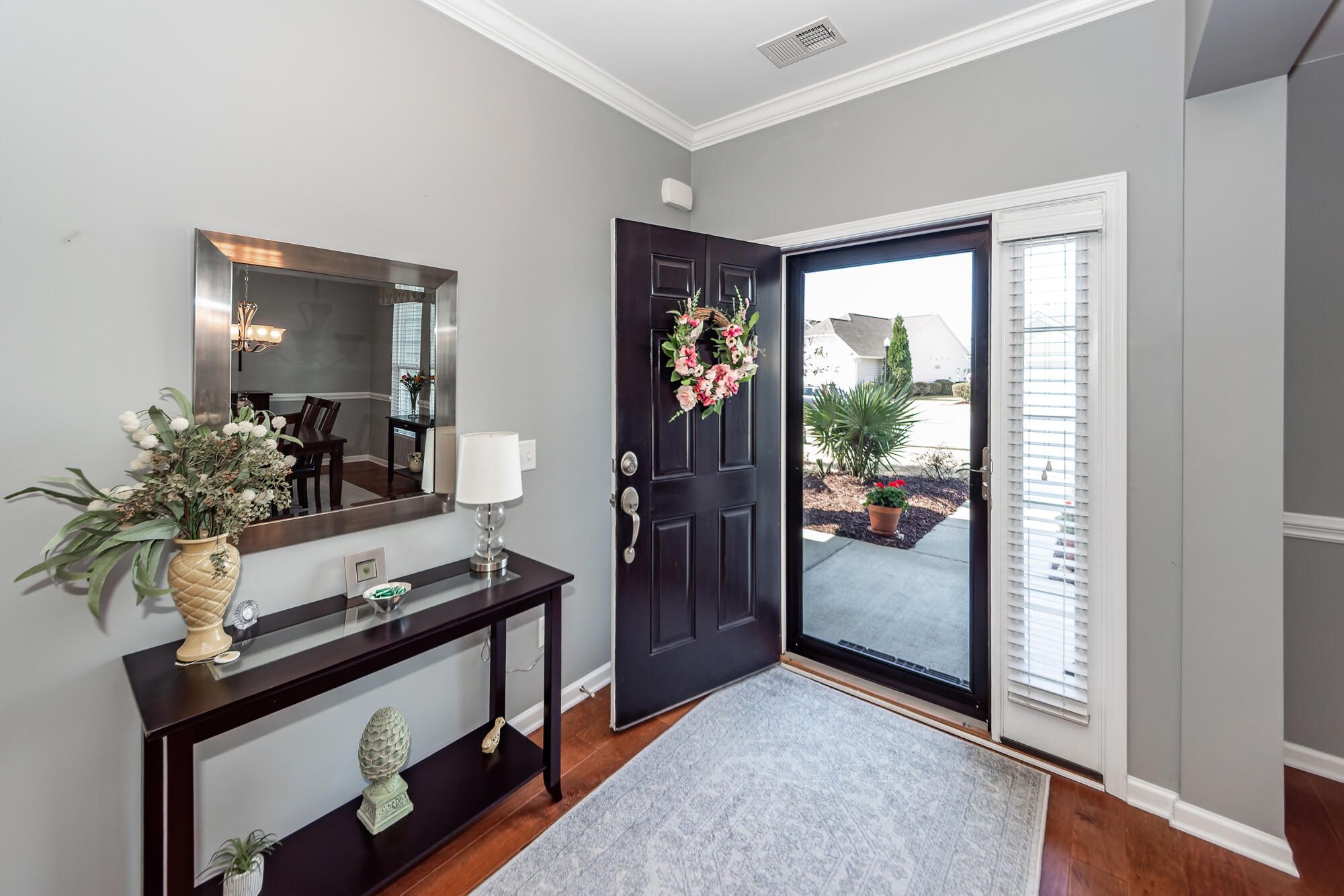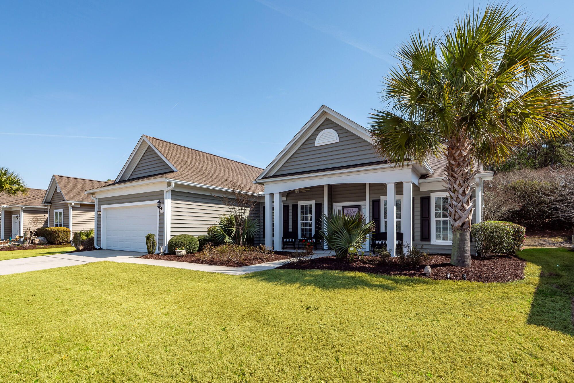 This home is a must see. Gorgeous well-maintained home located in Charleston's premier 55 plus gated community, Del Webb Cane Bay. The popular Bluffton Cottage features an open floor plan with three bedrooms, two full bathrooms and a sunroom. The owner put in a brand-new HVAC system in 2025. The front of the house features a full front porch with shutters, ceiling fans and beautiful landscaping. There is upgraded wide plank wood flooring throughout. The kitchen and bathrooms and laundry room have upgraded tile floors. There are 9 ft smooth ceilings. When you enter the home, you will see the formal dining room which features a tray ceiling and chair rail trim. The kitchen features 42'' Birch cabinets with crown molding. Custom pantry with roll our shelves. Stainless steel appliances, gasgas range, upgraded granite counters, backsplash and an eat in kitchen area with three large windows that look out over the private wooded back yard. The sunroom has five large windows with the same view of the backyard. The master bath features an elevated vanity with double sinks a framed mirror and a large walk-in shower with built in shelving and clear glass surround. Large walk-in closet off the master bedroom. The large master bedroom features a tray ceiling and triple windows for plenty of light. Guest bath features a bath shower combo, a framed mirror and a large linen closet. The 2 car garage has a four ft extension, pull down attic storage and a laundry sink. Off the sunroom in the back of the house is a screened porch and patio with a 4ft extension on both and a gas hookup for your grill. The perfect place to relax and enjoy your morning coffee or evening cocktail. You will see southern nature at its best on this premium private wooded backyard. The community has a 20,000 square foot amenity center called The Resort. Inside is a fitness center, grand ballroom, craft room, library, gathering room and a kitchen. Outdoors you will find a zero-entry pool and spa as well as a large indoor heated pool and spa. Pickle ball courts, tennis courts, dog park, bocce courts and a children's playground. There are many clubs and activities to enjoy and make new friends.