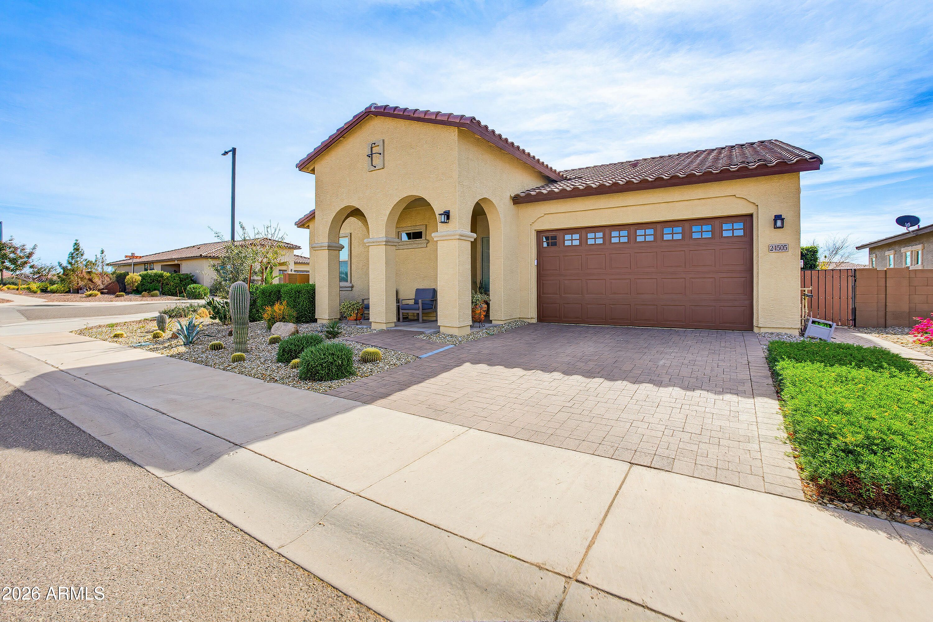 Situated on a premium homesite just steps from the community center, this like-new single-story residence blends modern elegance with thoughtful design. Wood-plank tile flooring enhances the main living areas, while plush carpet adds comfort to the bedrooms. A private front bedroom and sophisticated den create the perfect retreat for guests or a refined home office. The chef's kitchen showcases white cabinetry, granite countertops, gas range, double ovens, and a spacious walk-in pantry, seamlessly opening to the light-filled Great Room. The serene owner's suite offers a spa-inspired bath with dual vanities, an oversized tiled shower, and a rare direct laundry room connection. Sliding glass doors reveal a covered patio and beautifully landscaped yard with lush turf, greenery & sunsets.