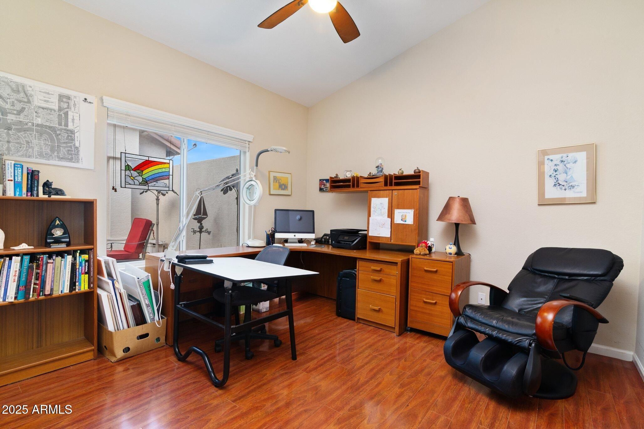 Stunning Golf Course Home with Casita in Oakwood! Peacefully situated on the 5th hole with spectacular golf course views, this beautifully maintained home offers the perfect blend of comfort, style, and resort living in the highly desired Oakwood community. The main house boasts 2,028 sq ft with soaring vaulted ceilings, rich wood floors in the bedrooms, and elegant tile throughout the walkways. The spacious, expanded great room flows seamlessly into a large open kitchen with plenty of counter space and storage. The formal dining room offers flexibility — easily used as a den or converted to a 3rd bedroom. Included is a private 255 sq ft DETACHED CASITA with a full bathroom is perfect for guests or a quiet retreat. The extended backyard is a great place to relax and unwind as you watch the sunset, listen to the tranquility of the fountain - truly beautiful and relaxing! Included with the house is A3 car garage refrigerator washer and dryer and beautiful curb appeal. Also enjoy Oakwood Country Club with the resort style pools, billiard room, dining room and restaurant along with fitness center, golf, tennis, pickleball and much more this is the ultimate inactive living peaceful, private, and packed with fun