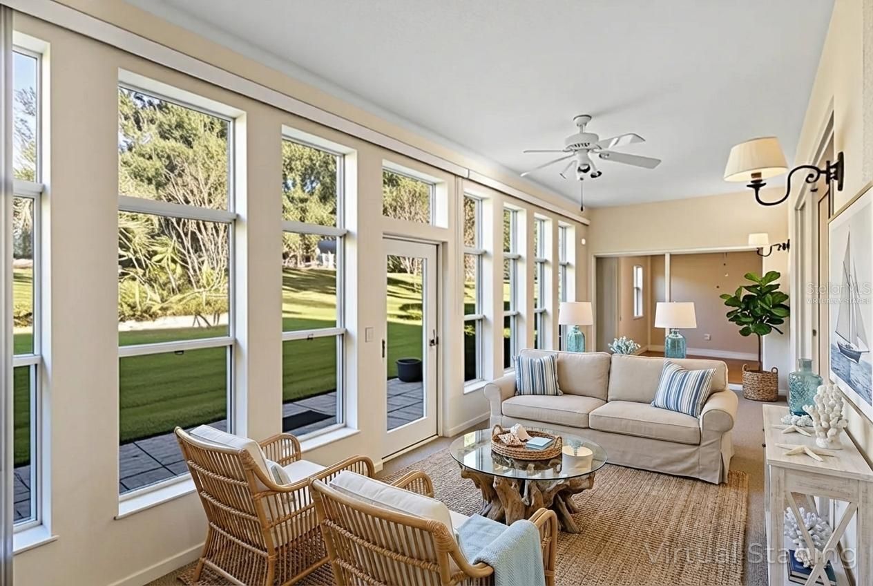 One or more photo(s) has been virtually staged. Well-designed home featuring 2 bedrooms, 2 baths, and a versatile bedroom/flex room ideal for an office or guest space. The open living and dining room combination offers excellent flow, making it perfect for entertaining large gatherings. An eat-in kitchen provides casual dining, while the large under-air Florida room extends the living space for year-round enjoyment. The primary bathroom includes a spacious walk-in shower and a Roman tub. Additional features include an inside laundry room and a two-car garage with a dedicated golf cart bay, offering ample storage and convenience. Located in The Plantation at Leesburg, a gated, active 55+ community with 24- hour manned security gates, two championship golf courses, and three well-appointed clubhouses. Residents enjoy over 100 clubs and social groups, daily scheduled activities, on-site dining, resort-style pools, fitness centers, tennis and pickleball courts, and a full calendar of events—offering an exceptional lifestyle both on and off the course.