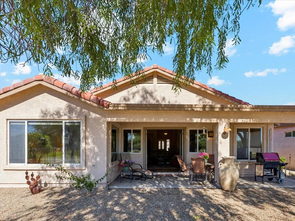 This beautifully furnished home sits on a premier golf course lot and showcases numerous custom features throughout. The main living area offers an inviting open layout with a spacious great room, vaulted ceilings, and a kitchen designed for both style and functionality. Enjoy granite countertops, a large breakfast bar, a built-in wine rack, and seamless access to the patio—perfect for taking in the stunning golf course views. The expansive primary suite features oversized windows that frame the picturesque scenery. Complete with black out blinds, for the days you want to sleep in. The ensuite bathroom includes custom tilework, dual sinks, a tiled shower with a built-in bench, and an impressively large walk-in closet. Guests will appreciate the privacy of the split floor plan, with the guest bedroom thoughtfully separated from the main living areas. The upgraded garage offers extended length, an exterior door, and a deep utility sink for added convenience. Unwind on your patio while enjoying peaceful mornings or relaxing evenings overlooking the lush fairways and mountain backdrop. This exceptional home combines comfort, elegance, and an unbeatable location.