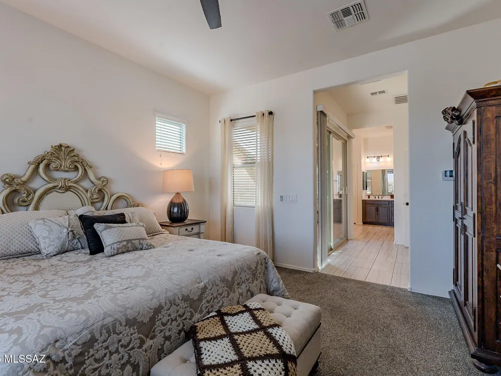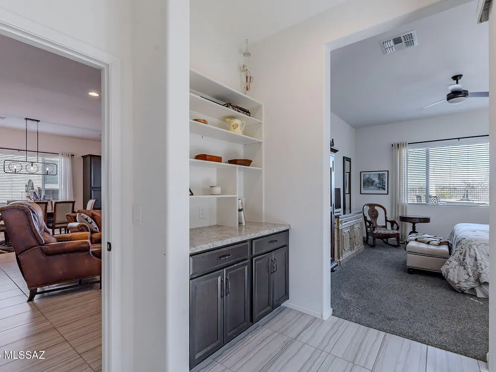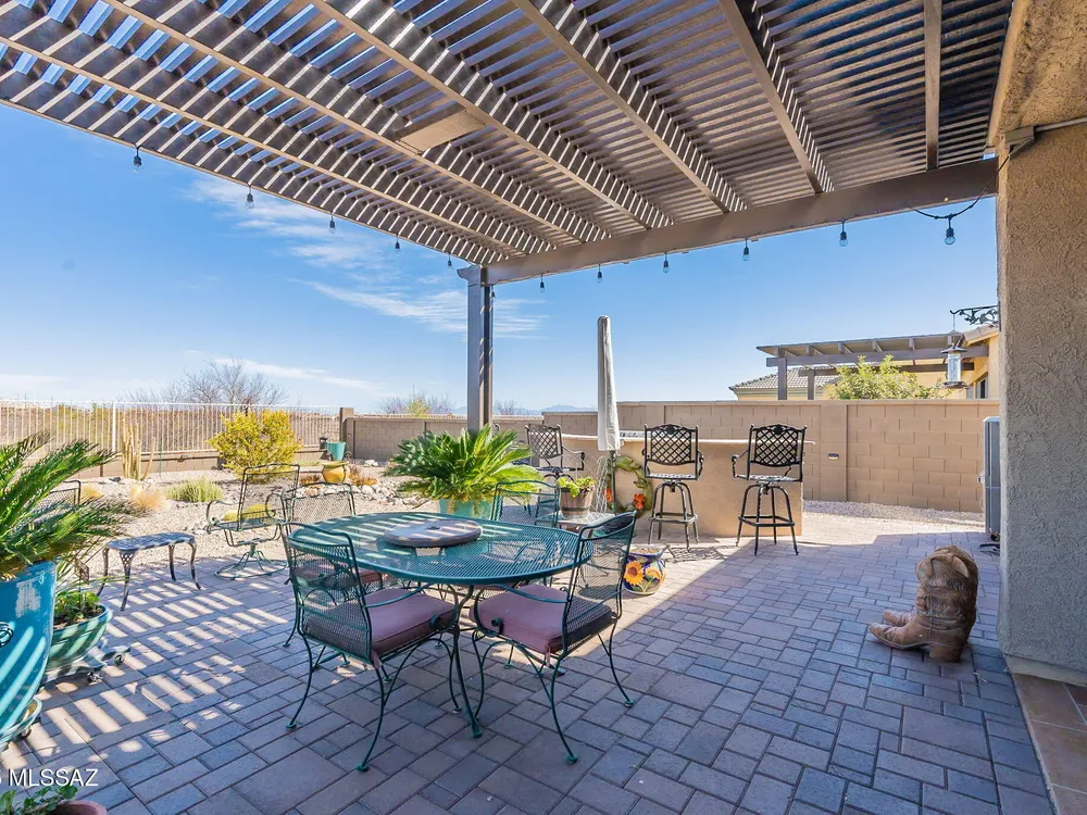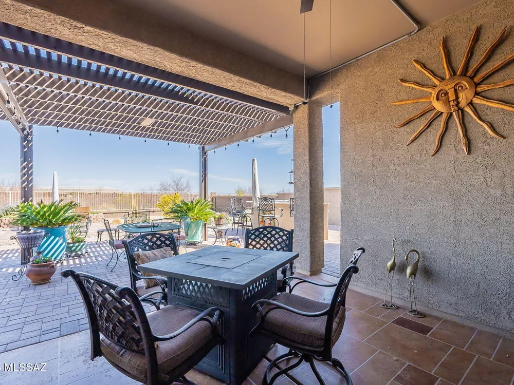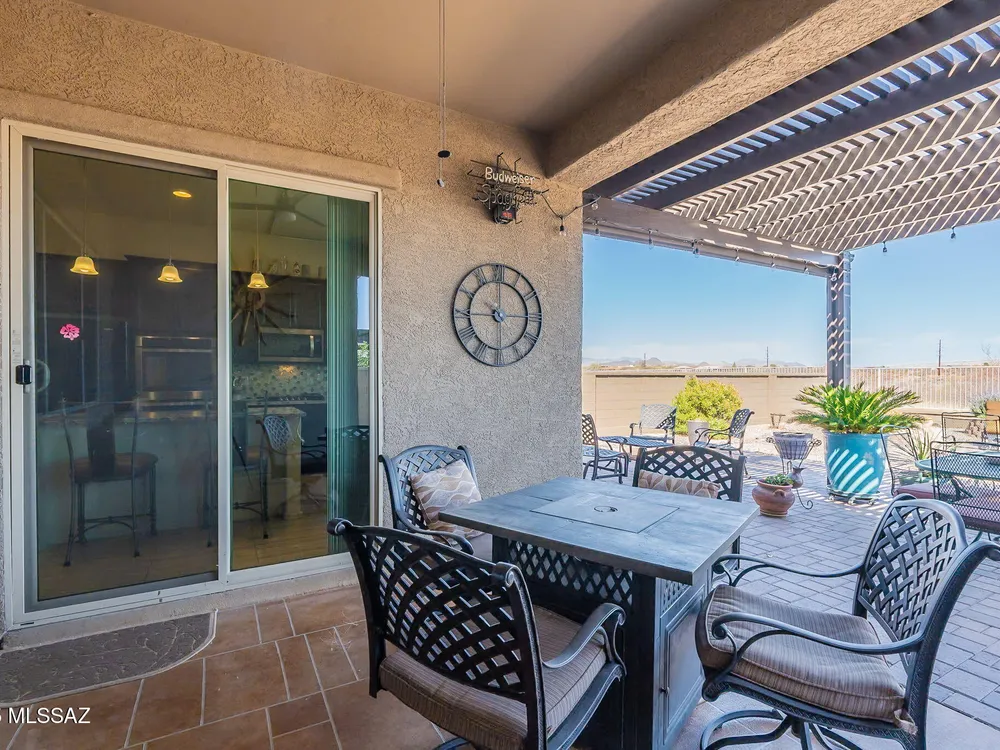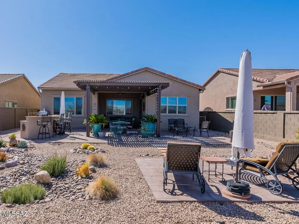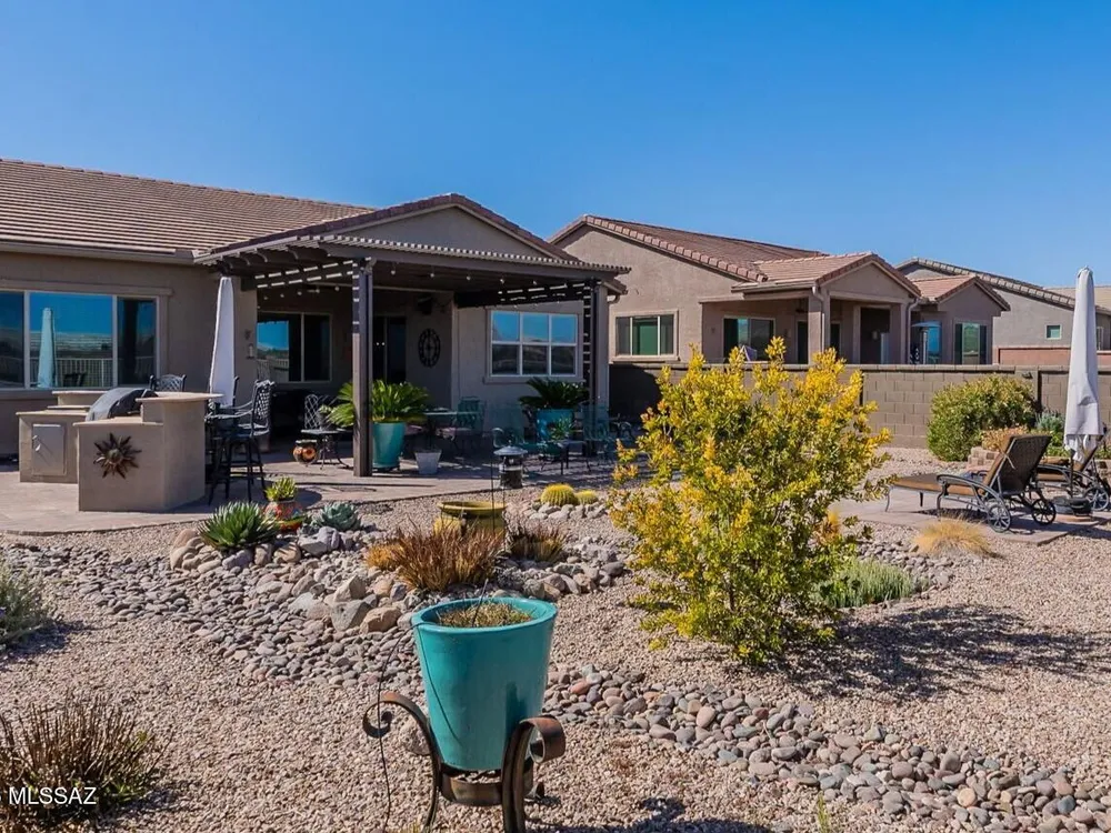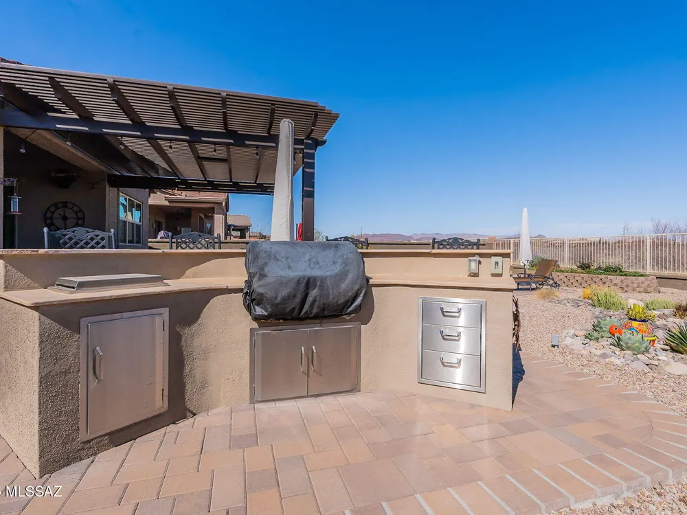 Inviting and upgraded open-concept home in gated community. Gourmet kitchen featuring gas range, double ovens, custom drawer organizers, pull-outs, soft close cabinetry an abundance of storage. Ceiling fans in every room, three HVAC zones add comfort and efficiency. Primary suite offers custom walk-in closet and a private patio with turf for pets. Flexible den with doors and shutters. Great laundry room with cabinetry, additional pantry space, and built-ins. Outdoors, enjoy mountain views, Arizona sunsets from the extended patio with lighted pergola, sun screens, outdoor natural gas kitchen, raised beds, and two irrigation zones. Garage includes storage and workbench. Split floorplan provides privacy. Continuous contracts for pest, weeds, HVAC, and termites ensure peace of mind.
