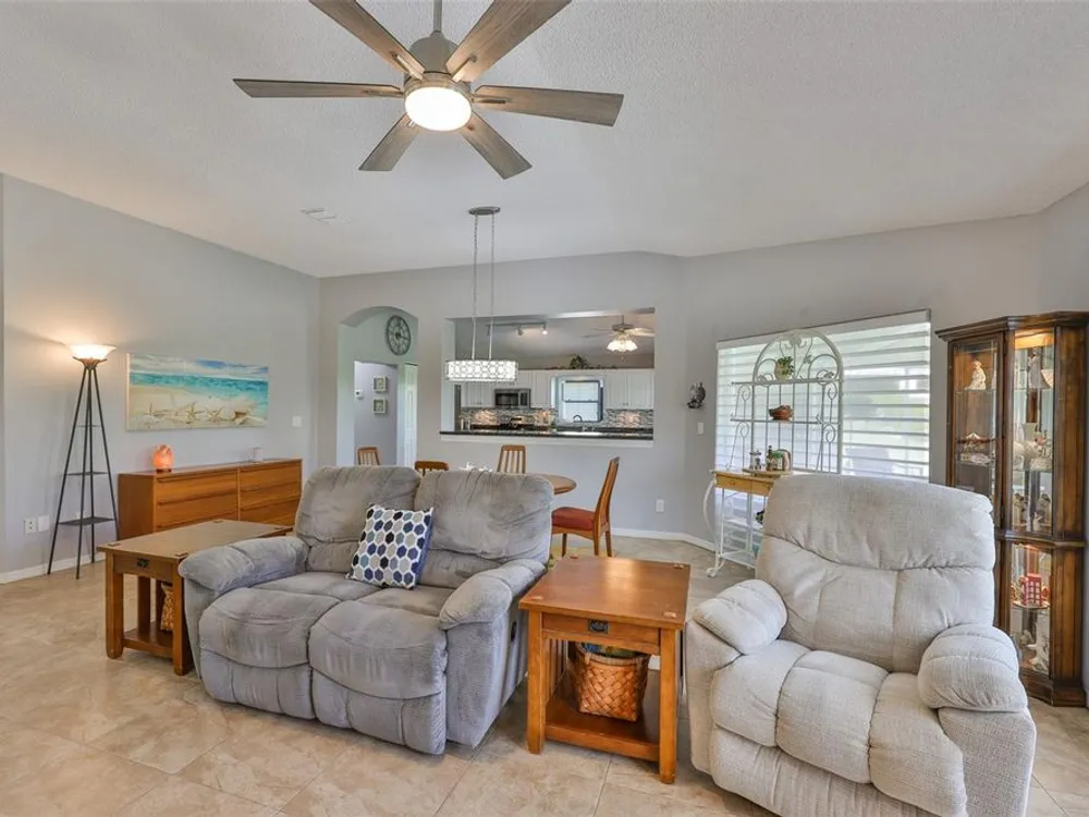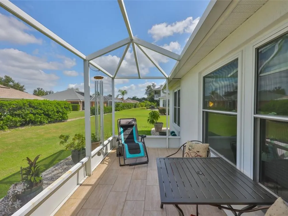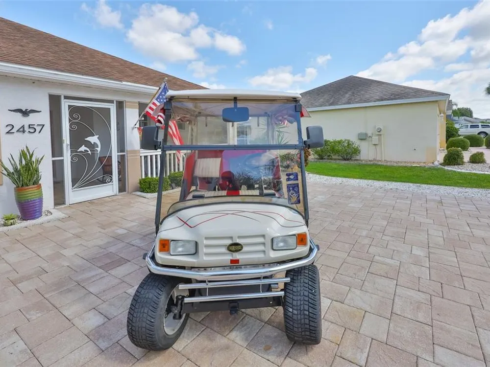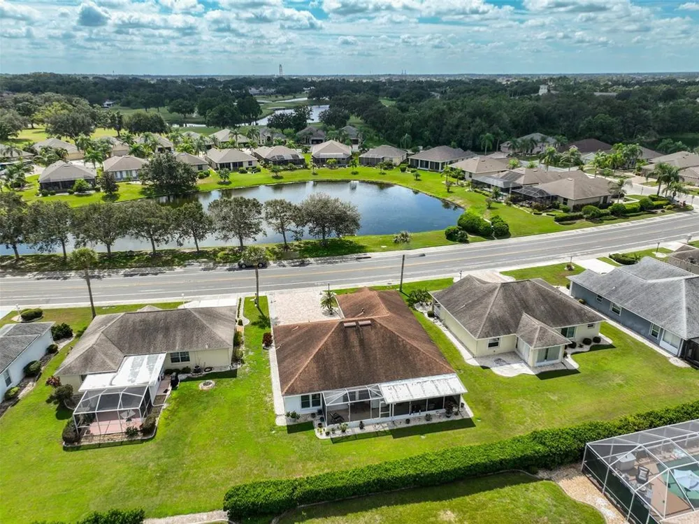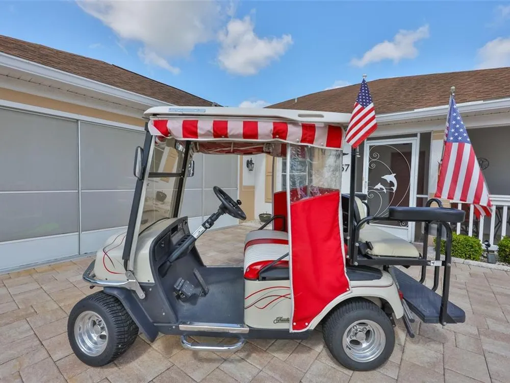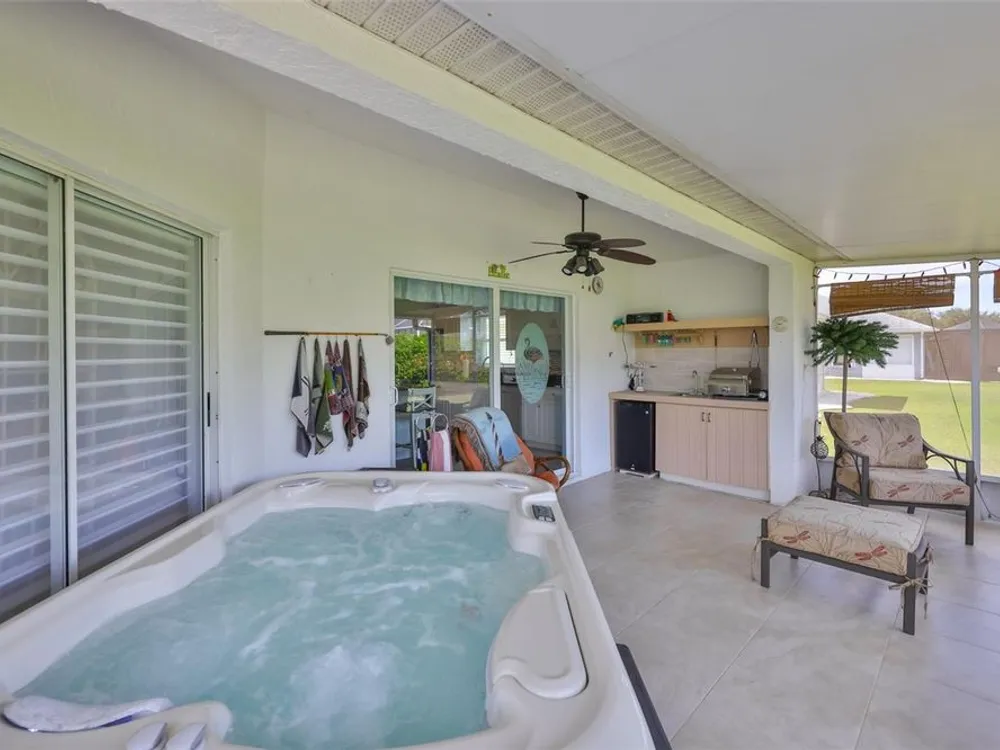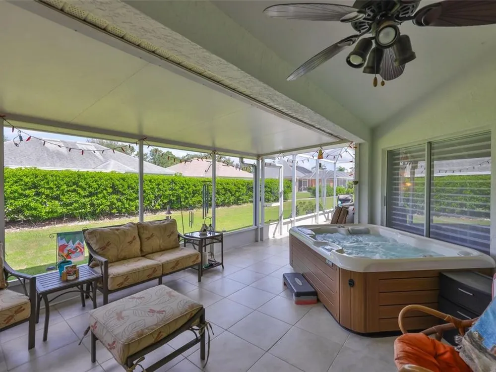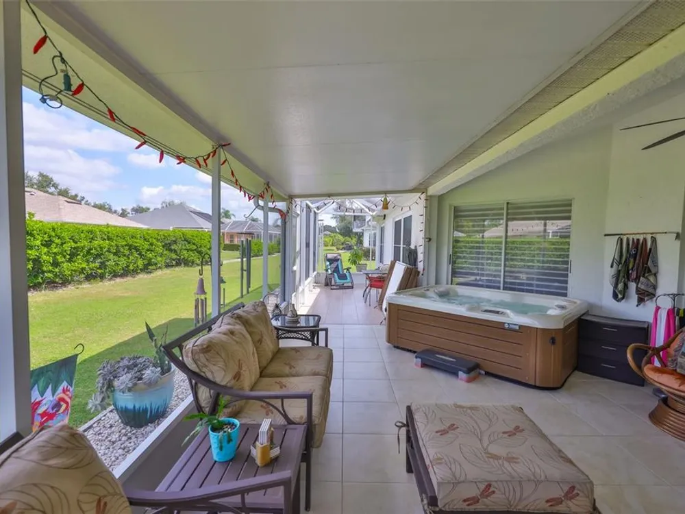 Upon entering this popular Fairfield model home you will notice the newer paved driveway and an additional screened garage door. Than imagine sitting on your screened front porch with your morning coffee gazing at Golden pond directly across the street while enjoying what mother nature has to offer. Let's go inside and you will notice ceramic tile floors throughout the entire home. The great room features your main living area and your formal dining area. Did you notice the Silhouette shades by Hunter Douglas in the great room? To your right is the entrance to the main bedroom and bath. Features here include a walkin closet and a step in closet, The remodeled bath features dual sinks, a large walkin shower and a water closet. A split second bedroom along with a bonus room and kitchen are accessed to the left of the great room. The guest bath is directly across from the guest bedroom. A good sized inside utility room leads out to the large enclosed two car garage. The golf cart is included with a full price offer. Ok all you gourmet cooks. You will love this updated kitchen. Features include newer counter tops with backsplash tile, newer appliances, pantry, under counter lighting, food preparation island, large eating area, storage galore and entrance to your lanai. But before we go there lets peek under the sink where you will find a water filter system and connection to the water softner located in the garage. For your large parties lets go to the lanai where you will find another serving area complete with sink, refrigerator and food preparation or bar. Need more relaxing, jump into the large hot tub. LET'S PARTY! See additional feature sheet.