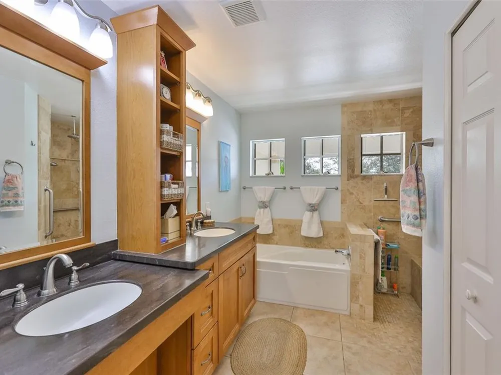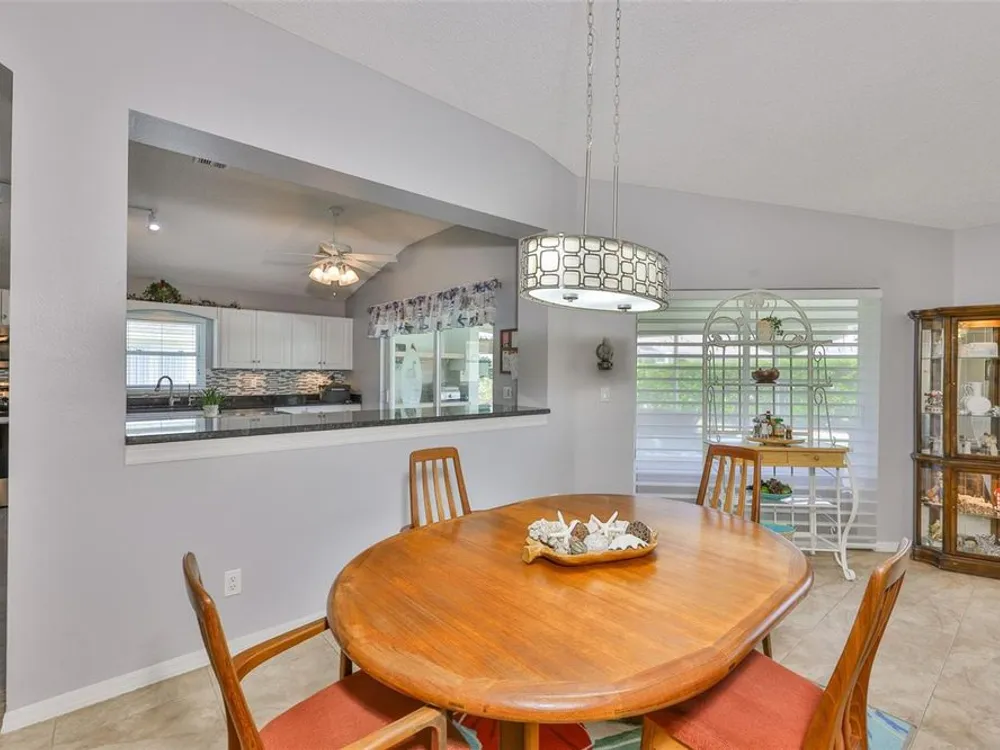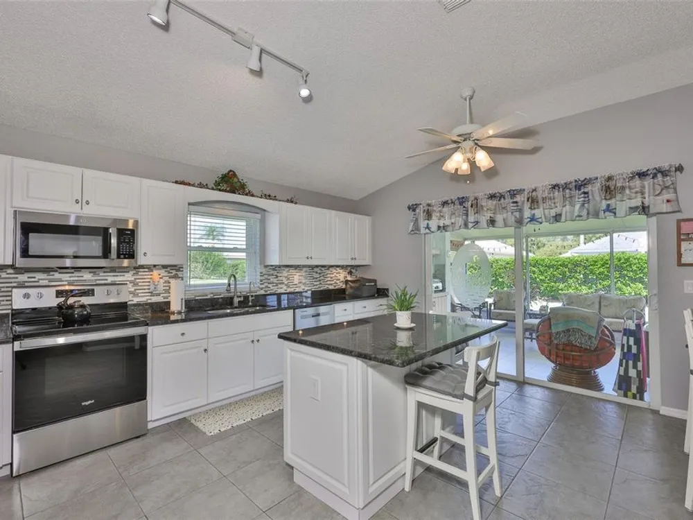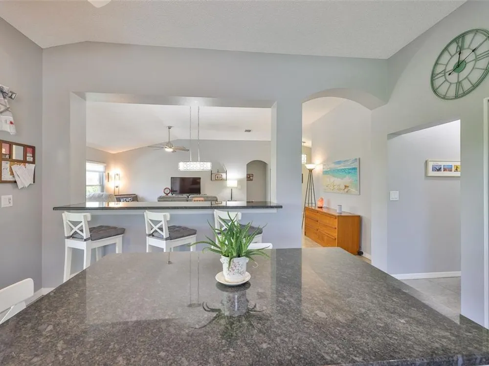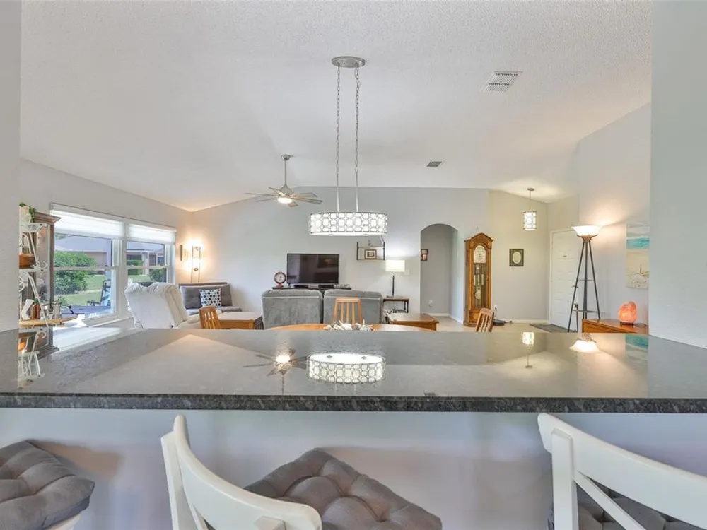 - Ceiling Fan(s), Eat-in Kitchen, High Ceilings, Living/Dining Room, Open Floorplan, Main Level Primary, Split Bedrooms, Stone Counters, Thermostat, Vaulted Ceiling(s), Walk-In Closet(s), Window Treatments