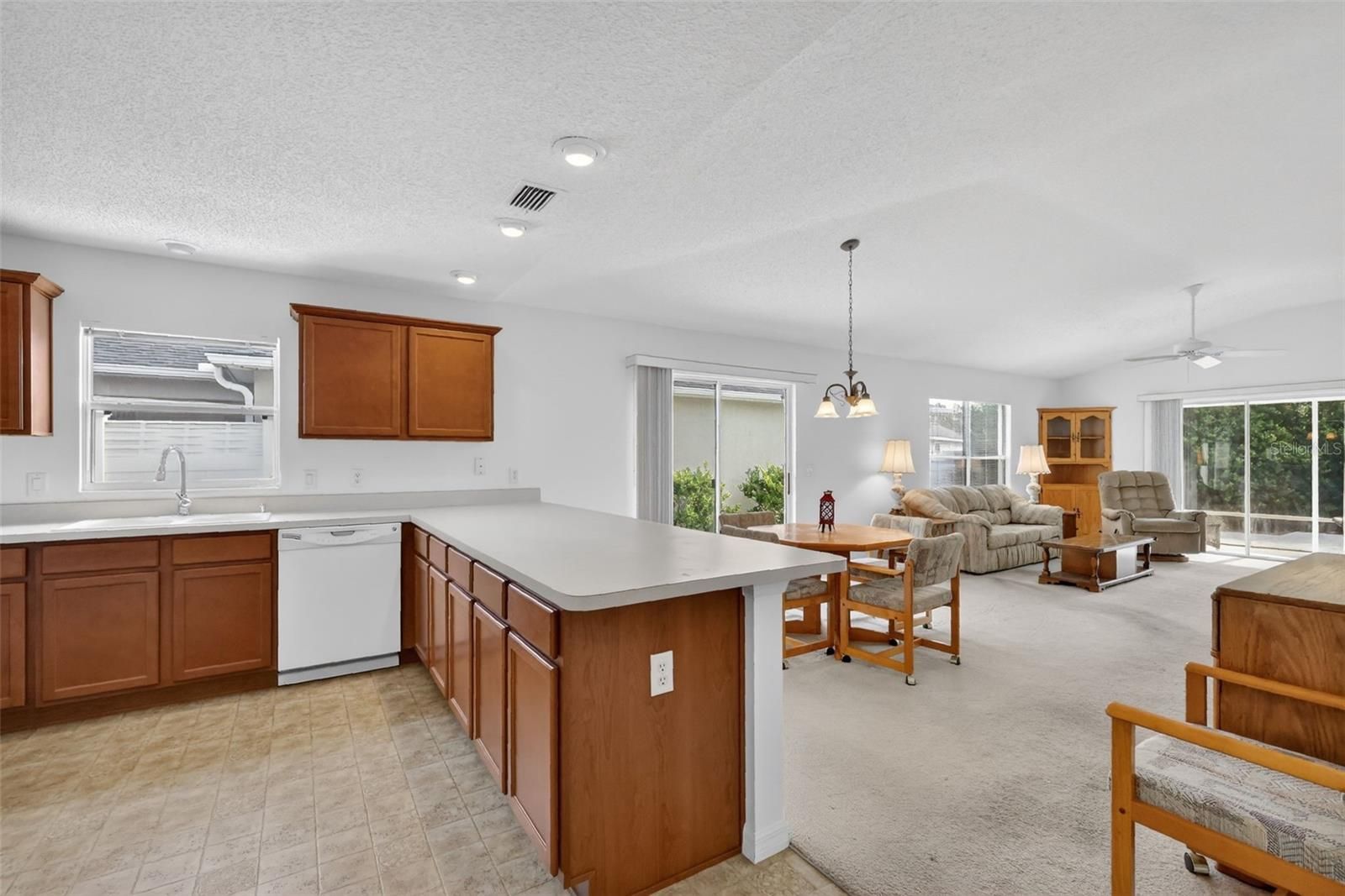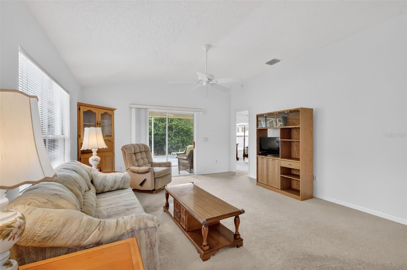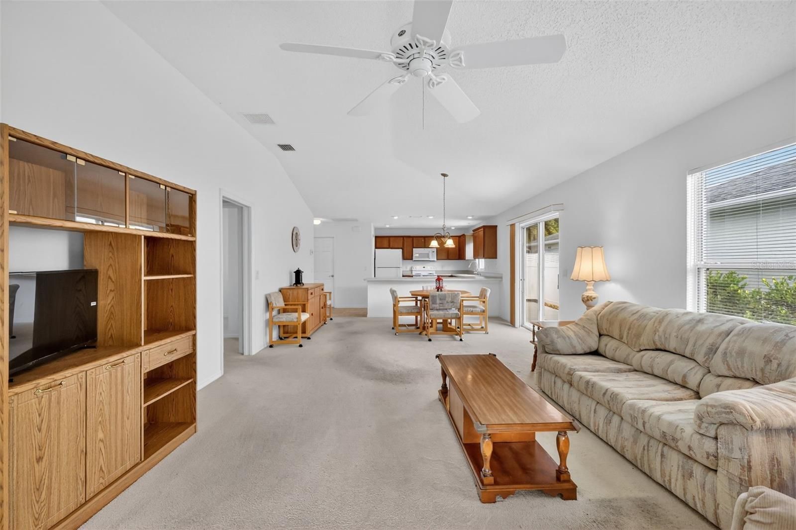 Welcome to this WONDERFUL, BLOCK and STUCCO 2/2 Woodlawn Courtyard Villa with a SCREENED LANAI and REAR PRIVACY LANDSCAPING, nestled in the charming Hillcrest Villas of the highly sought-after Village of Hadley! Ideally located JUST MINUTES from Lake Sumter Landing, you’ll enjoy convenient access to shopping, dining, and live nightly entertainment! Plus, enjoy the benefit of a LOW BOND -only $6,680! Attractive, EASY-MAINTENANCE stone landscaping beds and a COVERED entry vestibule warmly welcome you into this INCREDIBLE home! Inside, the AMAZING kitchen features gorgeous MAPLE cabinetry, neutral countertops, and a convenient EAT-IN breakfast bar - perfect for casual dining. The VAULTED ceilings and OPEN CONCEPT floor plan seamlessly connects the kitchen, dining, and living areas, creating a bright and SPACIOUS main living space ideal for everyday living and entertaining. Sliding glass doors from the living room lead to the screened lanai, while additional sliders in the dining area open to the side and rear courtyards. These FABULOUS outdoor spaces are enclosed within a fully fenced yard and surrounded by mature PRIVACY landscaping, offering a TRANQUIL RETREAT - perfect for enjoying your morning coffee or hosting friends and family! Back inside, the primary suite is a peaceful escape, featuring a spacious VAULTED ceilings, WALK-IN closet, and sliding glass doors to the lanai. The en-suite bath offers a WOOD vanity and a WALK-IN shower. A SPLIT FLOOR PLAN provides privacy for visitors, with the second bedroom and bathroom located near the front of the home - ideal for a guest suite or quiet home office. Bedroom two includes a large window, built-in closet, and a VAULTED ceiling. The second bathroom features a WOOD vanity, a tub and shower combination, and a convenient hall LINEN closet. Completing this wonderful home is a one-and-a-half-car garage with a generous laundry area and AMPLE SPACE for both a car and a golf cart! DON’T MISS YOUR OPPORTUNITY to own this gorgeous, private courtyard villa in an unbeatable location! *Furniture Available Separately* The Village of Hadley is nestled in the heart of The Villages between Lake Sumter Landing and Brownwood Paddock Square; close to Havana and Mallory Hill Championship Golf and Country Clubs; Bacall, Canal Street, and Colony Cottage Recreation Centers; Hadley, Amelia, and Largo Pools; several other pools and pickle ball courts; and CR466A with an abundance of shopping, restaurants, banks, medical and more! PLEASE WATCH OUR WALKTHROUGH VIDEO of this FANTASTIC VILLA and CALL TODAY for your private showing or virtual tour!