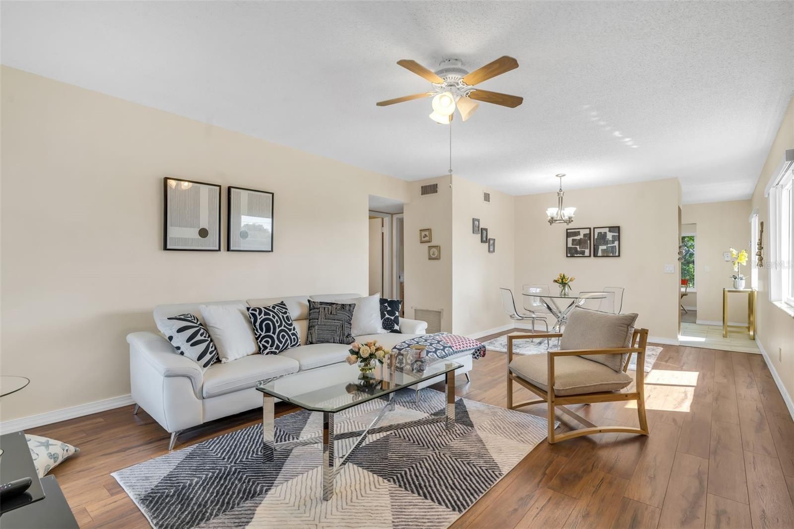 Beautifully updated 2/2 END UNIT on one of the largest 55+ community: On Top Of The World. This unit is spacious, light and Bright, pond and nature views, updated kitchen with quartz counter tops, tile/glass back splash and newer appliances; impact windows installed in 2019 and AC in 2024; newer laminated floor throughout and ceramic tile in the bathrooms & kitchen. OTOTW is a gated community with so many activities: gym, shuffleboard, 2 swim pools (one heated pool), clubhouse, and craft room, ballroom for dances, sauna, yoga, card rooms, tennis court, horseshoes and golf course. OTOTW is a pet-friendly community and rental is allowed, minimum 6-month. Association approval for purchase and rental is required. W&D can be installed in unit upon approval of the association. Trash/dumpster is on first floor; laundry room is on 2nd floor and storage on 3rd floor. This is a Land Lease property (no extra fee) and title will be conveying as a Leasehold Estate Warranty Deed. For financing purchase 35% down payment is required. This is “AS IS” sale with right to inspect and no repair.