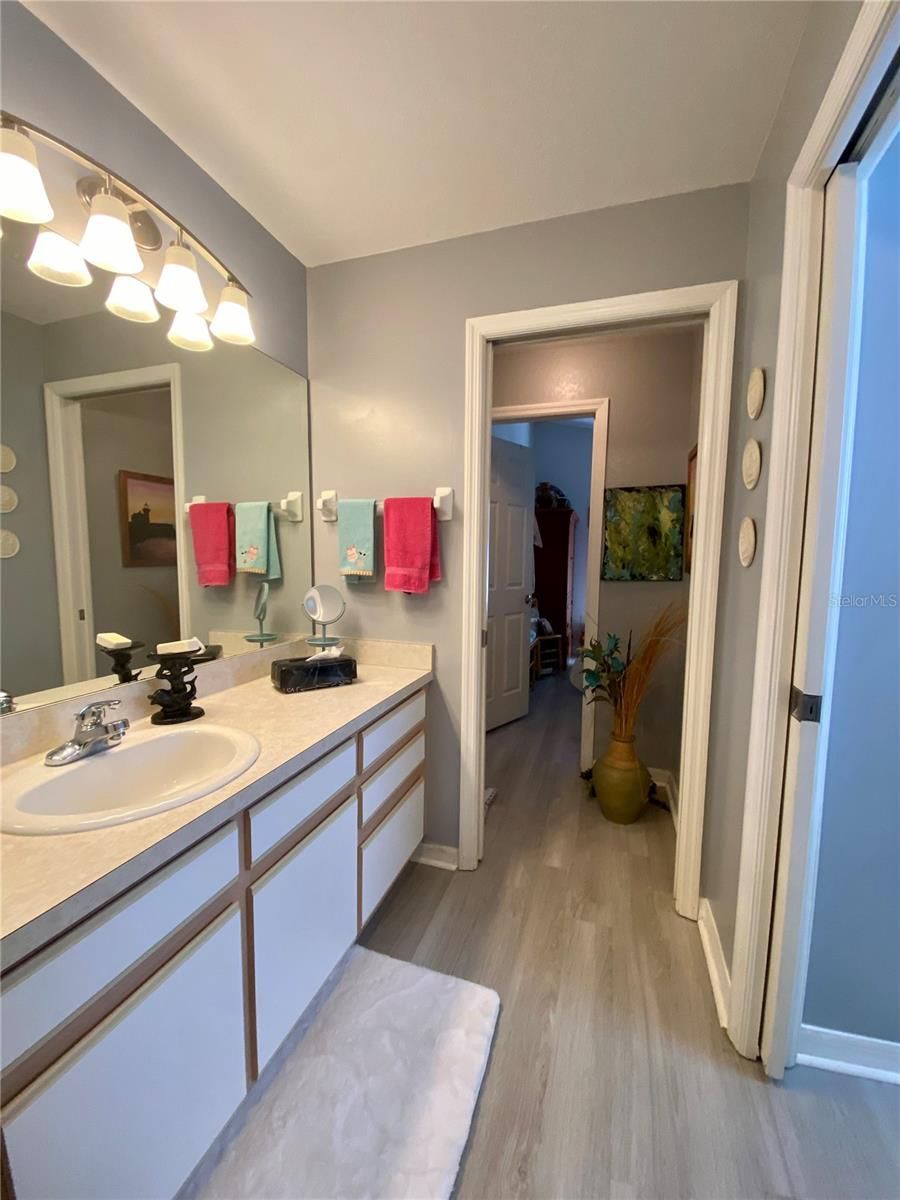 HUGE PRICE IMPROVEMENT!! Thoughtfully designed and beautifully maintained, this delightful home boasts 2 bedrooms, 2 full baths AND a bonus room perfect for a study, den or even an extra guest room. Volume ceilings and a nice, open floor plan create a spacious feel throughout this home and offers plenty of flexibility to accommodate and arrange your furnishings. The well appointed kitchen features white cabinetry, brushed nickel hardware, recessed lighting, stainless appliances, closet pantry and a sunny breakfast area that is sure to impress the chef in your family! A very generous inside laundry room features a washer, dryer and plenty of shelving for additional storage. The primary bedroom offers an en suite bath with large walk-in closet, seated shower and private access to the screened lanai. The second bath features a tub/shower combination, linen closet and easy access for guests from two entrances. The architectural shingle roof was installed in 2022 and many other features/improvements include waterproof vinyl plank flooring throughout, pre-wiring for a generator, water softener, decorative landscaping, new A/C in 2024 and insulated garage door. Located in the very active 55+ community of Chalet Estates, there are plenty of opportunities to enjoy the many amenities and planned activities it is known for. Among these are the lakefront clubhouse, heated community pool, veranda, indoor and outdoor entertaining areas, full kitchen, fitness room and the beautiful dock and gazebo overlooking the sparking waters of Lake Suzanne. Numerous planned activities are available every month and enjoyed by many!
