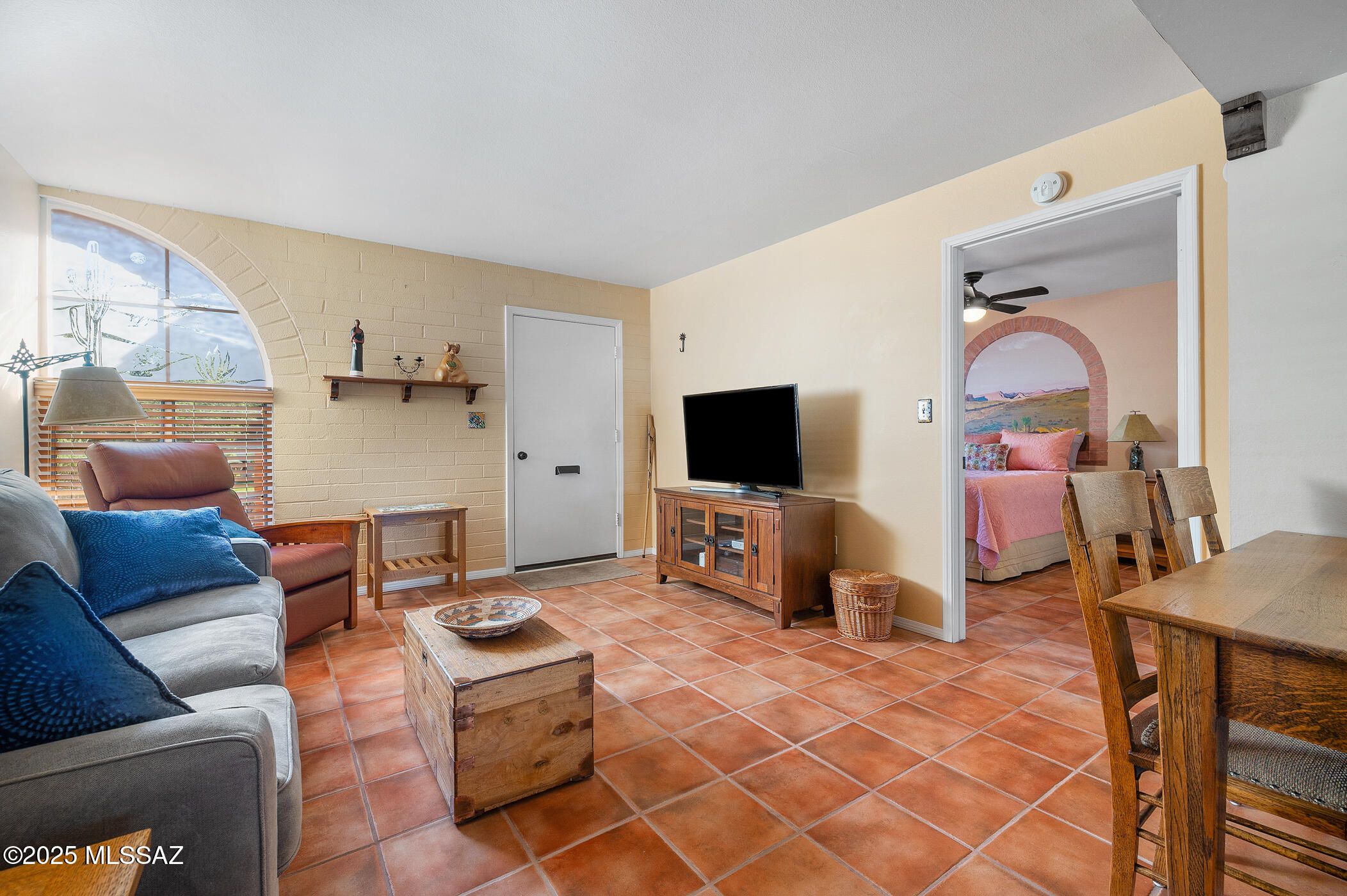 Fully furnished and bursting with Southwestern charm, this delightful condo features custom hand-painted art by the owner, adding warmth and personality throughout. Ideally located just steps from the community pool, a drug store, the Wednesday Farmers Market, restaurants, & shopping. Enjoy all-tile flooring that creates a seamless flow from room to room, a kitchen with a gas stove, dishwasher, refrigerator & washer/dryer located in the outdoor shed. Community amenities include a pools, paved streets, and serene walking trails--perfect for relaxation and recreation. HOA dues cover exterior maintenance/paint, roof repair, HVAC, water heater, water/sewer, pest control, trash collection, and landscape/pool road maintenance. No GVR, but available. Your dream retirement lifestyle begins here!