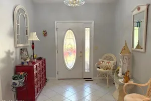 This home boasts a great location, situated just a short distance from St. George Marina and Food City, making it convenient for shopping, dining, and recreational activities. The property features a semi-open floor plan, allowing for a comfortable flow between living spaces. There is only one step into the home, whether entering from the front porch or the garage, making access easy and practical. The inviting living room includes a beautiful, stacked stone fireplace, which serves as a focal point for the space. The room is enhanced by a vaulted ceiling and a separate foyer with a tile floor. Sliding doors from the living room lead to a screened-in porch that offers a peaceful wooded view. The dining room is open to both the kitchen and the living room, creating an ideal space for entertaining and gatherings. A beautiful bay window brings in additional natural light. The kitchen is fully equipped with all major appliances and features abundant cabinetry, including two Lazy Susans for efficient storage. Ample countertop space provides plenty of room for meal preparation. The main bedroom is generously sized to accommodate a king bed, two nightstands, and a dresser, as shown in the photo. It also includes a walk-in closet for ample storage. The adjoining main bathroom features a granite countertop, tile flooring, and a pre-molded tub/shower offering easy maintenance. Bedrooms two and three are also spacious. Bedroom two stands out with its vaulted ceiling and three windows, including a half-round window above for added character and light. The hall bath includes a tile floor, a granite countertop, and a tub/shower combination, providing comfort for family and guests. The utility room is equipped with cabinets above the washer and dryer space, as well as a closet for additional storage. The garage features a utility sink, extra storage cabinets, and double windows that let in plenty of light. The crawl space includes a water faucet and a workshop area with an approximately 14-foot concrete pad, ideal for projects or additional storage. Recent updates include a one-year-old water heater and a new propane tank, adding further value to the home.