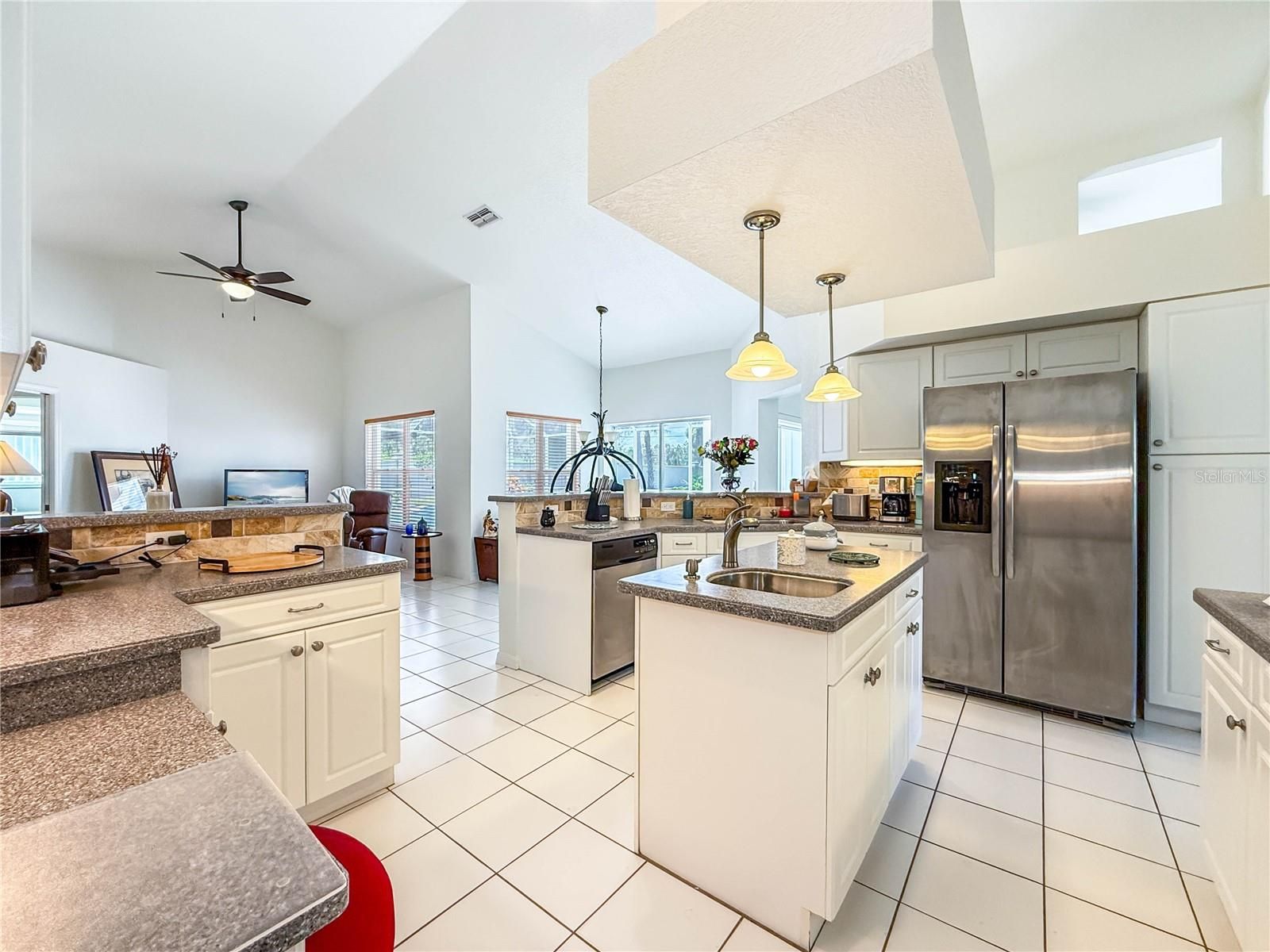 - Cathedral Ceiling(s), Ceiling Fan(s), High Ceilings, L-Shaped Dining Room, Open Floorplan, Solid Surface Counters, Split Bedrooms, Walk-In Closet(s)