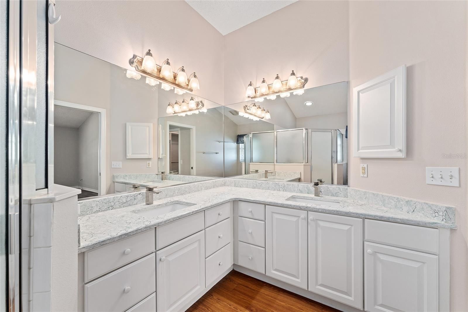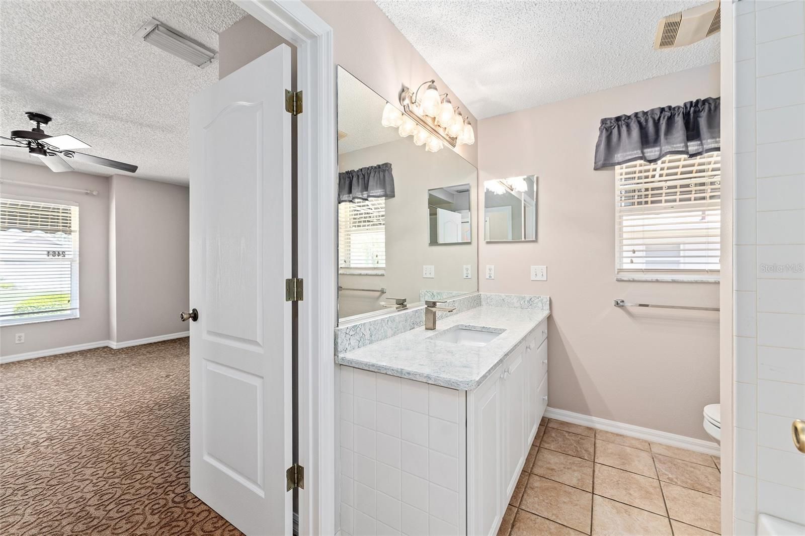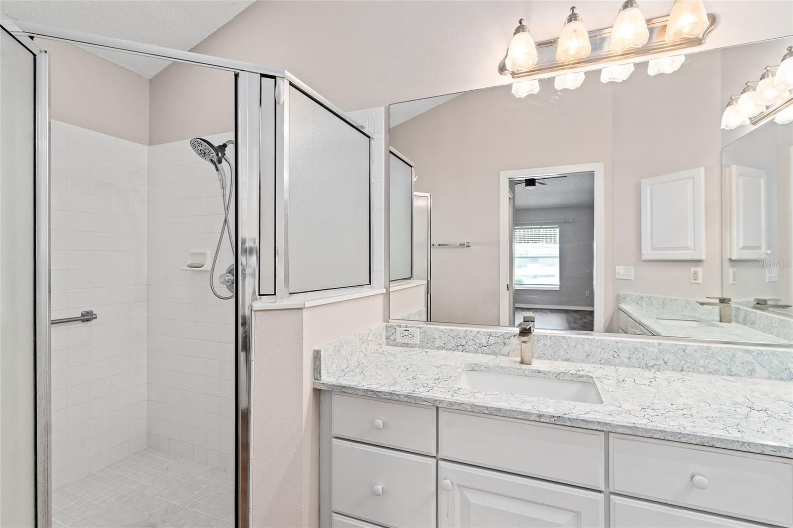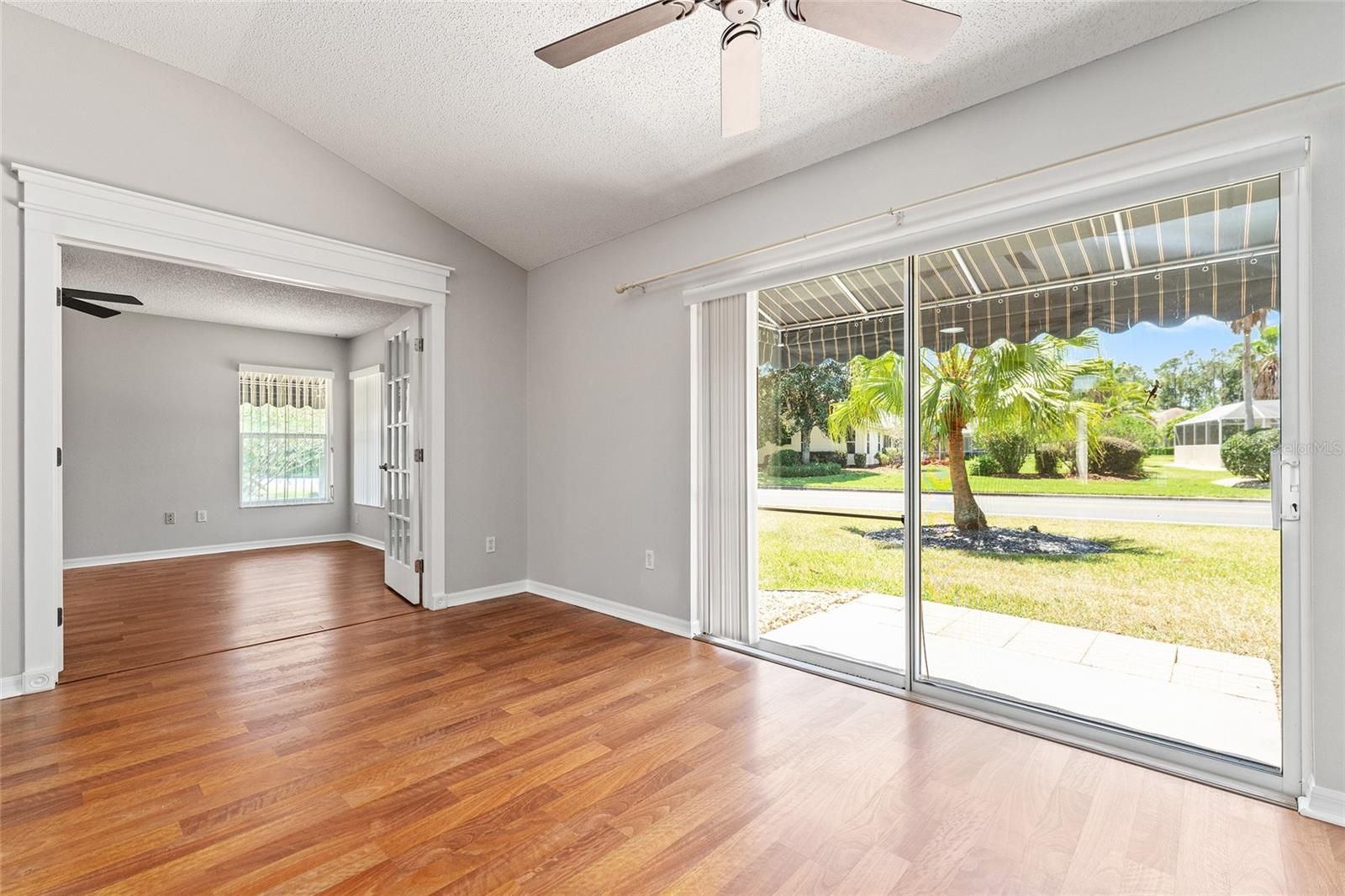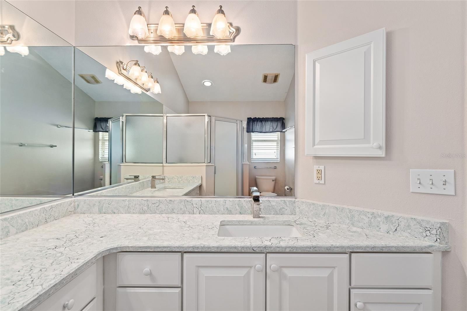 UPDATE 10/23/2025: Seller Will Consider OWNER FINANCING! Discover the PERFECT BLEND of UNIQUE DESIGN, COMFORT, and PRIVACY in this expanded Designer located in the VILLAGE of SANTIAGO! Perfectly positioned on an oversized 0.218-acre lot, this well-maintained 3 BR/2 BA/2 Car Garage home offers privacy w/ NO HOMES BEHIND. Enjoy charming CURB APPEAL highlighted by an ARCH SHINGLE HIP ROOF (2019), CONCRETE BLOCK & STUCCO exterior, and MATURE LANDSCAPING featuring ROCK-FILLED BEDS & a variety of palm trees. Prepare to be impressed by the METAL GATE ENTRY leading to the elegant COVERED FRONT PORCH featuring a concrete patio enclosed by a decorative CBS half-wall w/ 2 mini-columns. Stylish outdoor lighting mounted atop the columns illuminate this area in the evenings. Accentuated by matching sidelights & an overhead transom, the welcoming front door has a full glass storm door which provides for protection from the weather elements. Step inside the FOYER and experience the spacious ambiance of this OPEN CONCEPT, SPLIT BEDROOM FLOOR PLAN w/ 2145 SF of living area. The sightline is perfectly centered from the FOYER through the LIVING ROOM to the SLIDING GLASS DOORS with SOUTHERN REAR EXPOSURE. Natural light is generous in the expansive LIVING ROOM which exudes warmth w/ VAULTED CEILINGS & rich WOOD LAMINATE FLOORING. Adjoining the Living Room, the DINING ROOM is brightly illuminated by natural light from 3 large EASTERN-FACING windows & a SOLAR TUBE. An INDOOR LAUNDRY is conveniently tucked behind closet doors in the hallway to the Dining Room. The KITCHEN offers a culinary paradise featuring WHITE CABINETS with PULL OUTS & BUILT-IN PANTRY, luxurious QUARTZ COUNTERTOPS w/ BACKSPLASH which creates a sleek & cohesive look, contemporary DROP PENDANT LIGHTING over the single basin SS sink w/ disposal button & pass through window, and a cozy BREAKFAST NOOK w/ a convenient BUILT-IN BUFFET CABINET providing storage galore! The PRIMARY BEDROOM (rear SW corner) features VAULTED CEILINGS, a WALK-IN CLOSET w/ a CUSTOM CLOSET ORGANIZATION system, and an ENSUITE BATHROOM boasting DUAL SINKS/ VANITY w/ elegant WATERFALL FAUCETS, a bright SOLAR TUBE, and a TILED WALK-IN SHOWER w/ a built-in seat & an oversized, handheld showerhead. The guest wing provides welcoming accommodations featuring BEDROOM #2 (front) w/ a closet & an adjoining BATHROOM #2 offering MATCHING QUARTZ COUNTERTOPS, TILED TUB/SHOWER COMBO, & a GRAB BAR for enhanced safety. Dual FRENCH DOORS framed w/ classic woodworking finishes present an elegant entrance to BEDROOM #3 (no closet) just off of the LR in the rear of the home (SE corner). The WOOD LAMINATE FLOORING, ample NATURAL LIGHT from dual windows, and an illuminating SOLAR TUBE make this a comfortable space. Step outside the SLIDING GLASS DOORS in the rear of the LR to the REAR PATIO, the ideal place for enjoying Florida’s balmy winter evenings. The spacious 2-CAR GARAGE includes a motorized GARAGE DOOR SCREEN and 2 exterior access keypads. Add’l features include: PAID BOND, WHOLE-HOUSE WATER FILTRATION SYSTEM, DOUBLE PANE windows, HVAC w/ HEPA filter, economical GAS HEATING & DRYER, & IRRIGATION SYSTEM. This lovely abode is conveniently located just minutes from vibrant SPANISH SPRINGS & LAKE SUMTER LANDING town squares, the renowned SAVANNAH CENTER, and El Santiago & Tierra Del Sol rec centers. Homes of this quality and unique charm are rarely available. Grab your “Slice of Paradise” now before it is too late! Call today!