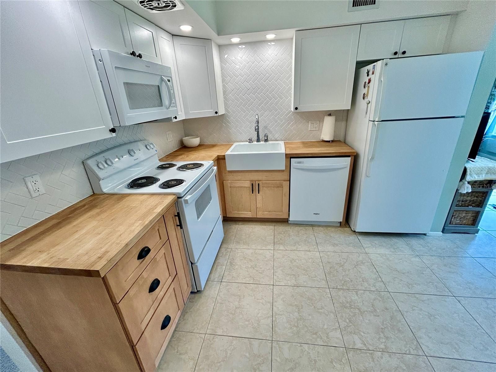 **The Seller is offering a $5,000 credit at closing towards the installation of a washer and dryer!** Welcome to your meticulously furnished second floor, 2 bed, 2 bath oasis, ideally situated on a quiet cul-de-sac that backs up to a lush, green conservation area. The updated kitchen features chic shaker style cabinets and unique butcher block counters with a French Farmhouse-style sink, a ceramic tile backsplash, newer appliances, and ceramic tile flooring. Extra cabinets and counter space make this kitchen a true delight for any home chef. Both bathrooms have been tastefully updated, featuring comfort-height commodes, modern lighting and mirrors, vanities and faucets, offering a blend of style and functionality. Relax in the convenience of the Florida Room and gaze out through the updated windows at the serene view of the mature trees and greenery of the conservation area. As an added bonus, there is a bump out on the front balcony providing enough room for a small table and chairs to sit outside and wake up with your morning cup of coffee, or relax with a glass of your favorite beverage while you watch the sunset in the evening. The AC was replaced in 2021 and there are ceiling fans in the bedrooms and Florida Room to help keep you cool. The water heater was replaced in 2015. Located in a vibrant 55+ community, you'll have access to a wide range of amenities designed to enhance your lifestyle. Enjoy two private golf courses (9 and 18 holes), two heated swimming pools, and two activity centers. Stay active in the remodeled cardio gym or engage in various community activities like fitness classes, dancing, clubs, cards, and billiards. Pet owners will love the pet-friendly environment, featuring a fenced dog park and covered seating areas. Residents can also enjoy hobby studios and a woodshop for creative pursuits. The on-site Good Karma Café offers convenient 'take & bake' meals and snacks. Conveniently located near beaches, transportation, shopping, entertainment, and fine dining. Schedule your showing today and enjoy the best in comfort and convenient living!