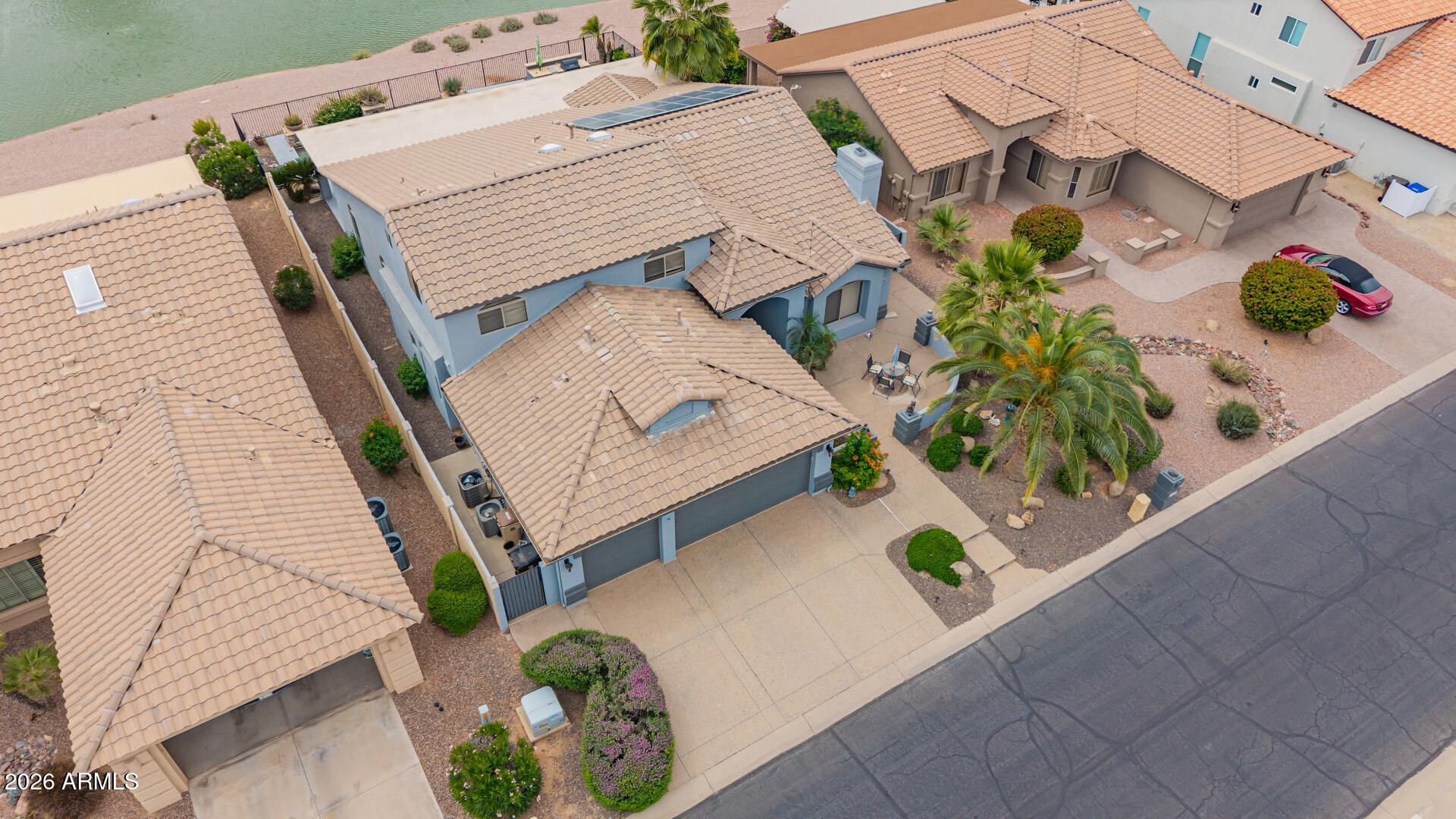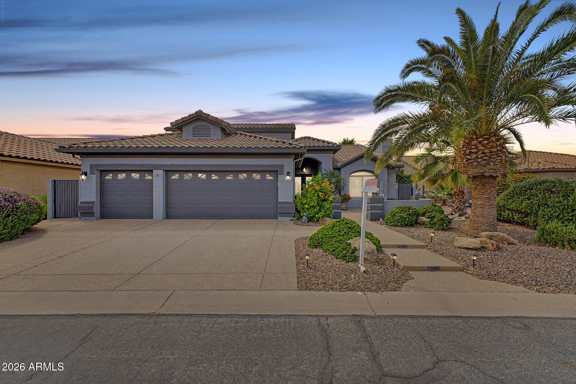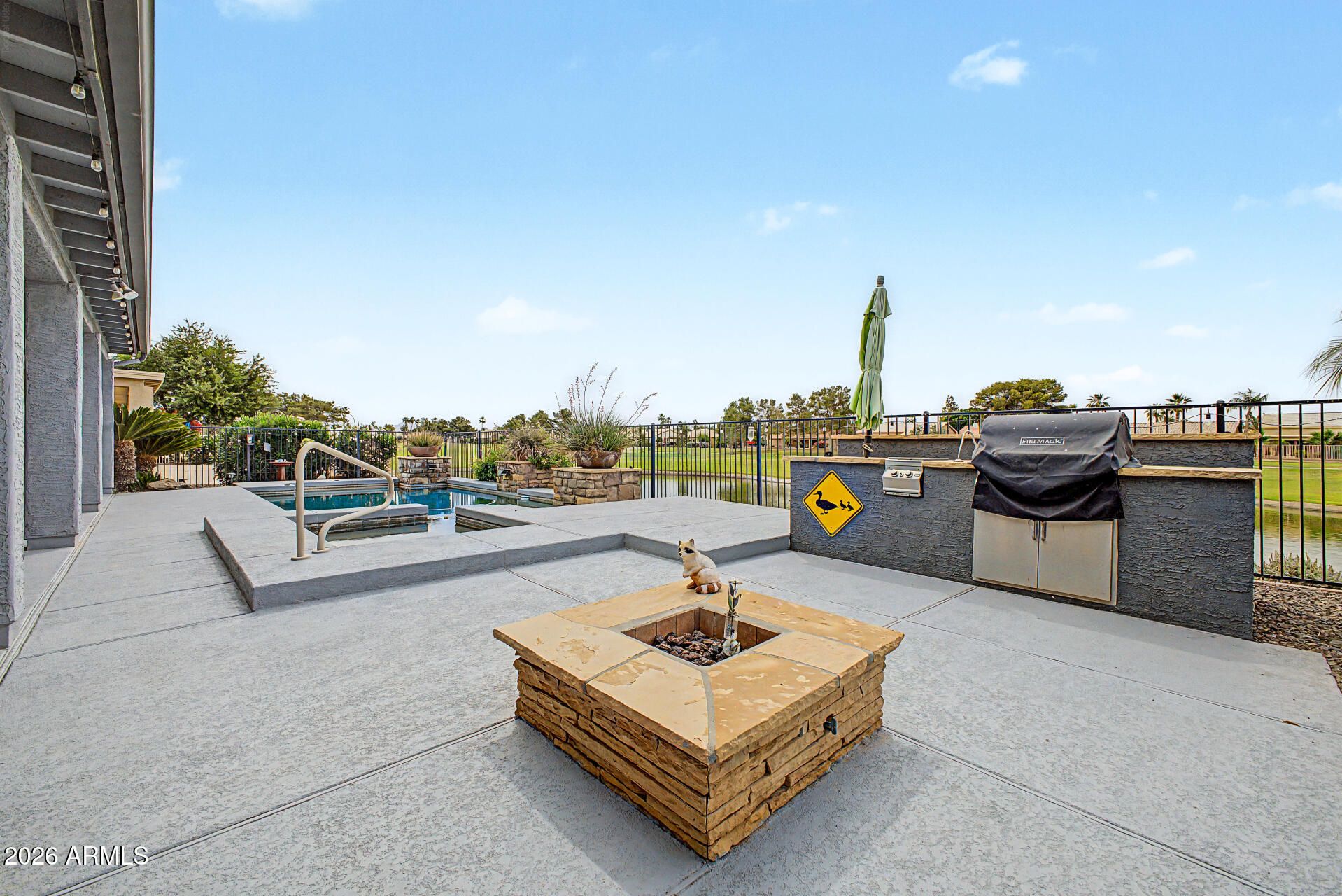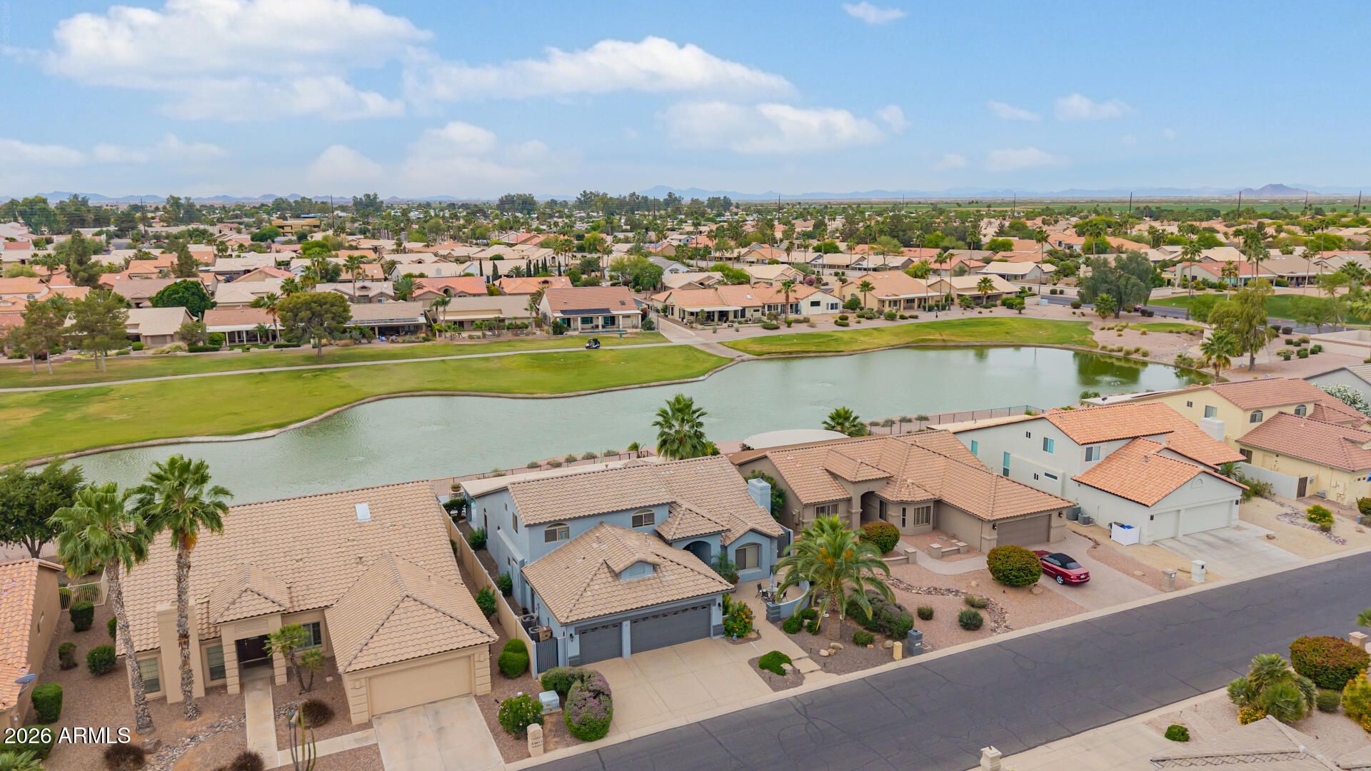 UNBELIEVABLE home in Oakwood w/a rare combination of a 3 CAR GARAGE, HEATED PEBBLE TEC POOL & SPA on a PREMIUM WATERFRONT lot w/ golf VIEWS of hole #7 of the LAKES course. Highly desirable Marbella floorplan designed for entertaining w/OPEN CONCEPT living, generous gathering spaces, & seamless indoor/outdoor flow. Updated kitchen w/GRANITE COUNTERTOPS, wine fridge, MAPLE CABINETS, BLT-IN ovens + GAS cooktop. Formal living/dining +Den/office has BLT-IN bookcases & desk. POOL& SPA has stacked stone WOK POTS, GAS FIRE PIT, BLT IN BBQ, water & fairway views, and multiple seating areas to maximize Arizona sunsets. Major items include NEWER ROOF w/ transferable warranty, 2024 HVAC & OWNED SOLAR PANELS for efficiency. Includes SOFT WATER + RO SYSTEM. Exceptional lot, layout & AMAZING VIEWS!!!
