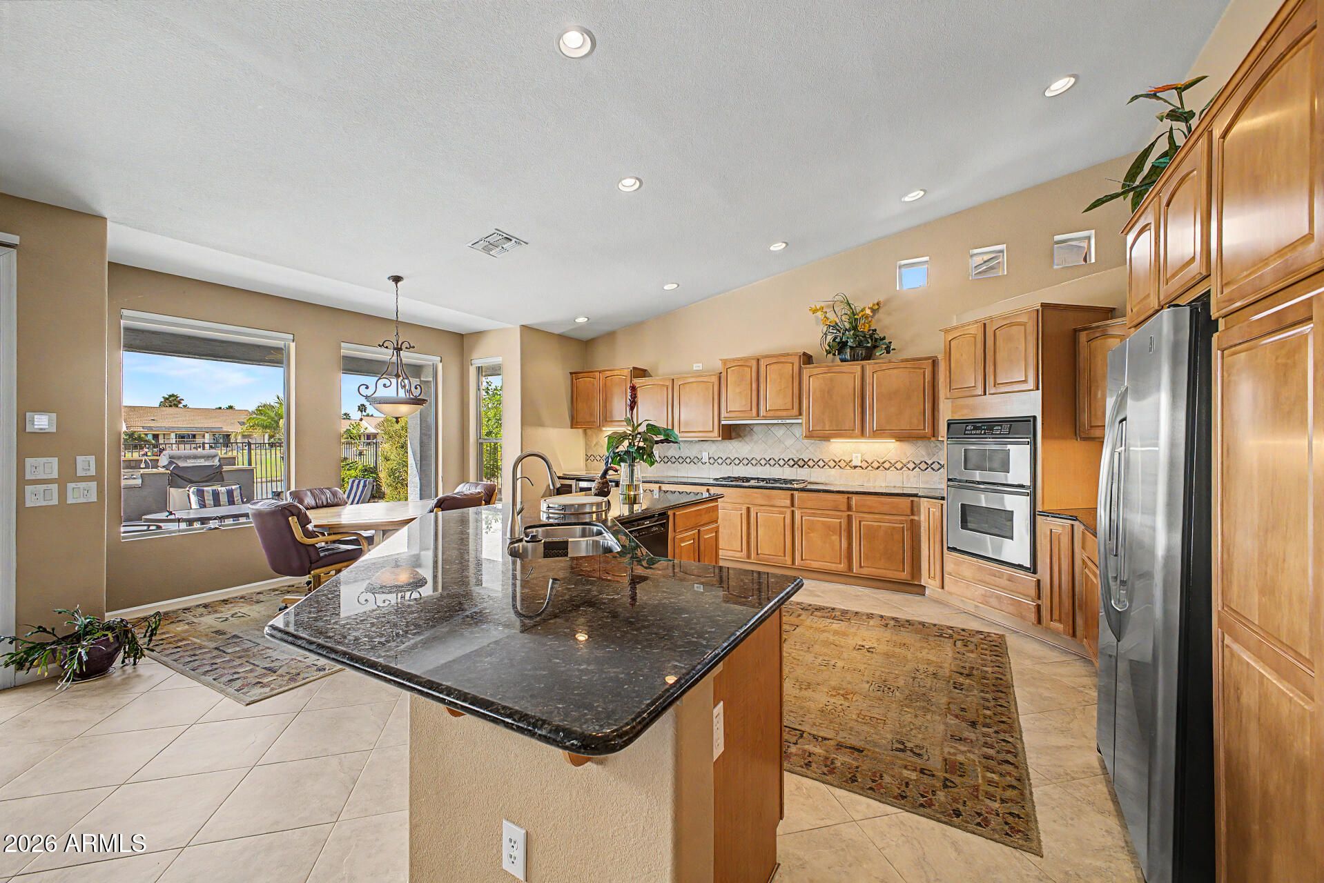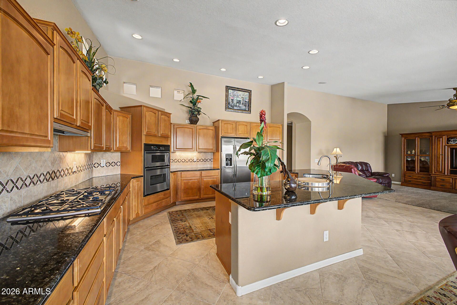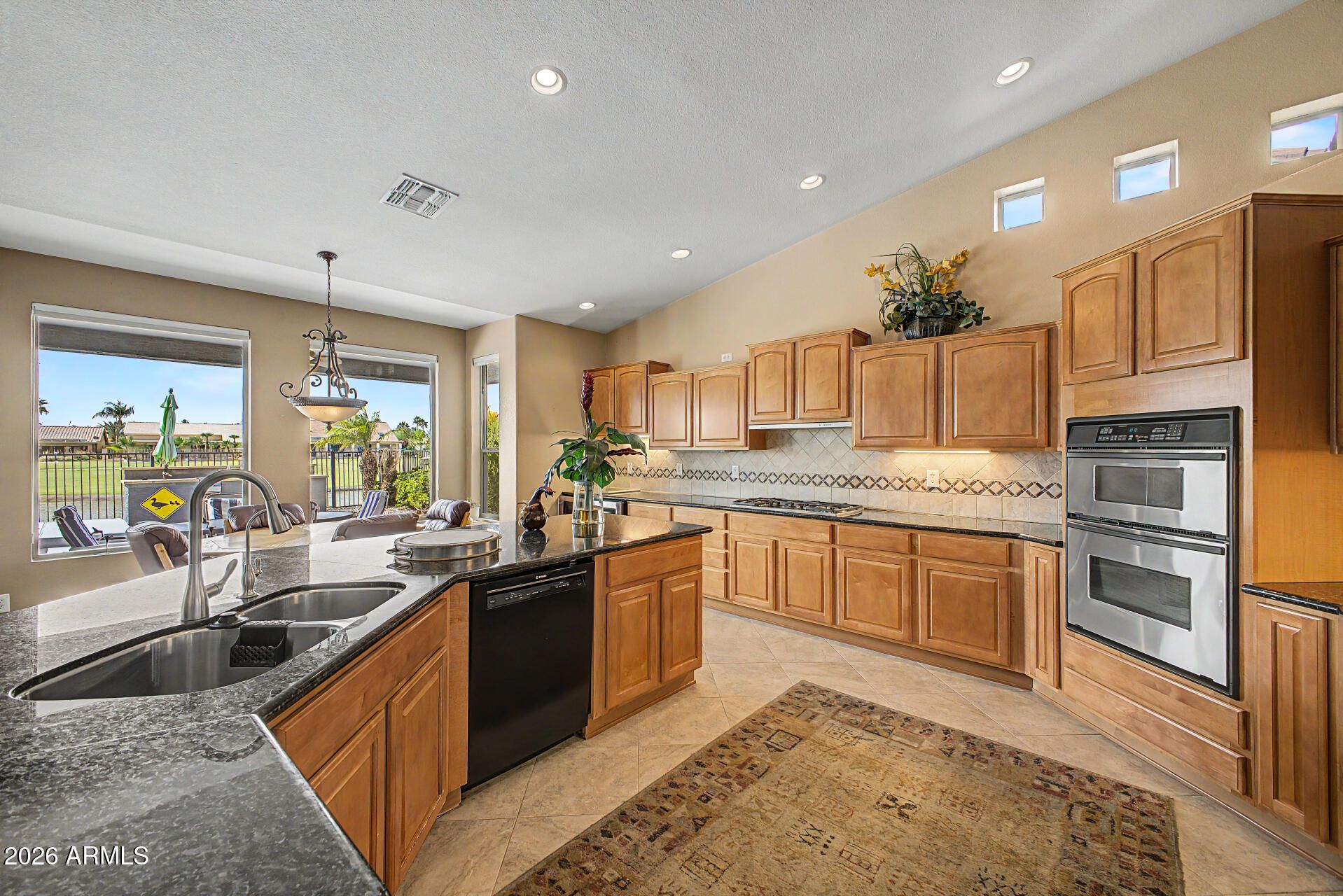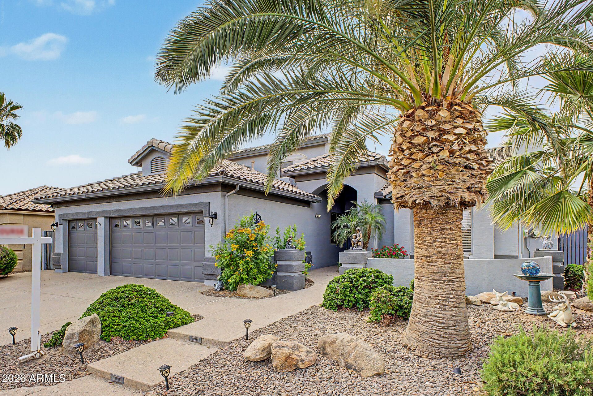 UNBELIEVABLE home in Oakwood w/a rare combination of a 3 CAR GARAGE, HEATED PEBBLE TEC POOL & SPA on a PREMIUM WATERFRONT lot w/ golf VIEWS of hole #7 of the LAKES course. Highly desirable Marbella floorplan designed for entertaining w/OPEN CONCEPT living, generous gathering spaces, & seamless indoor/outdoor flow. Updated kitchen w/GRANITE COUNTERTOPS, wine fridge, MAPLE CABINETS, BLT-IN ovens + GAS cooktop. Formal living/dining +Den/office has BLT-IN bookcases & desk. POOL& SPA has stacked stone WOK POTS, GAS FIRE PIT, BLT IN BBQ, water & fairway views, and multiple seating areas to maximize Arizona sunsets. Major items include NEWER ROOF w/ transferable warranty, 2024 HVAC & OWNED SOLAR PANELS for efficiency. Includes SOFT WATER + RO SYSTEM. Exceptional lot, layout & AMAZING VIEWS!!!