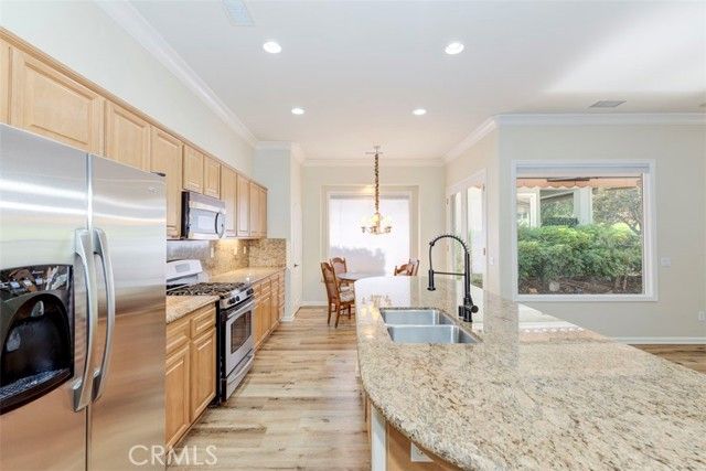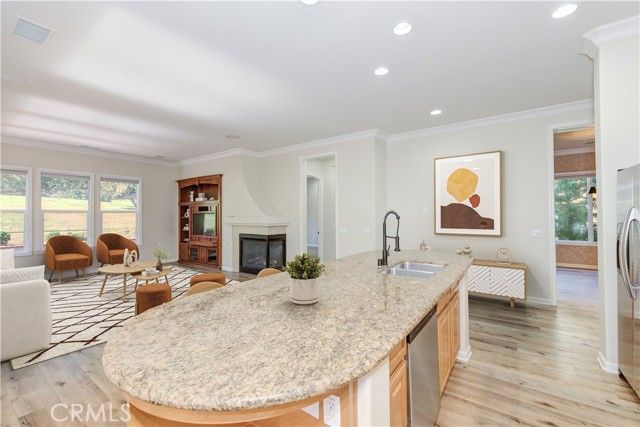 Located on the 8th Fairway with fairway views, this highly desired Shea Home Manzanita model has New Luxury Vinyl Plank flooring and Fresh Interior Paint in gated community of Trilogy. Secluded and privately located through the Coldwater Canyon gates enjoy breathtaking golf course and Cleveland National Forest Mountain views visible from the principal bedroom and living areas. Built in 2004, this home boasts 10-foot ceilings with 8” Crown Moulding, creating an impressive atmosphere perfect for casual entertaining. Custom doors and a wood paneled archway with new modern hardware have recently been installed. New plumbing fixtures and fresh paint make this home Ready to Move in! The expansive outward-facing kitchen with pull out kitchen drawers and an oversized breakfast bar & wine bottle storage w/cabinets that opens to the great room makes it ideal for gatherings. Whether hosting formal dinners in the elegant separate dining room or enjoying a cozy meal in the kitchen nook, this home is designed for both relaxation and entertainment. A custom wood built-in media niche and cabinets complete the great room with in ceiling surround speakers, 50” Sony flatscreen and cozy corner fireplace. The striking formal dining room offers extra space for larger gatherings, while the en-suite guest suite ensures privacy and comfort for your visitors. The primary suite includes a spacious walk-in closet w/ custom organizers & access to sit down golf course views and it’s own patio off the primary bedroom—perfect for enjoying your morning coffee or evening drink. Wrap around full size electric retractable awnings ensure comfort and privacy all year around. Two covered patios offer ample space for dining al fresco. Enjoy natural light from large premium dual-pane windows & privacy from neighbors with a wrought iron front gate. A shade tree lined street greets you at the top of the hill location. Low-maintenance design includes a concrete-tiled roof, stucco exterior & polished stamped colored concrete. Recent upgrades include a new water heater, New Amana HVAC system, smart thermostat & custom window coverings. The 4,792 square-foot premium Shea lot also includes stainless steel appliances, water softener, overhead storage in garage, whole house fan, new garage door opener, gas BBQ outlet & more. Located between Temecula Wine Country & Orange County, Trilogy offers exceptional 55+ living with amenities like a fitness center, indoor/outdoor pools, tennis & Activities/Clubs.