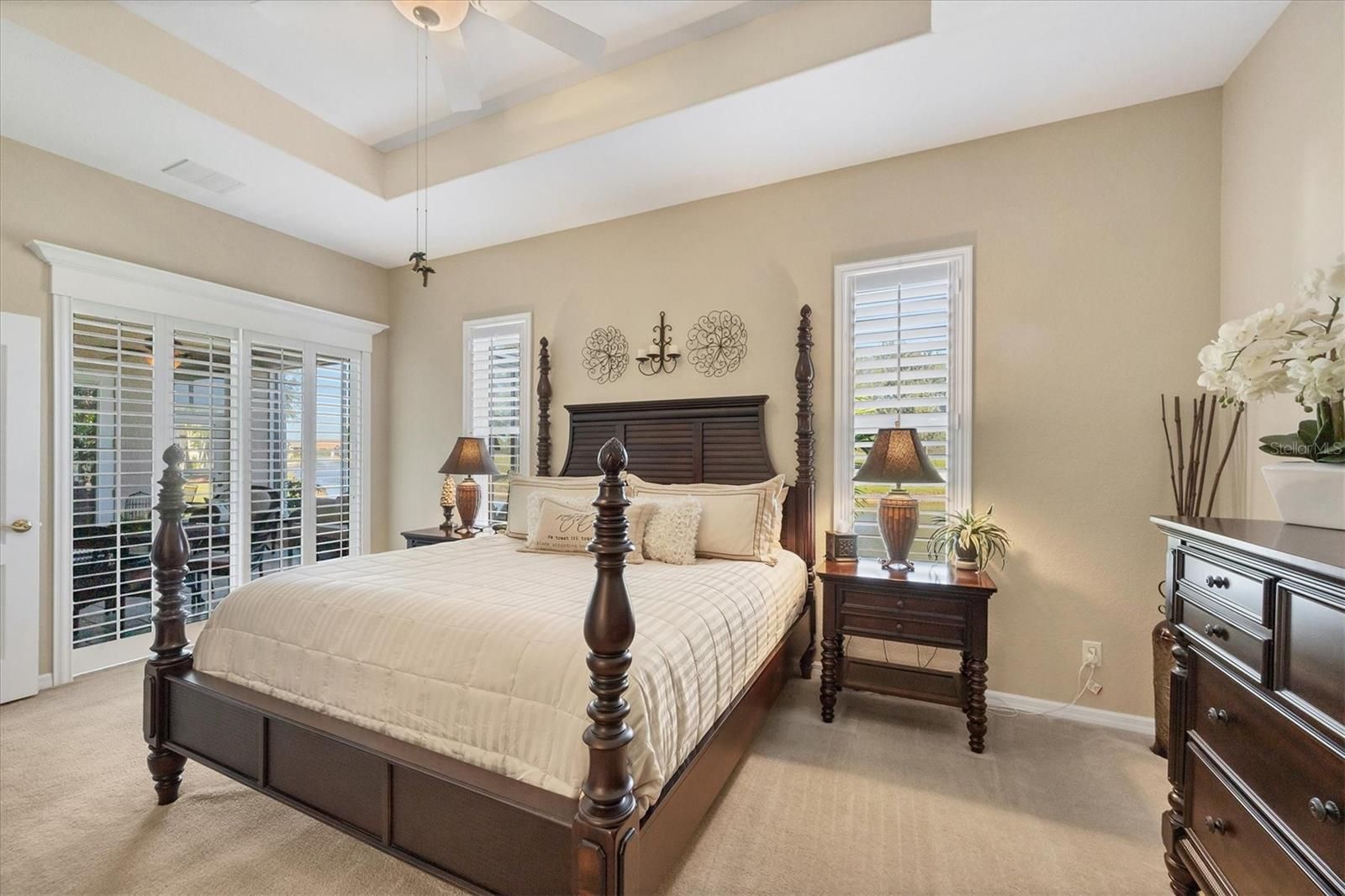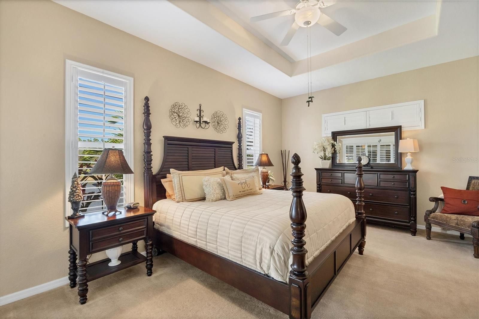- Ceiling Fan(s), Coffered Ceiling(s), High Ceilings, Kitchen/Family Room Combo, Main Level Primary, Solid Surface Counters, Thermostat, Window Treatments