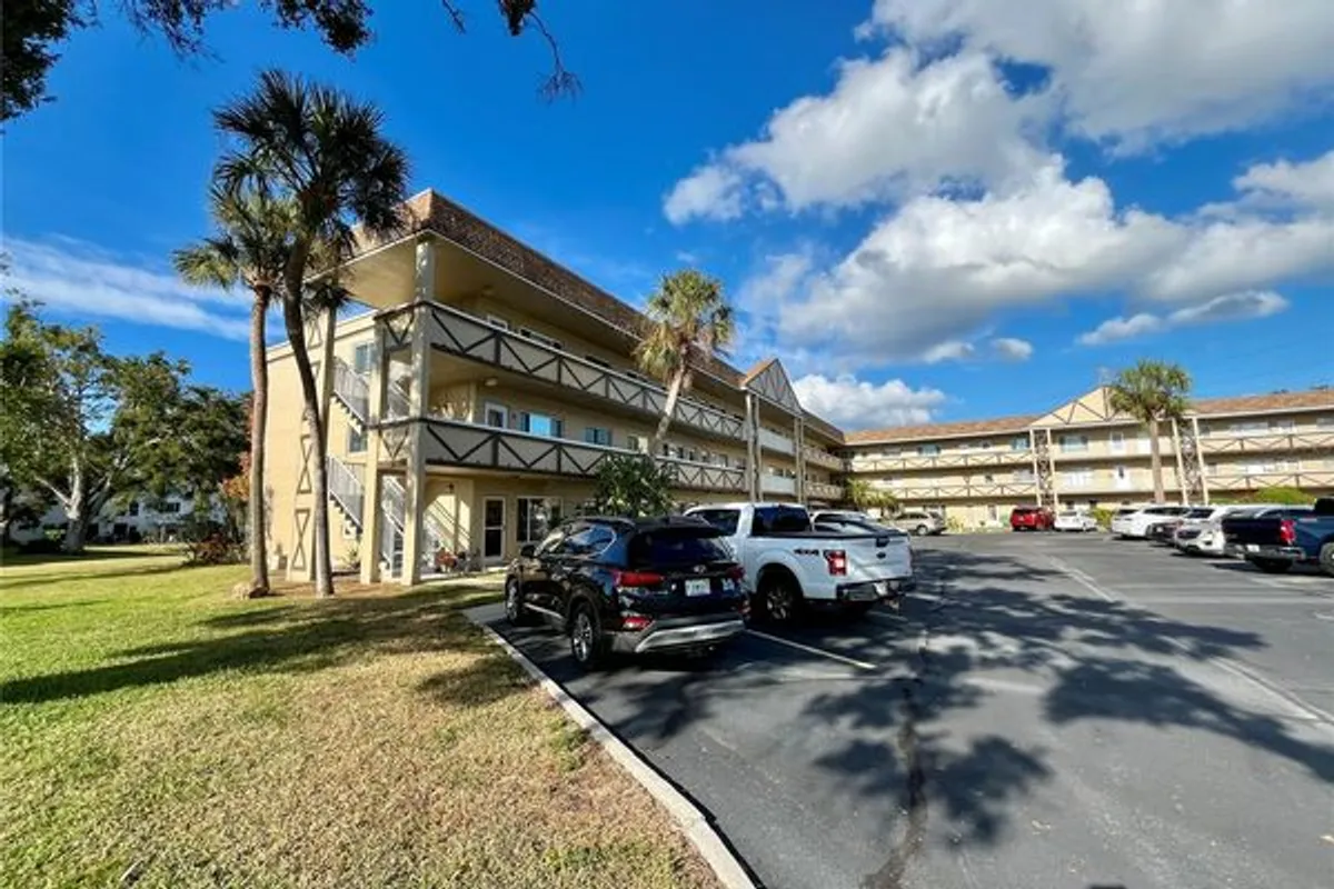Welcome to carefree Florida living in this well maintained top-floor 2-bedroom, 1-bath condo, nestled within a desirable fee simple 55+ community. Step into a bright, spacious interior featuring laminate flooring throughout and walking distance to Community center. The unit includes access to a separate storage room, great for storing seasonal items. Bike storage on ground floor. Easy access to laundry room.Assigned parking. The 55+ community has two activity centers, and two private golf courses with 9 and 18 holes, free exclusively for resident owners. There are two heated swimming pools. The remodeled Cardio Gym has the latest exercise equipment. A very pet-friendly community, there is a fenced dog park with covered seating. There are hobby studios, and a wood shop for the exclusive use of the residents. Activities include fitness classes, dancing, clubs, cards, billiards, entertainment, classes, and much more. The on-site Good Karma Café has take & bake meals and snacks. Close to beaches, transportation, shopping, entertainment, and fine dining. All room sizes, floor plans and square footage are approximate. Association approval is required. If financing, a 35% down payment is required.